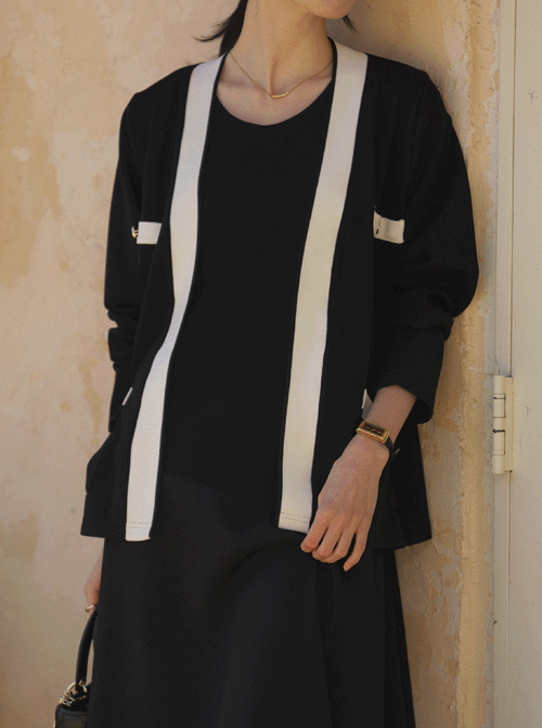 테타셀 배색 가디건 _ 블랙