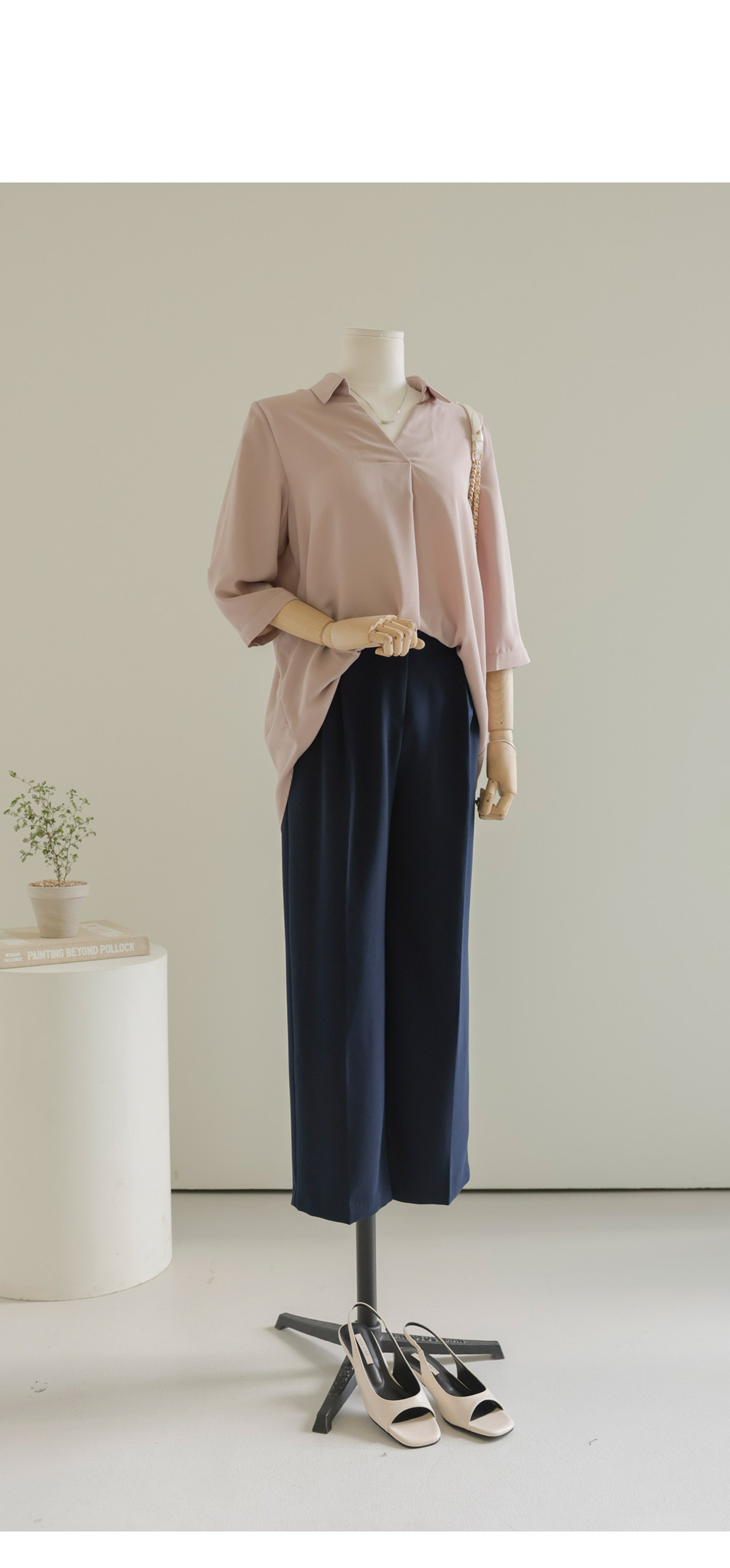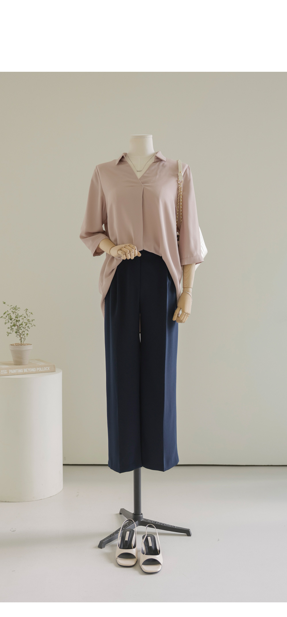A:은은한 광택과 핀턱의 볼륨감이 주는 우아함 덕분에 슬랙스와 매치하면 완벽한 하객룩이 된답니다.