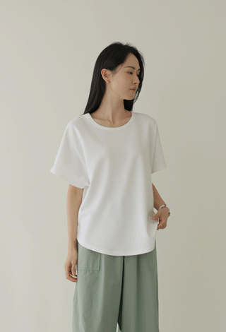 폴리 비중이 높아 몸에 감기지 않고 시원하게 툭 떨어지는 실루엣을 유지해 주며, 일반적인 티셔츠보다 훨씬 높은 8%의 스판 함유량 덕분에 상하좌우 어떤 방향으로 움직여도 당김 없이 유연하게 늘어난답니다.