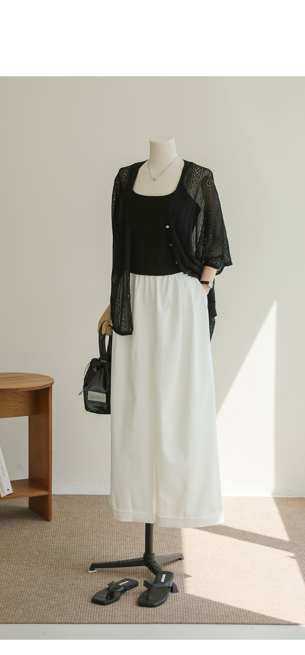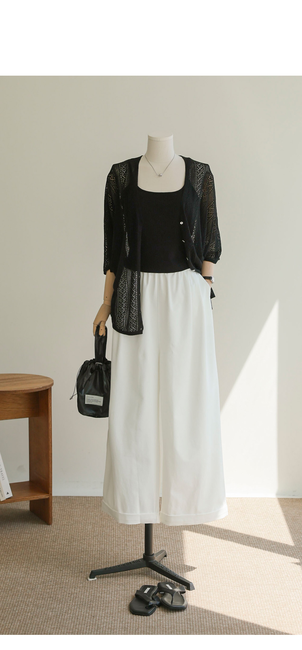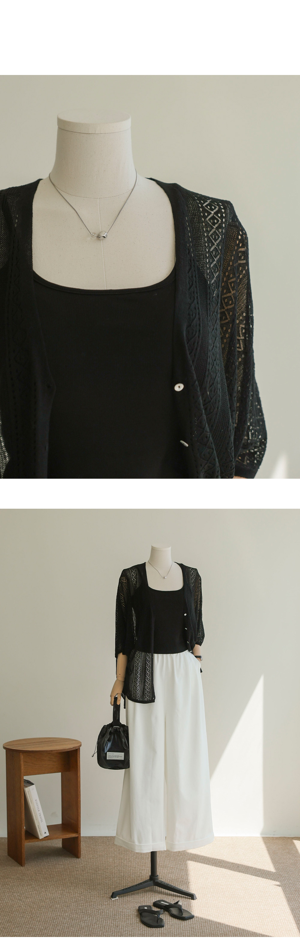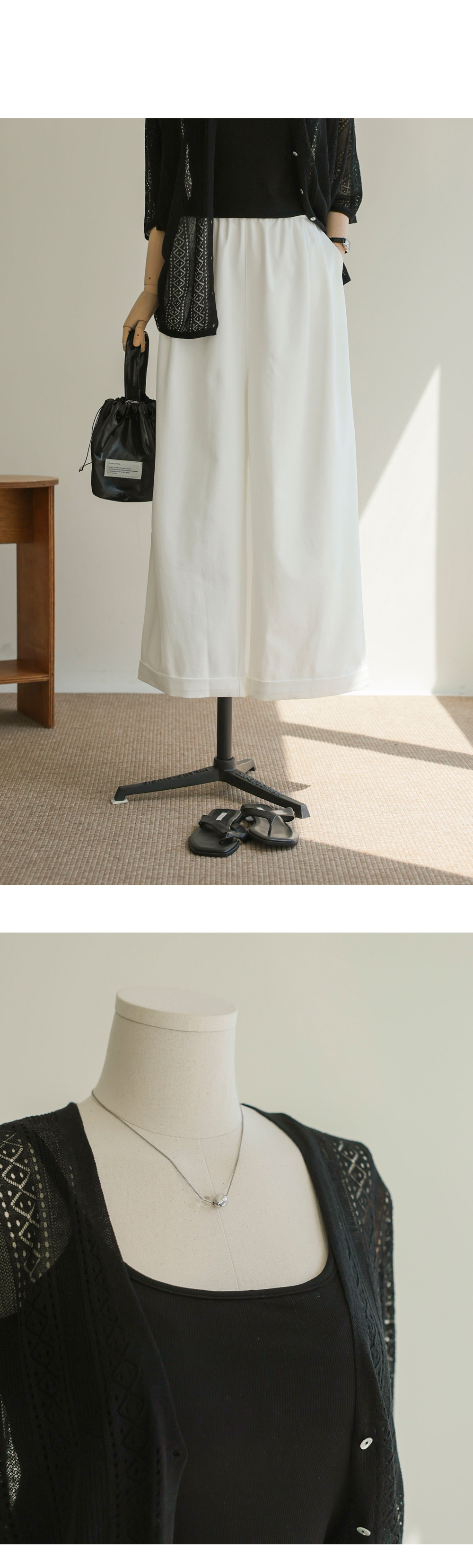 비스코스와 텐셀, 아마 소재가 조화롭게 어우러져 피부에 닿는 촉감이 놀라울 정도로 부드러워요. 니트 특유의 까슬함 없이 매끄럽게 흐르는 드레이프성이 일품이며, 아마 소재 특유의 쾌적함이 더해져 한여름에도 끈적임 없이 착용하실 수 있어요. 얇지만 탄탄한 짜임으로 제작되어 쉽게 변형되지 않으면서도 몸을 타고 흐르는 실루엣이 고급스러워 품격 있는 룩을 완성해 줍니다.