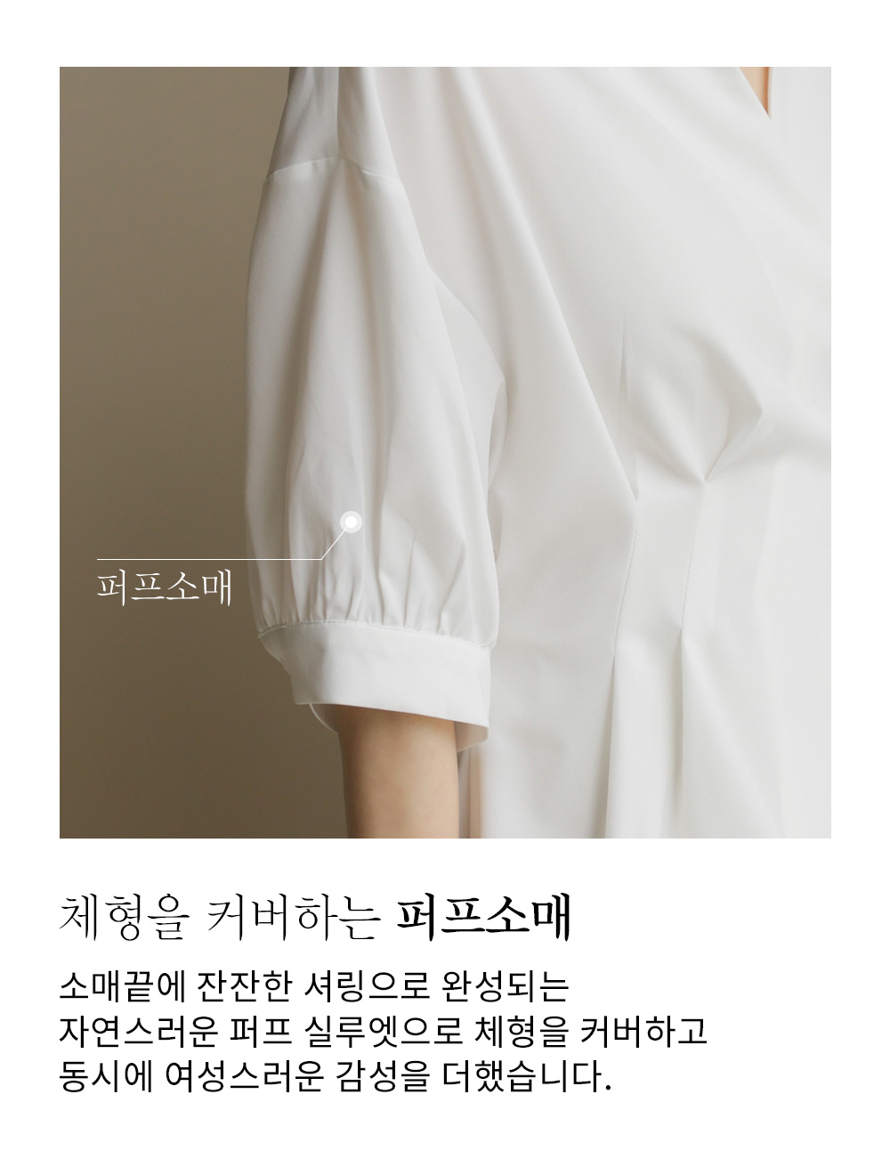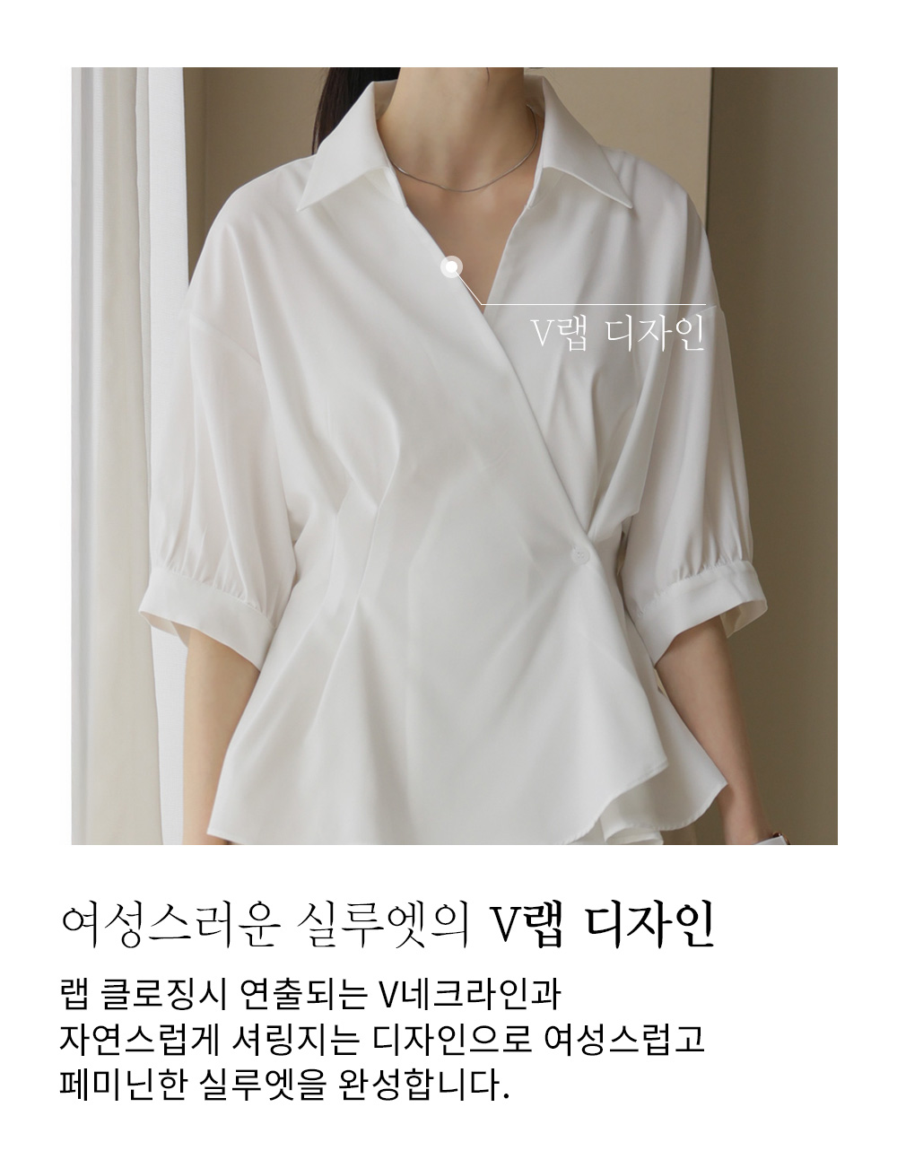 세련된 카라 디테일과 이어지는 V넥 라인은 목선을 더 가늘고 길어 보이게 연출하며, 소매 끝단의 퍼프 포인트가 전체적인 룩에 부드러운 볼륨감을 더해 세련된 여성미를 완성해 줘요.