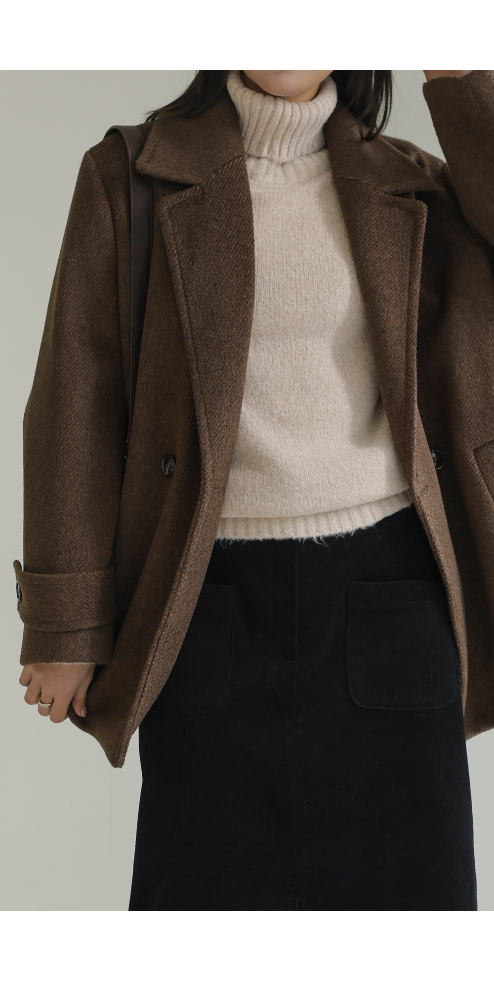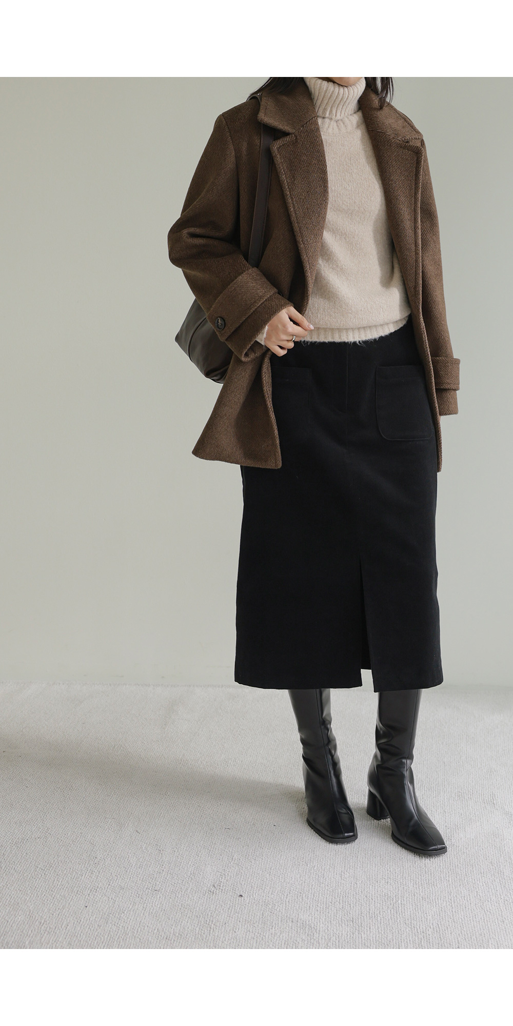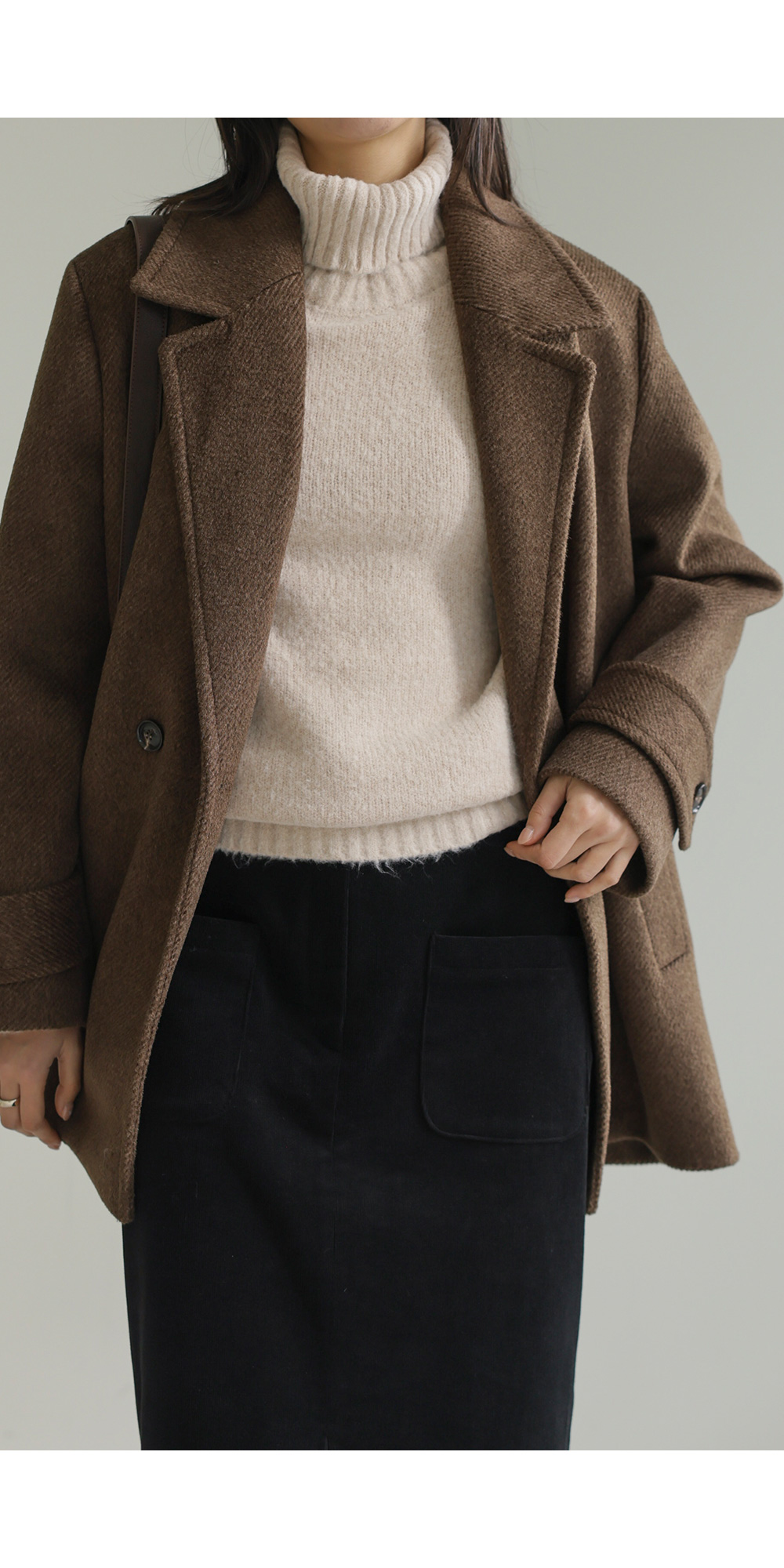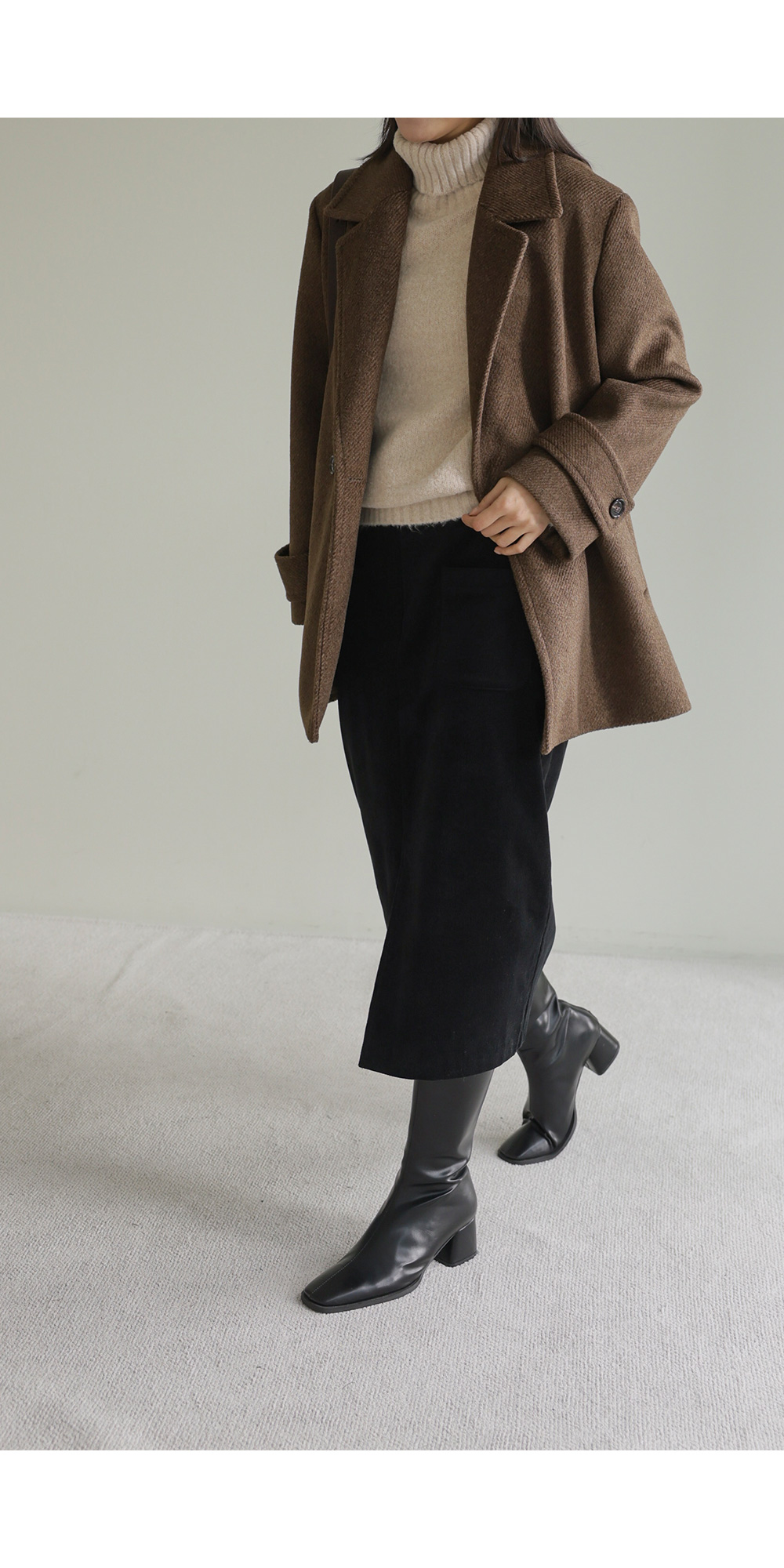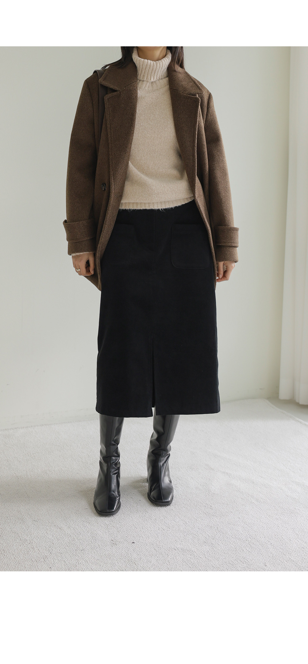 모델정보 키 167cm / 상의 55 / 하의 26(S) / 신발 240mm코디정보 카터추 하프 코트 _ 브라운젤로파 폴라 니트 _ 베이지 모리스 골덴 스커트 _ 블랙