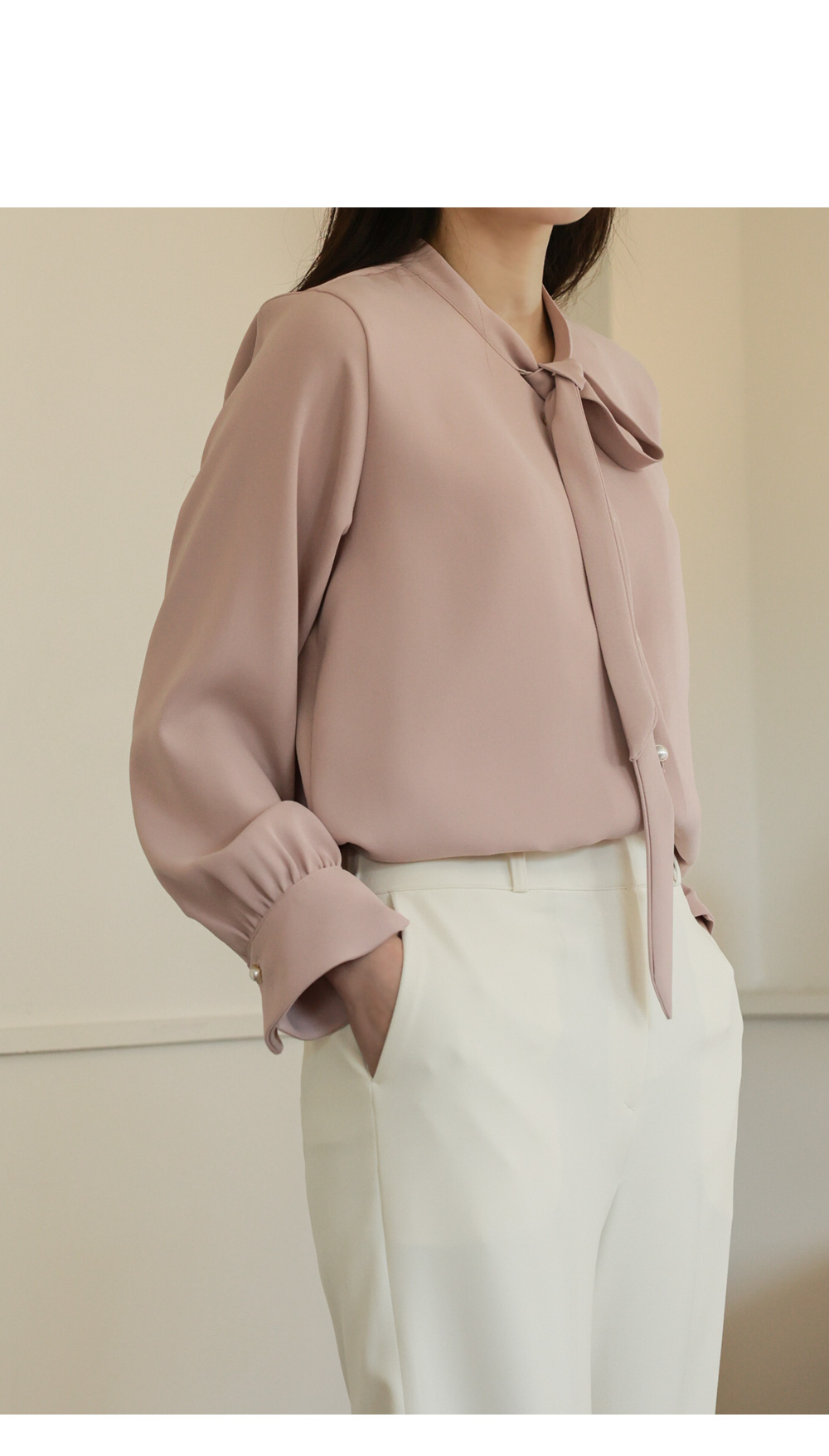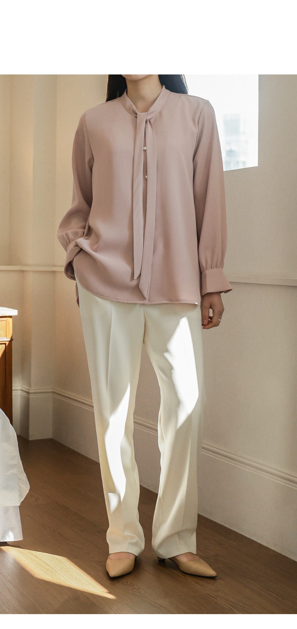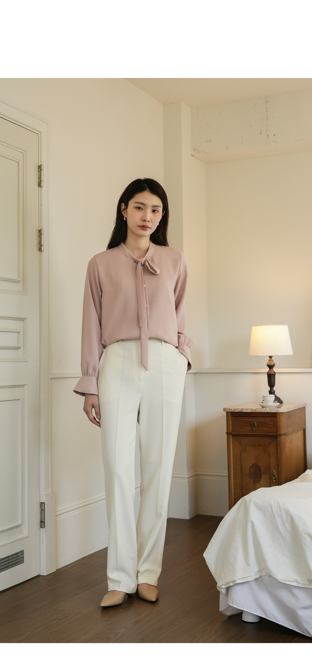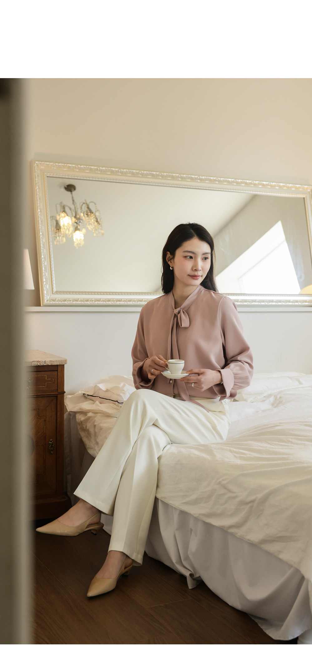 모델정보 키 172cm / 상의 55 / 하의 27(M) / 신발 240mm코디정보 기수니 리본 블라우스 _ 핑크코각피 슬림일자 롱팬츠 _ 아이보리