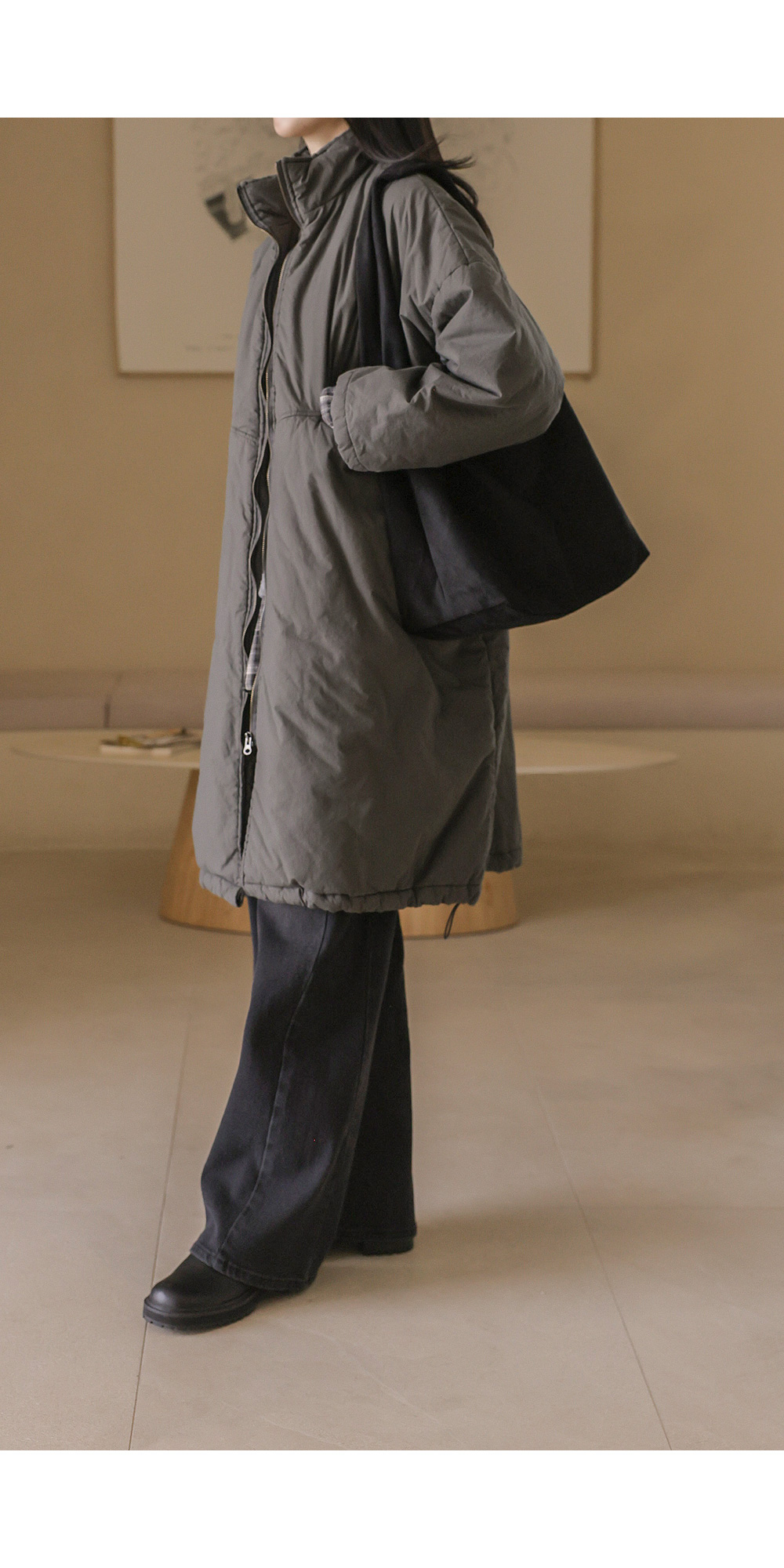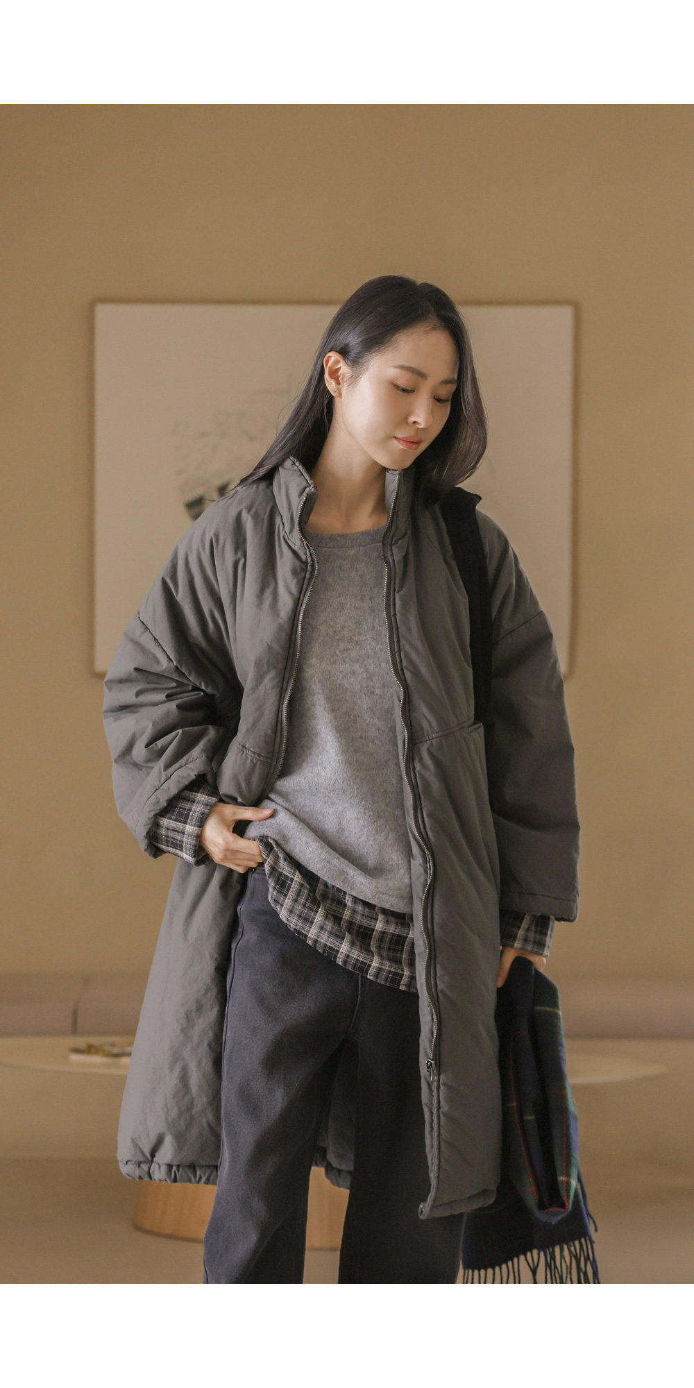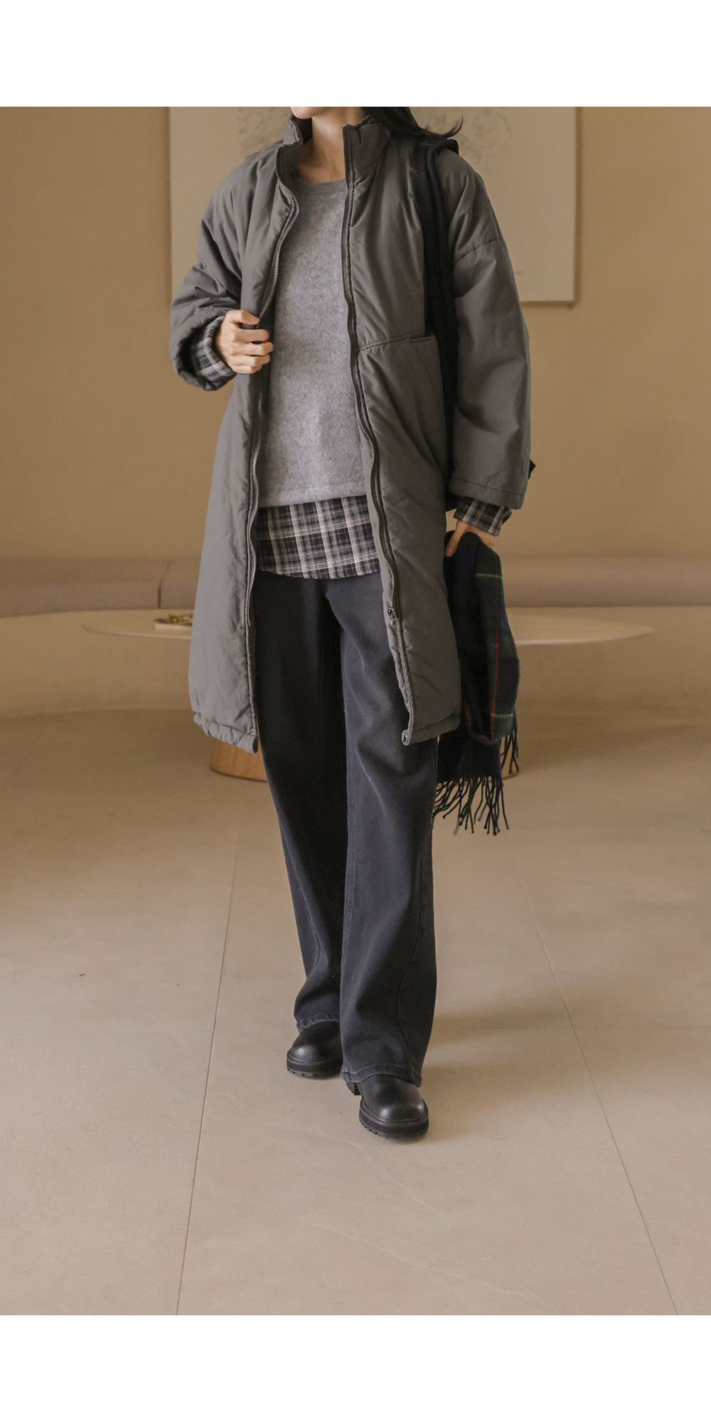 코디정보 트찰린 점퍼 _ 베이지코라스 머플러 울세트 _ 차콜 카피오 여유일자 롱팬츠 _ 크림