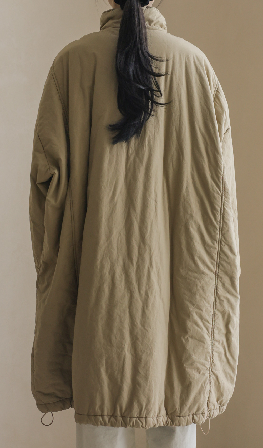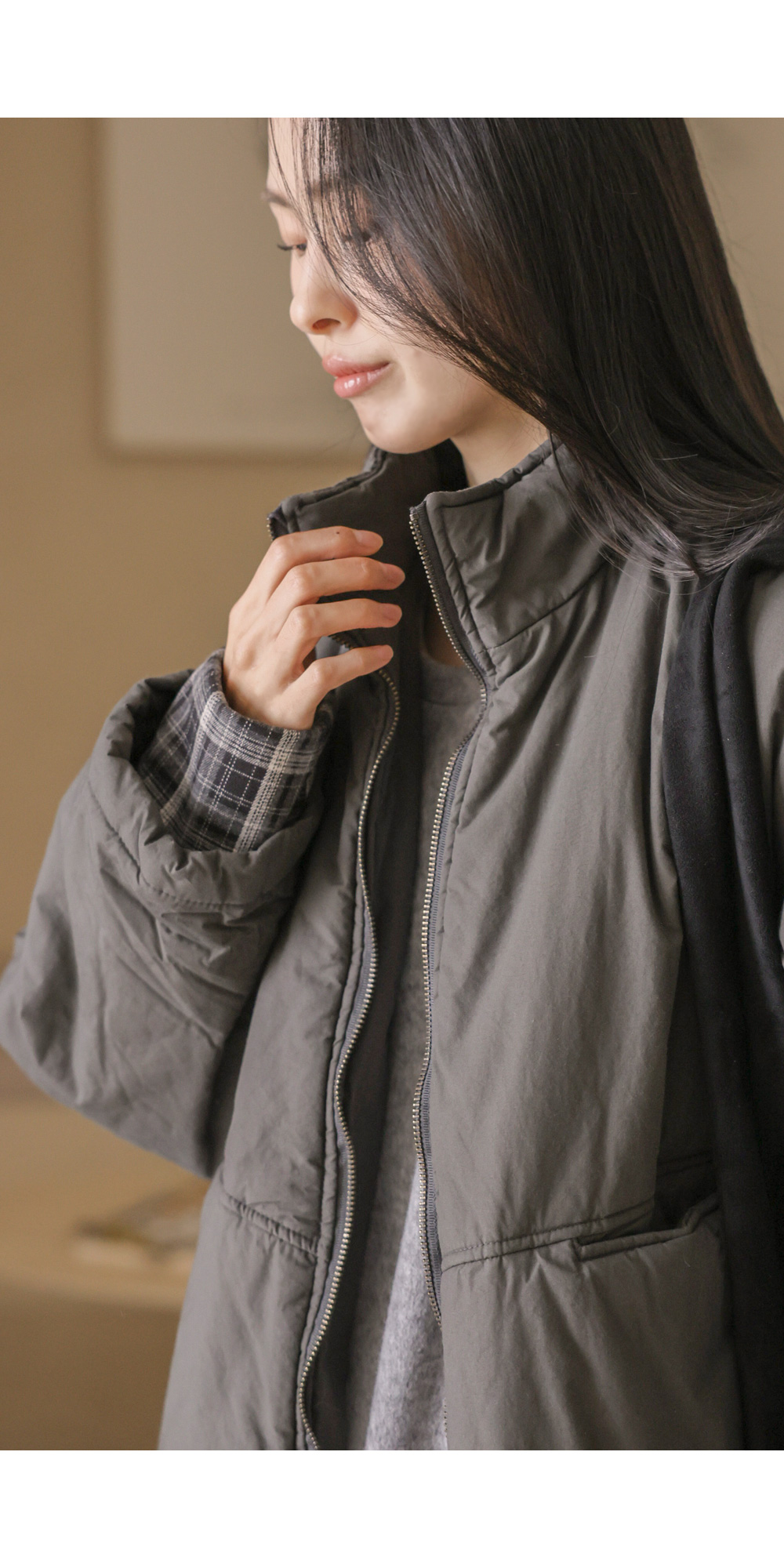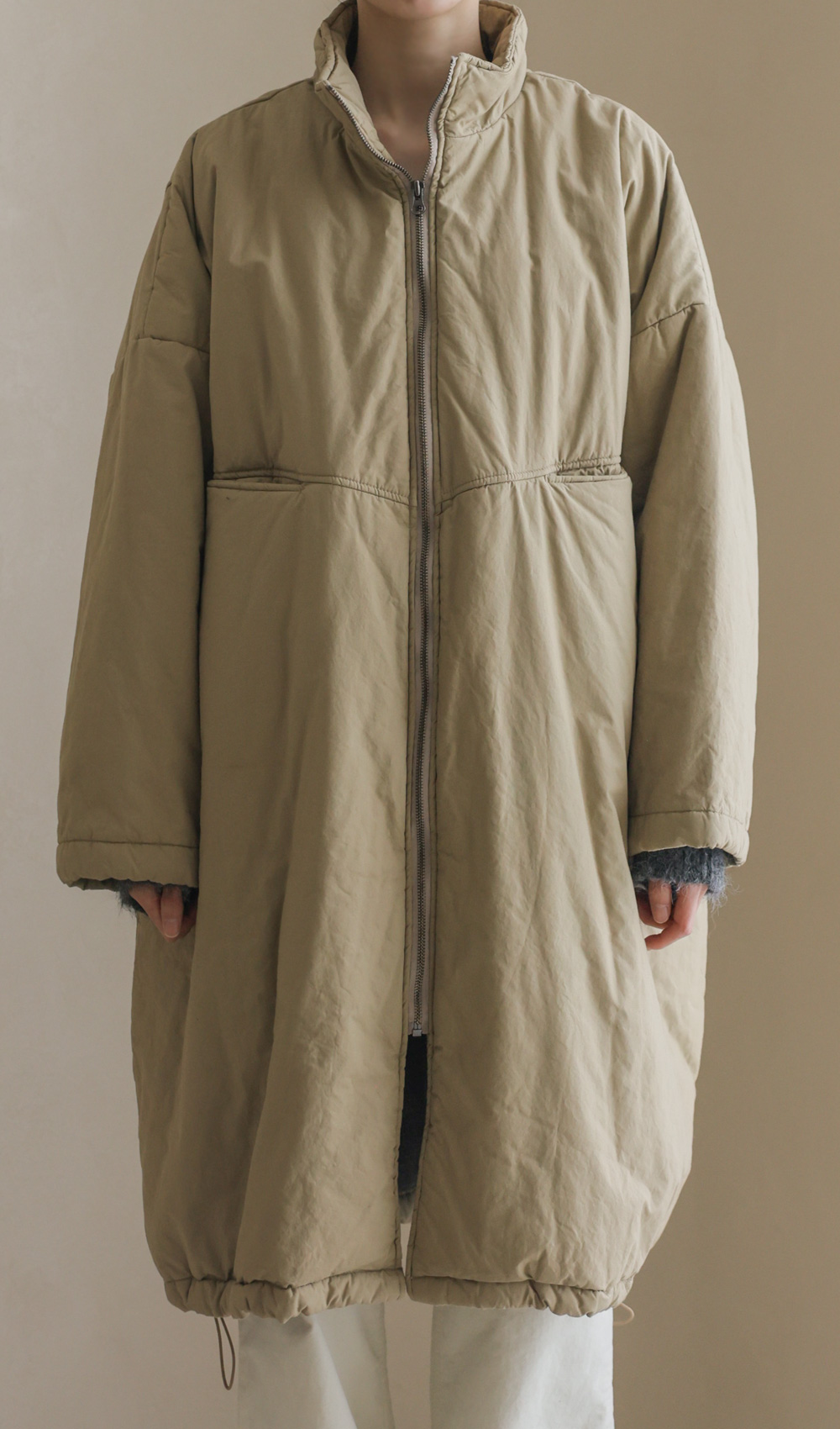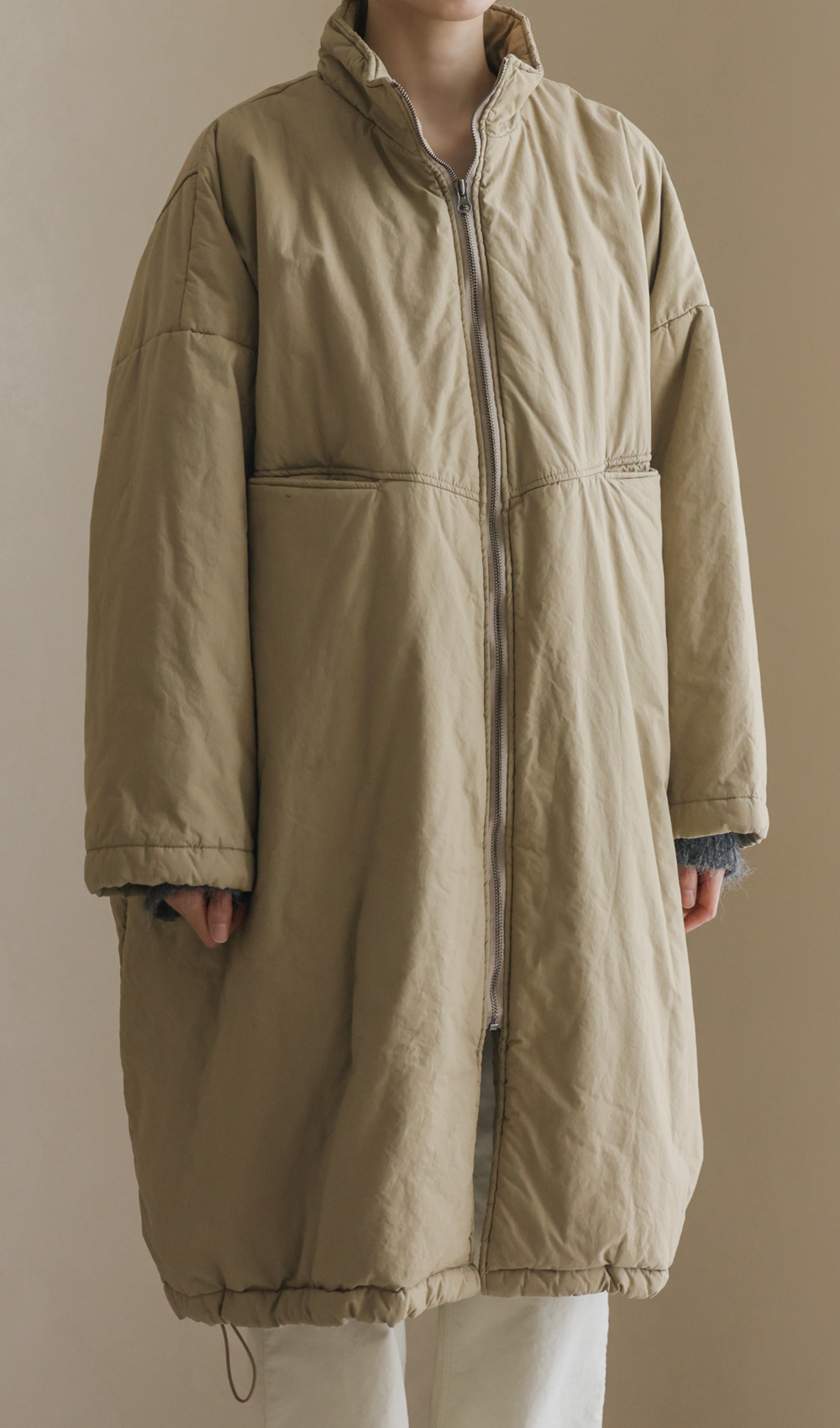 코디정보 트찰린 점퍼 _ 베이지코라스 머플러 울세트 _ 차콜 카피오 여유일자 롱팬츠 _ 크림