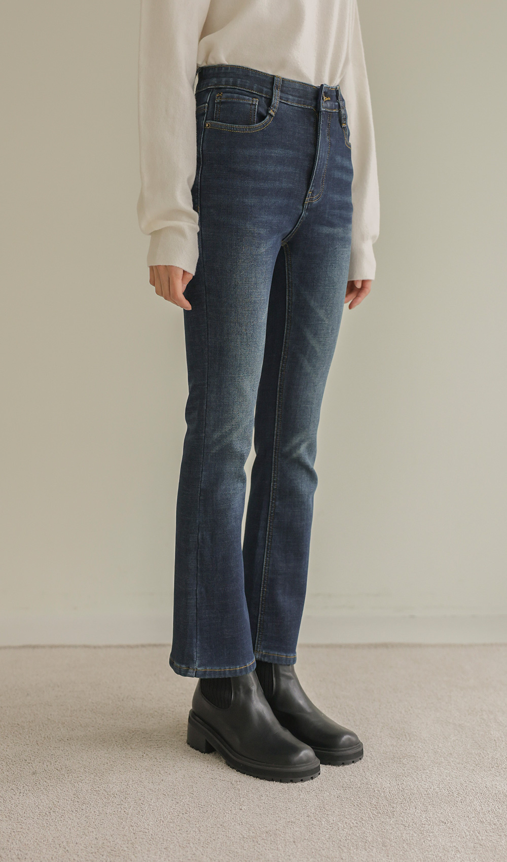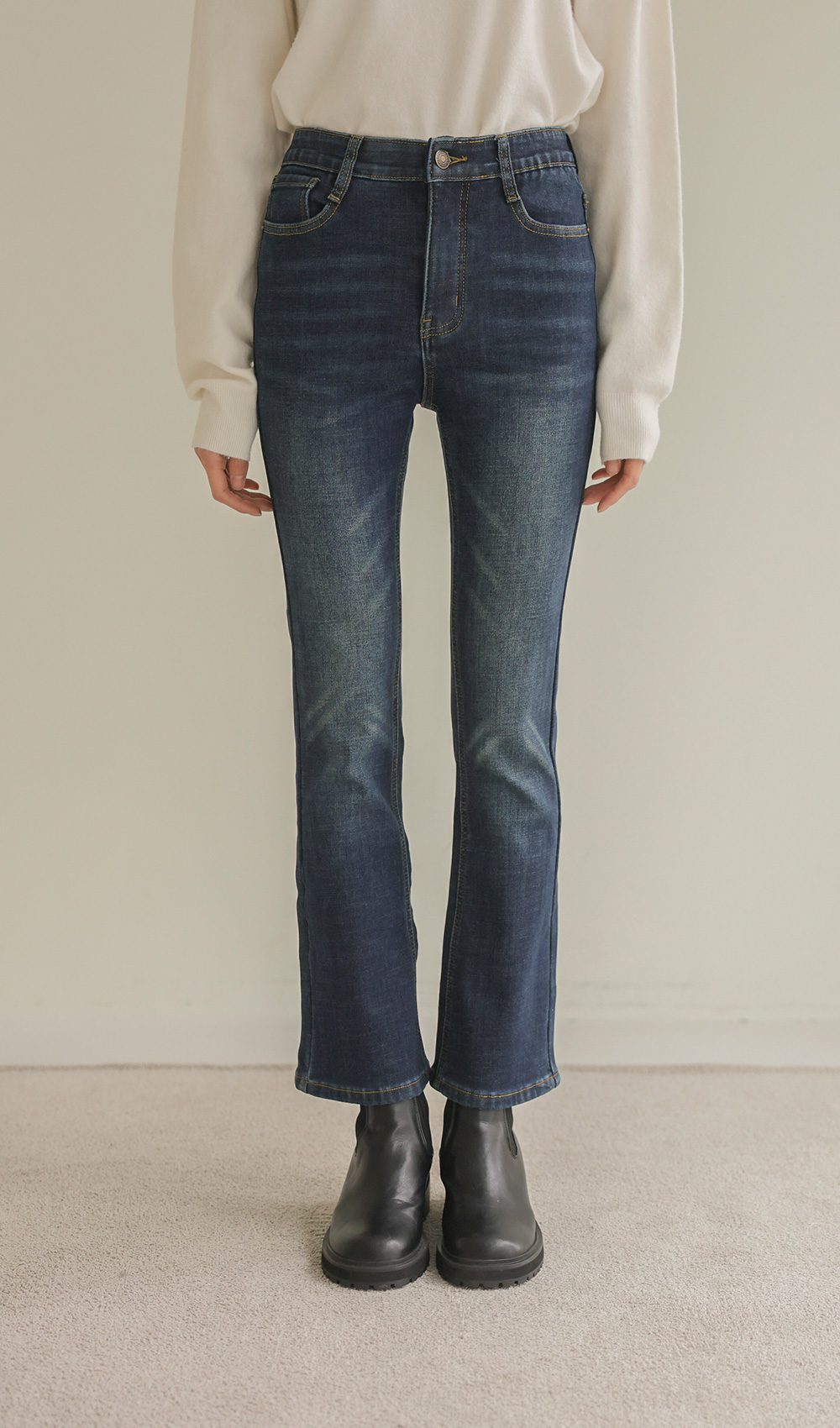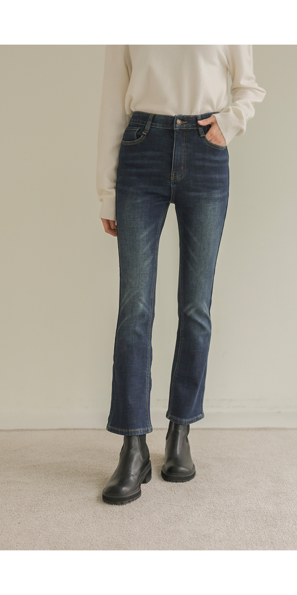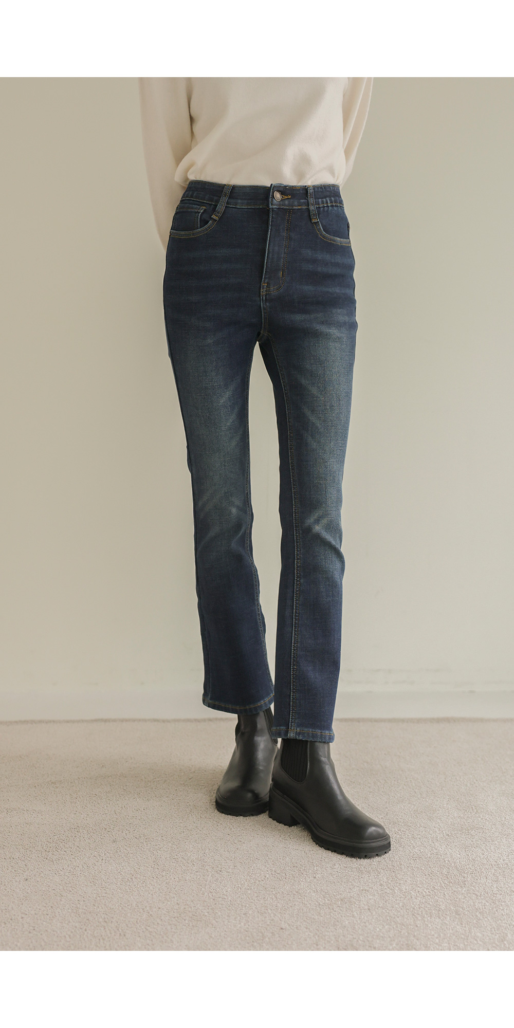 코디정보 피쿠타 퍼자켓 _ 아이보리사서나 슬림부츠컷 팬츠 _ 데님