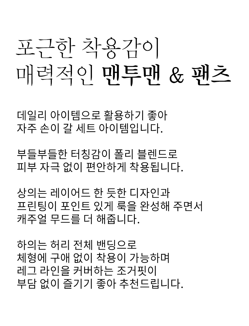 안감 없음   /    비침 없음   /    신축성 약간(상의),좋음(하의)