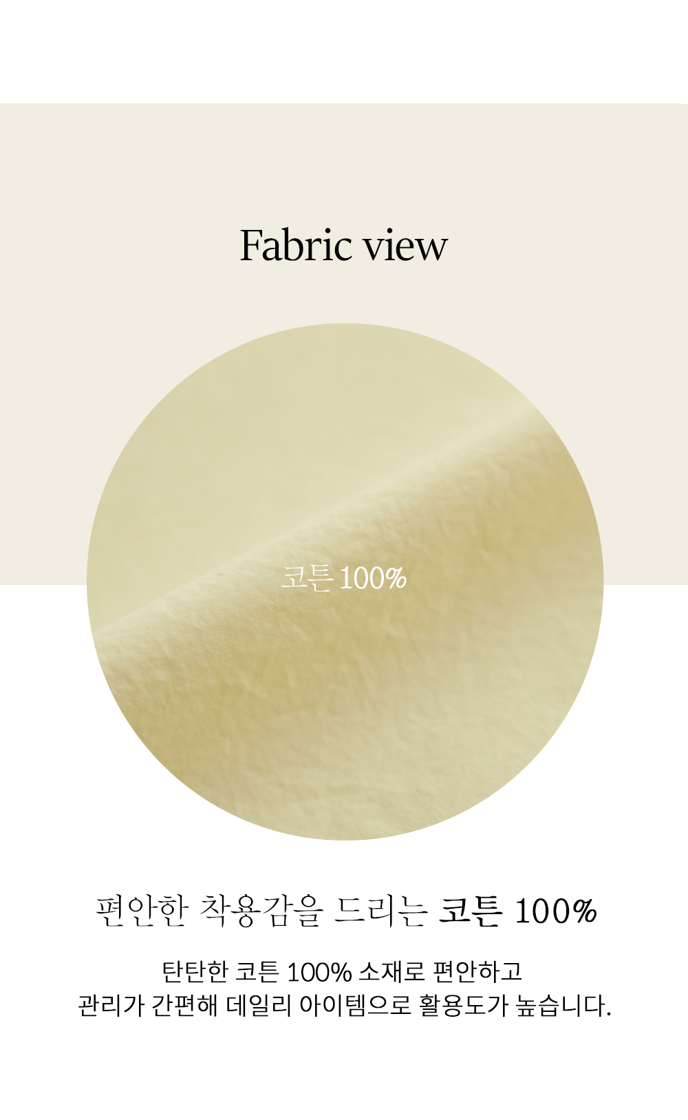 매끈한 터칭감이 일품인 탄탄한 고밀도 코튼 소재를 사용했어요. 얇고 가벼운 무게감 덕분에 장시간 착용해도 피로감이 없으며, 살결에 닿을 때마다 느껴지는 산뜻한 촉감이 매력적이구요. 소재의 힘이 있어 쉽게 변형되지 않아 오랫동안 깔끔한 컨디션으로 착용하실 수 있답니다. ![]() MD가 답하는 안심 Q&A