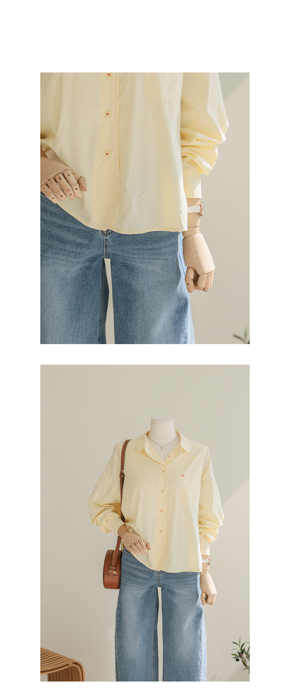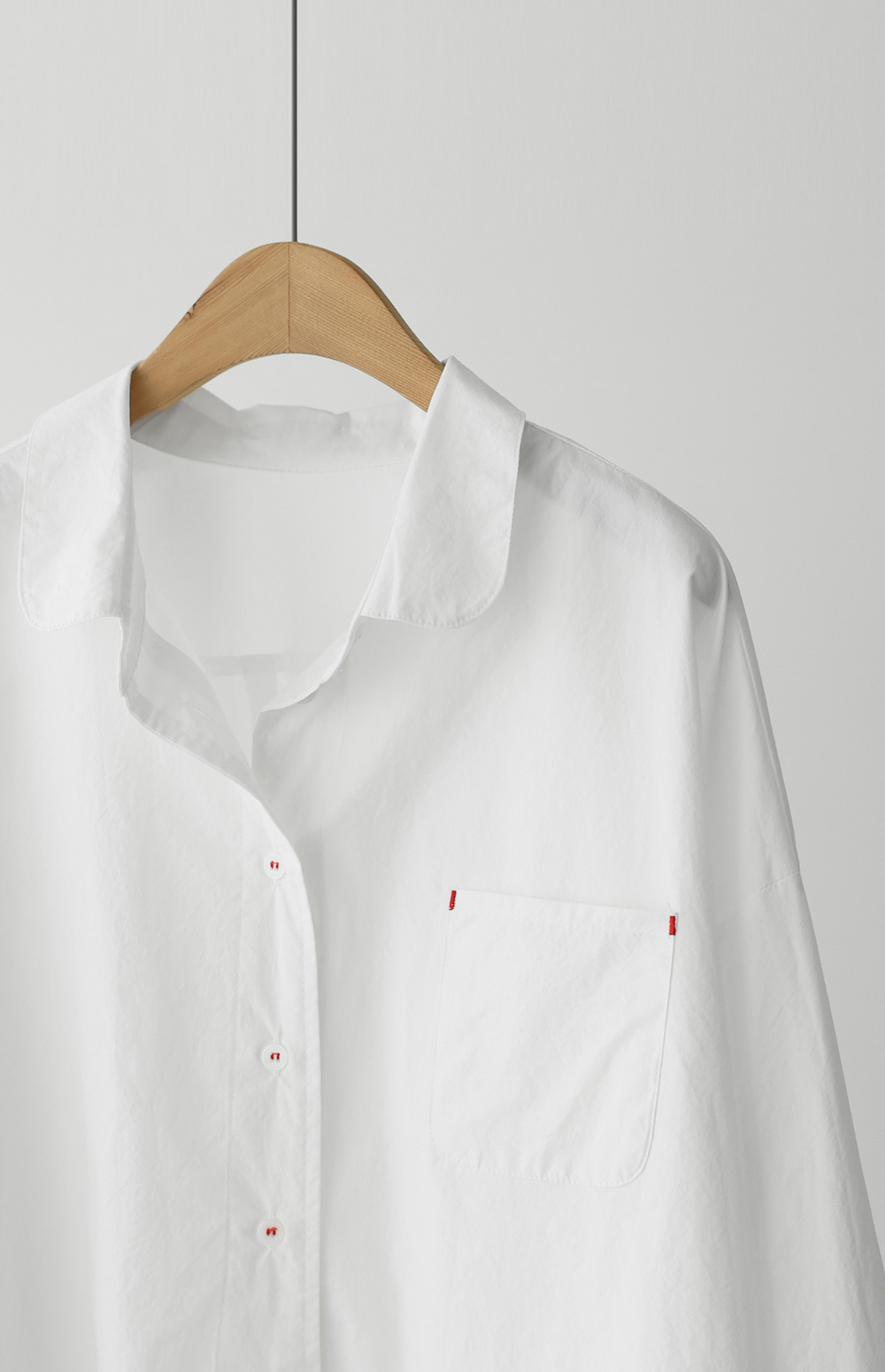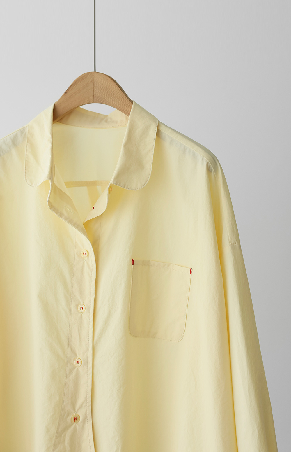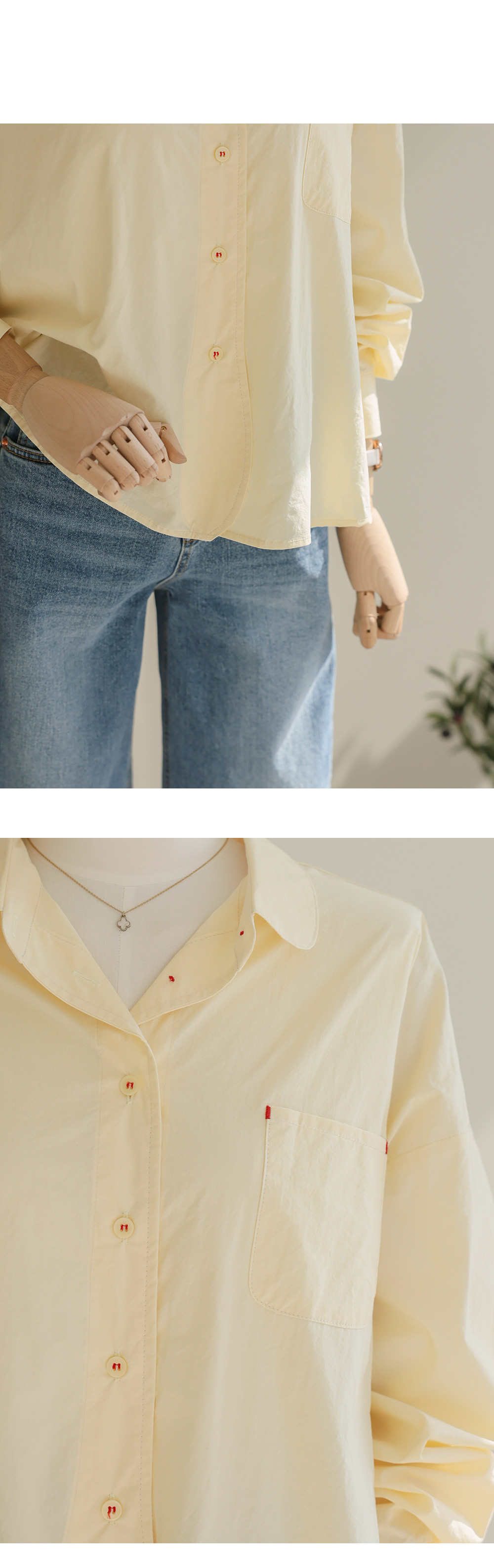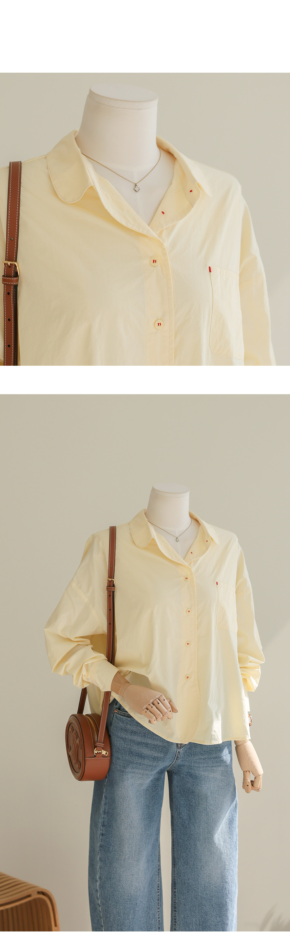 단정한 실루엣에 은은한 디테일을 가득 담아낸 셔츠 아이템이에요. 전체적으로 여유 있게 떨어지는 핏에 둥근 카라 디자인을 더해 한층 부드럽고 이미지를 연출해 주구요, 바스트의 원 포켓과 단추에 들어간 배색 스티치가 밋밋함 없이 세련된 포인트를 완성해 준답니다.