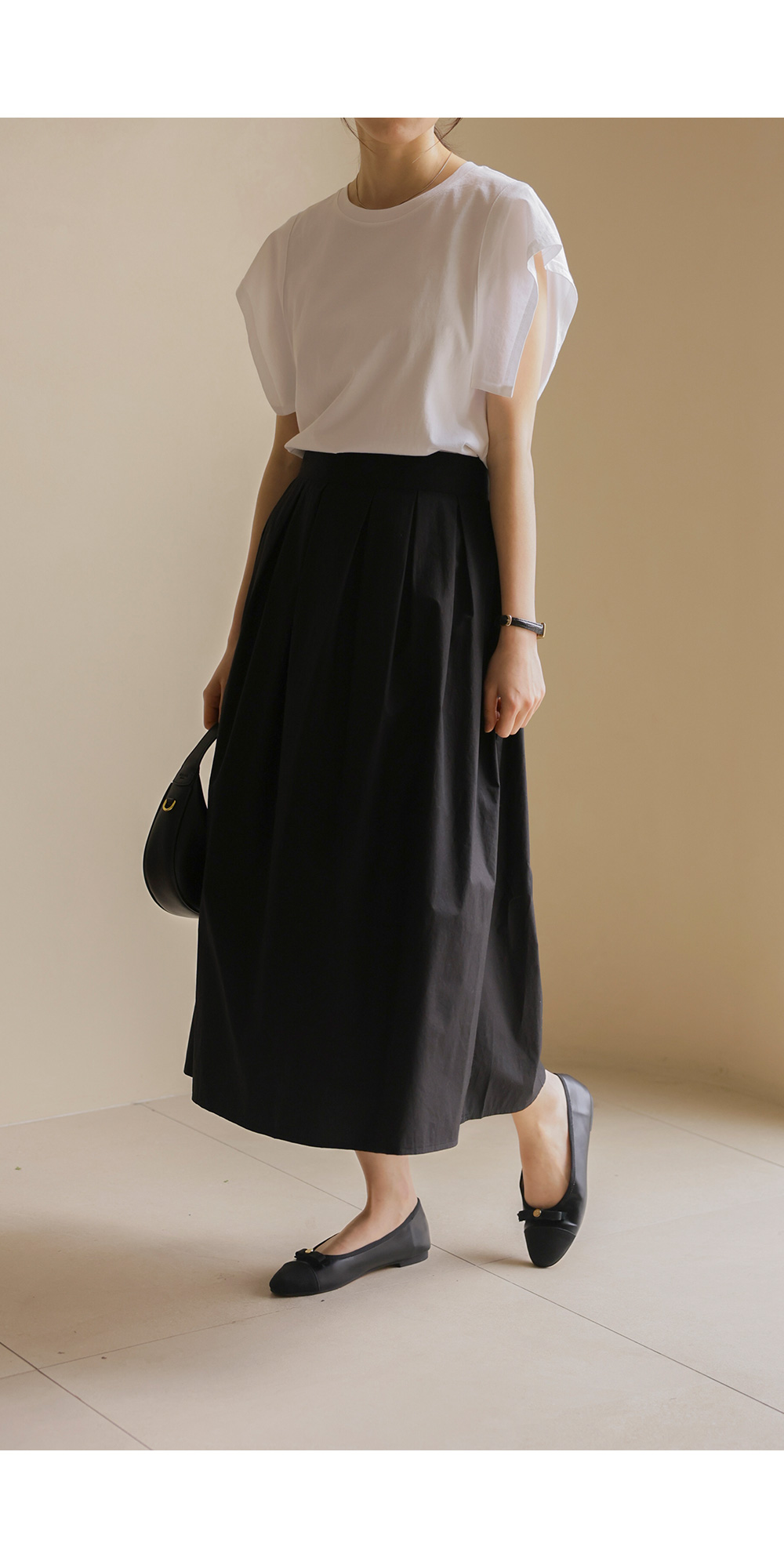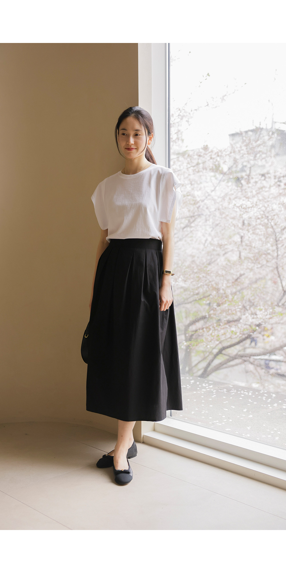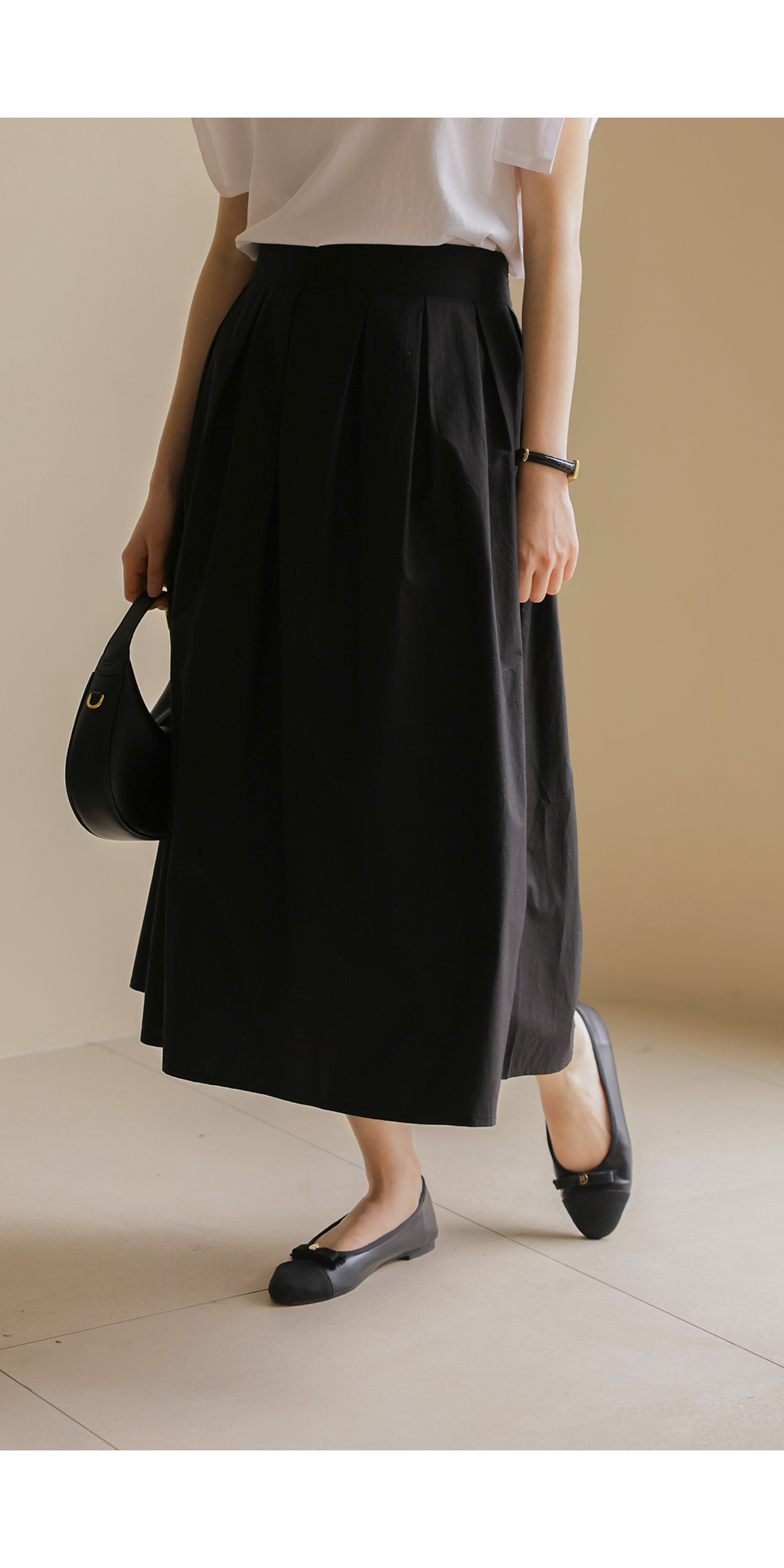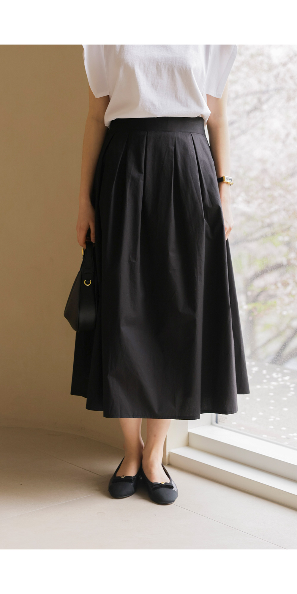 스커트 카테고리에서 은은한 비침이 주는 시원함과 핀턱의 클래식함을 동시에 잡은 롱 스커트예요. 신축성이 없는 탄탄한 코튼 원단을 사용하여 입었을 때 실루엣이 무너지지 않고 고급스럽게 유지되구요. 가벼운 두께감 덕분에 걸을 때마다 살랑이는 느낌이 정말 매력적인 아이템이랍니다.