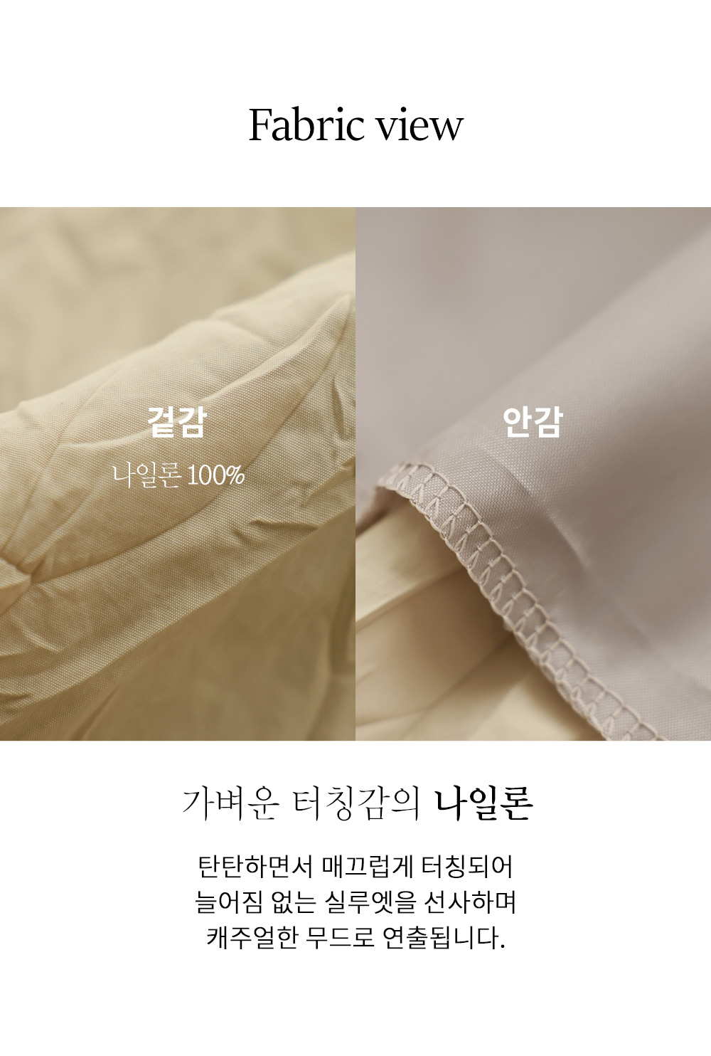 나일론 특유의 바스락거리는 텍스처가 살아있어 피부에 닿는 느낌이 아주 산뜻해요. 은은한 링클 텍스처로 생활 구김이 오히려 멋스러운 주름처럼 느껴지며, 매우 얇고 가벼운 무게감을 자랑하면서도 안감이 있어 비침 걱정 없이 쾌적하게 즐기실 수 있는 소재예요.