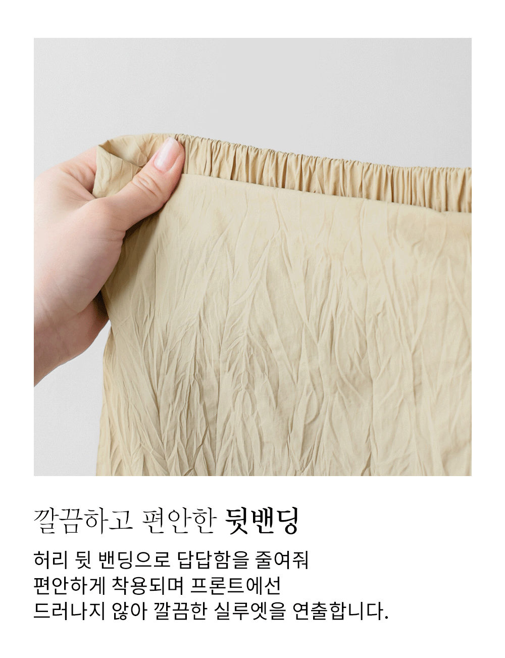 A:허리 앞부분은 매끈한 라인으로 상의를 넣어 입어도 아주 깔끔해요. 밴딩이 뒷부분에만 셔링처럼 잡혀 있어 자켓이나 가디건을 걸치면 밴딩이 있는 줄 모를 정도로 포멀한 실루엣을 자랑해요.