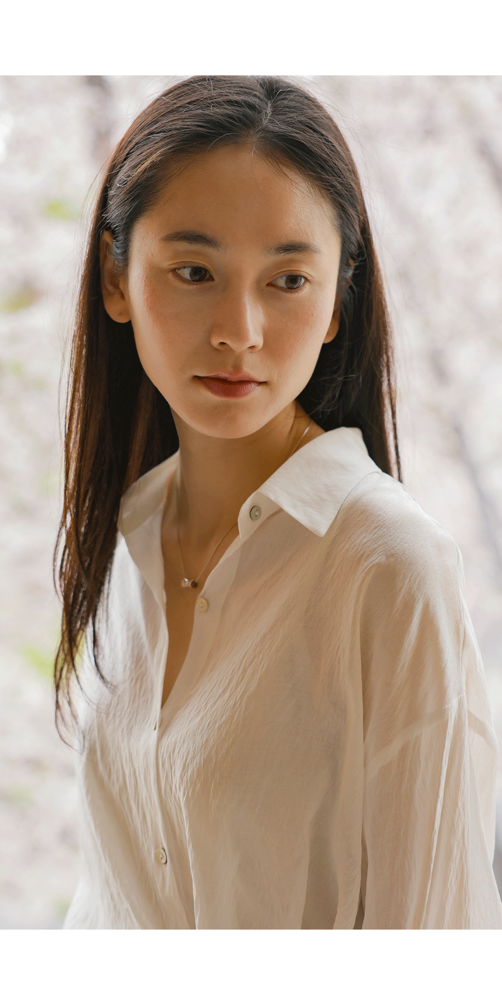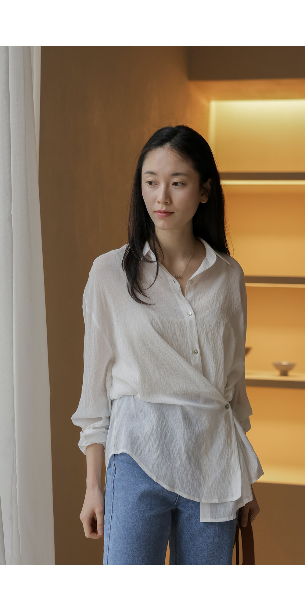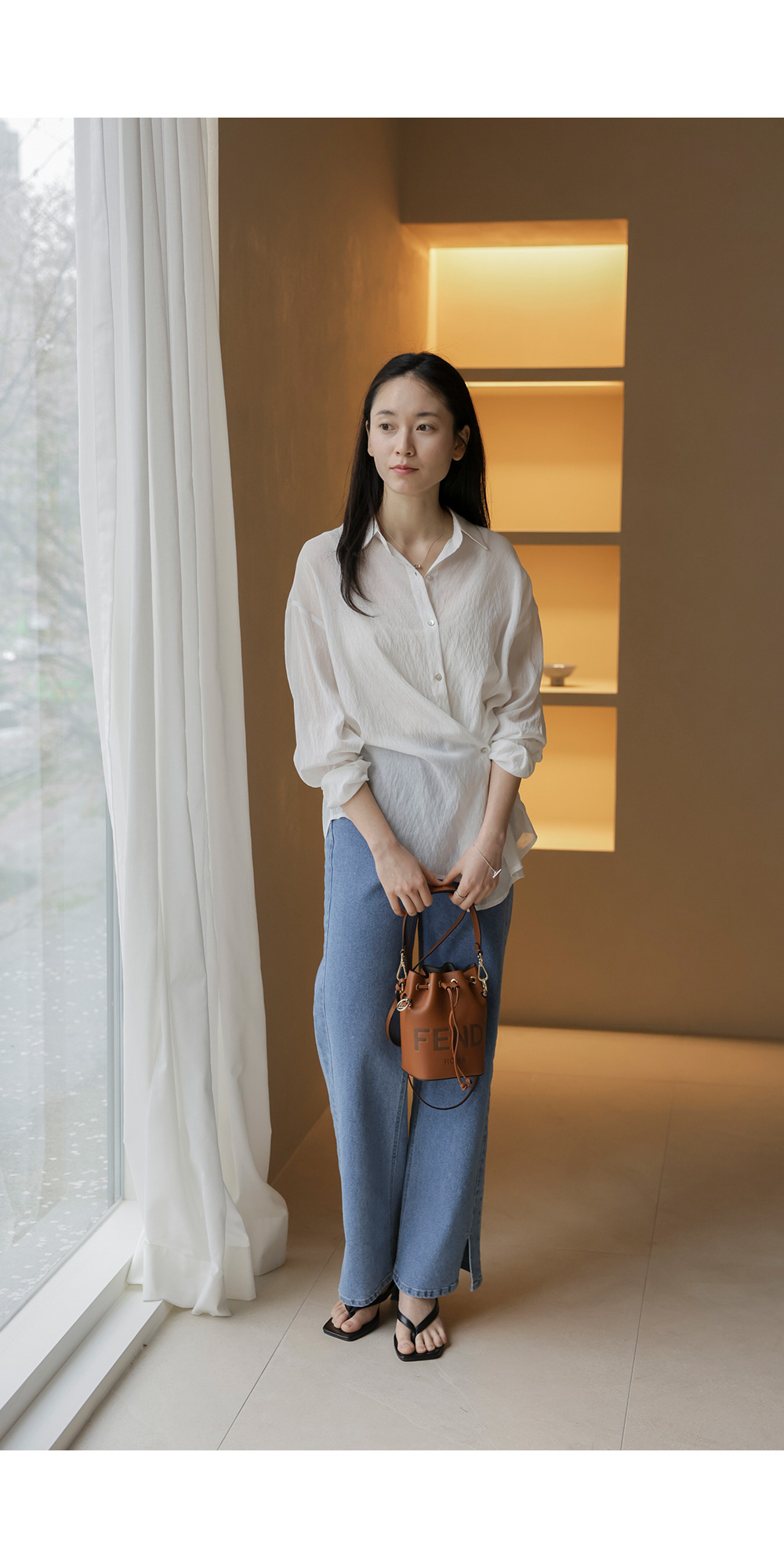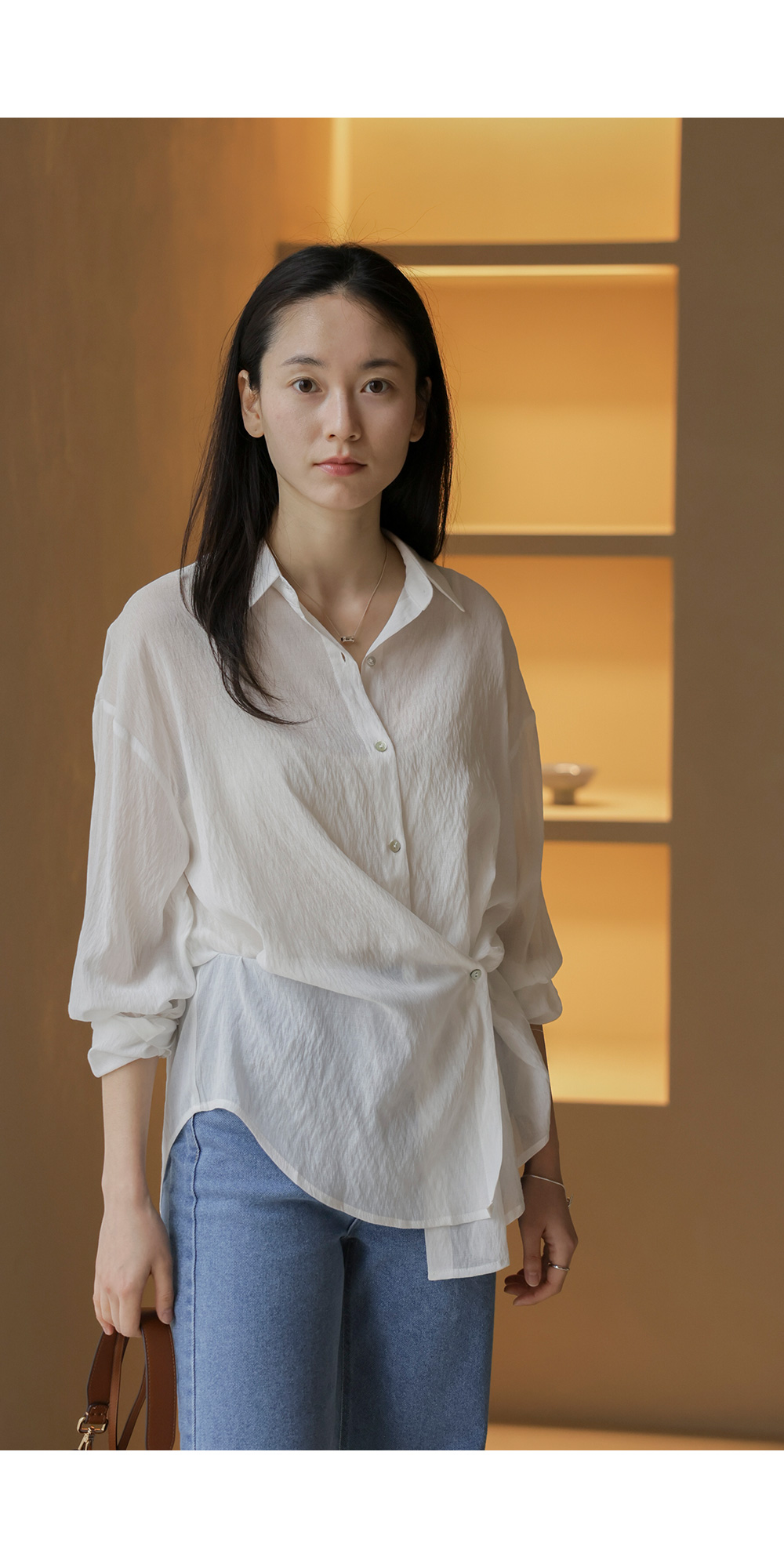 셔츠 아이템은 소재의 텍스처 하나만으로 전체적인 룩의 완성도가 결정되는데요. 몸을 타고 차르르 흐르는 매끈한 터칭감이 일품인 아이템으로, 얇고 가벼운 텍스처가 바디 라인을 여리여리하게 만들어 주구요.