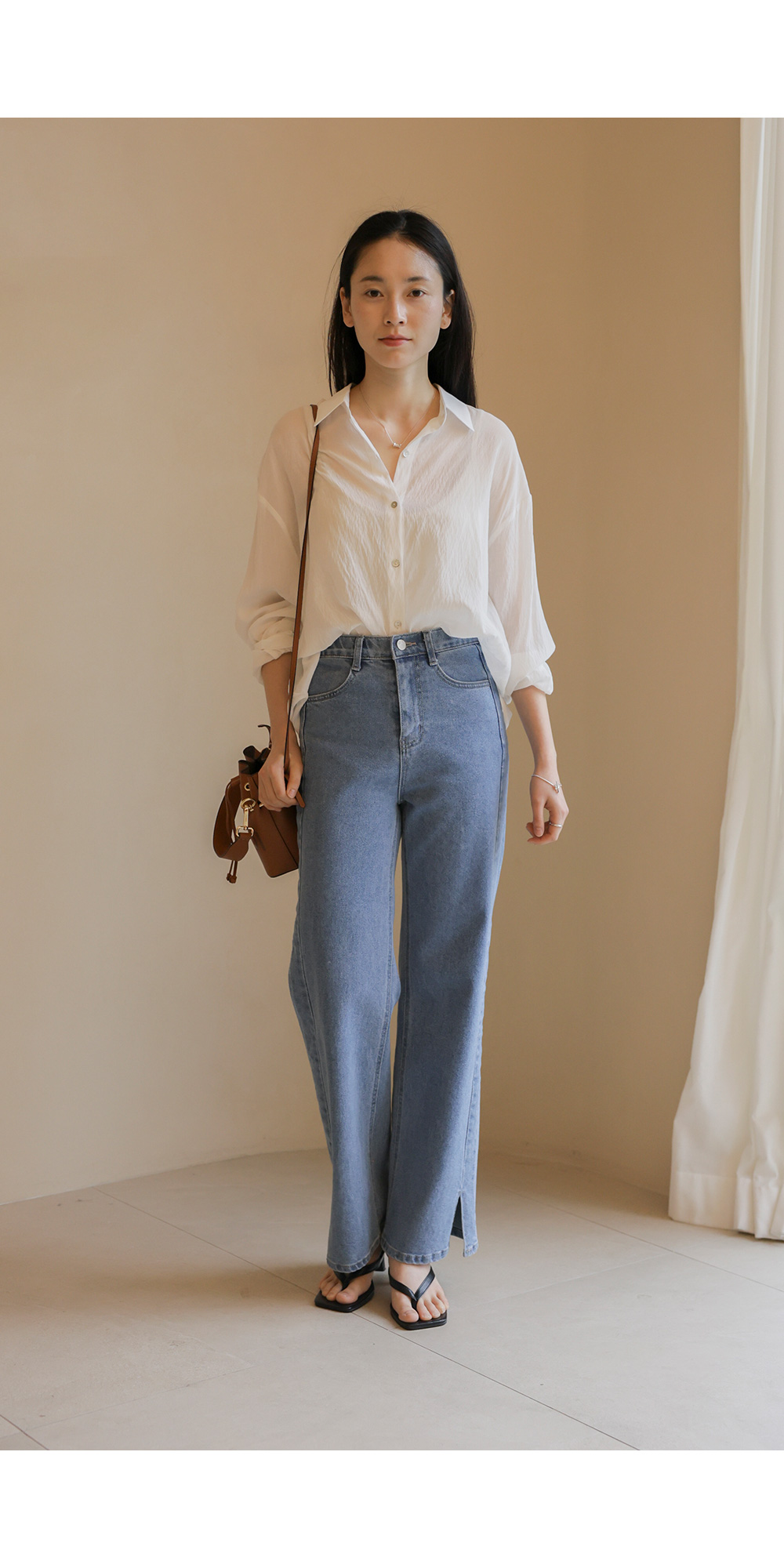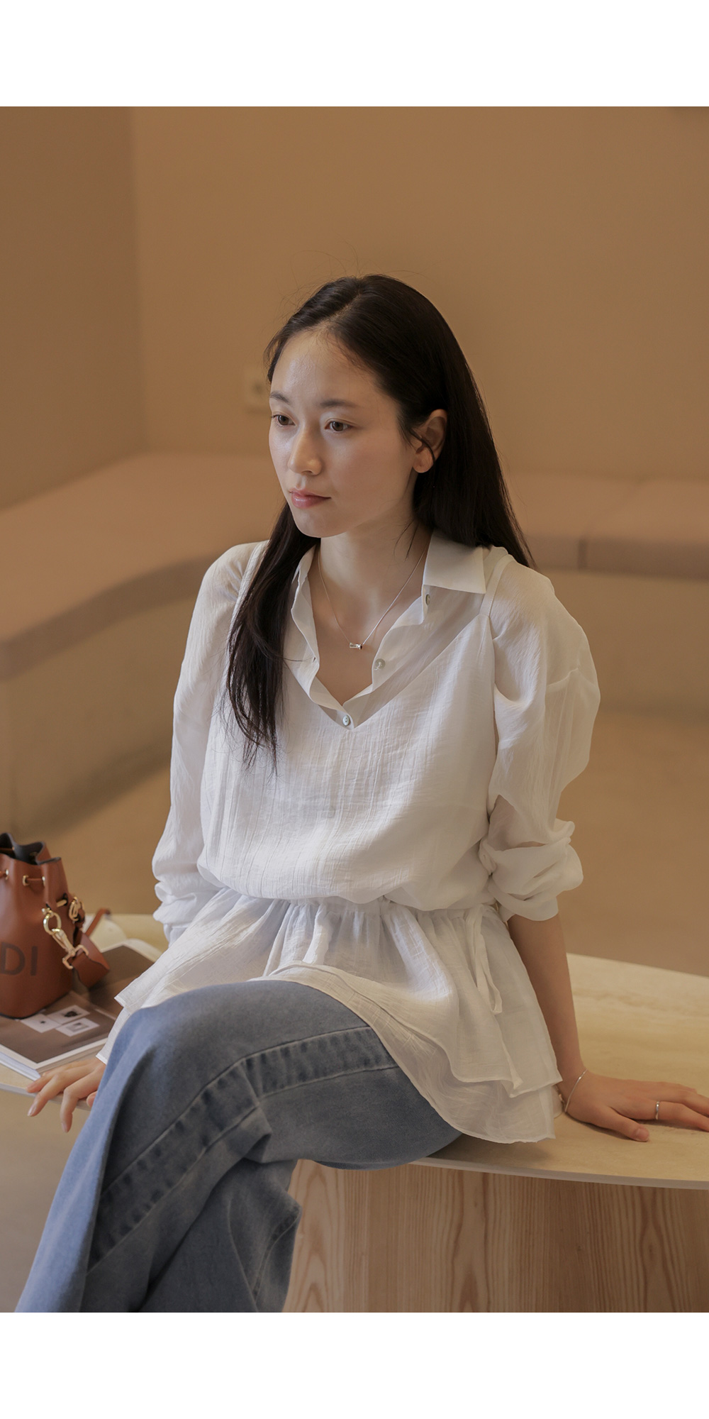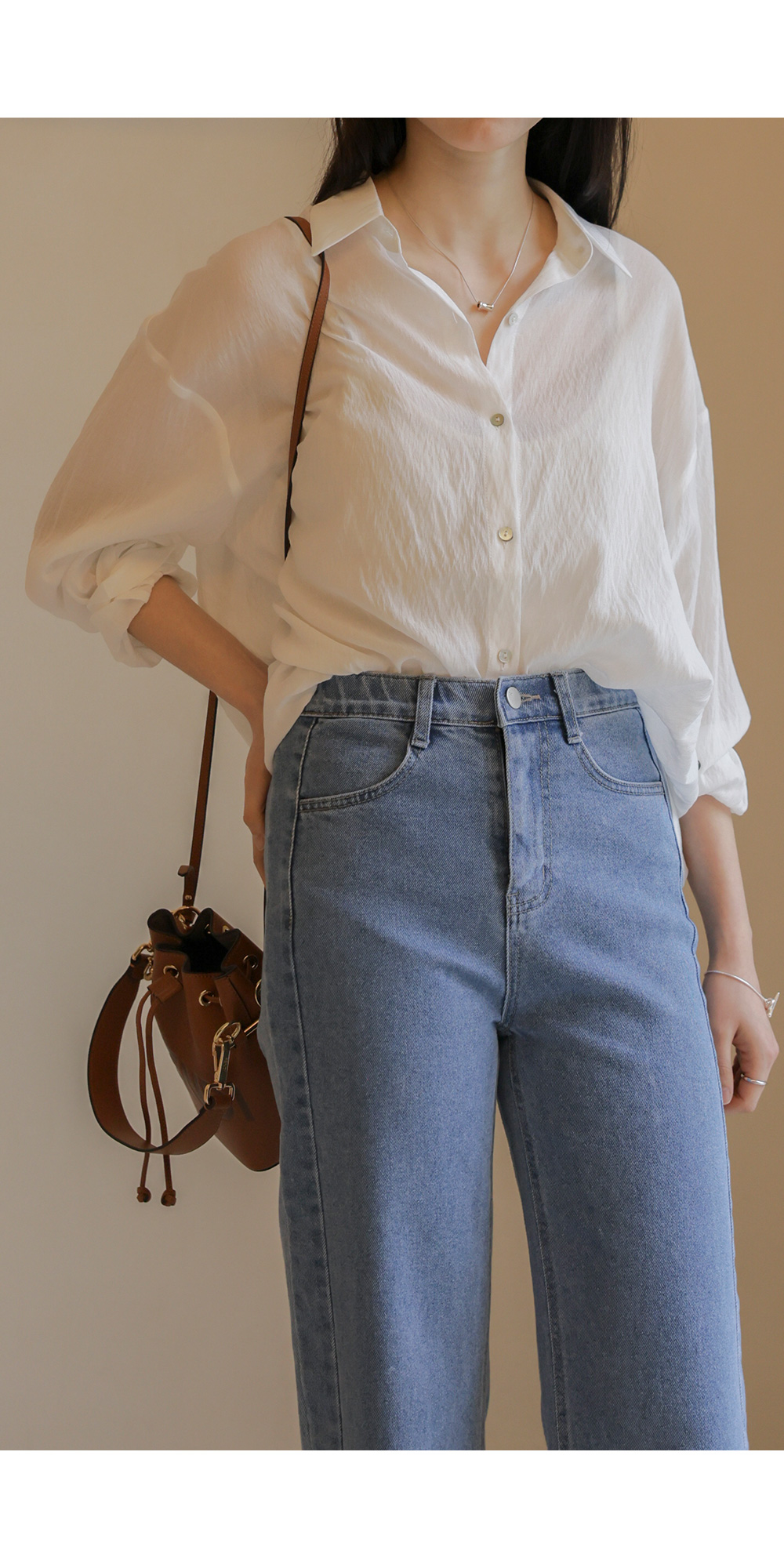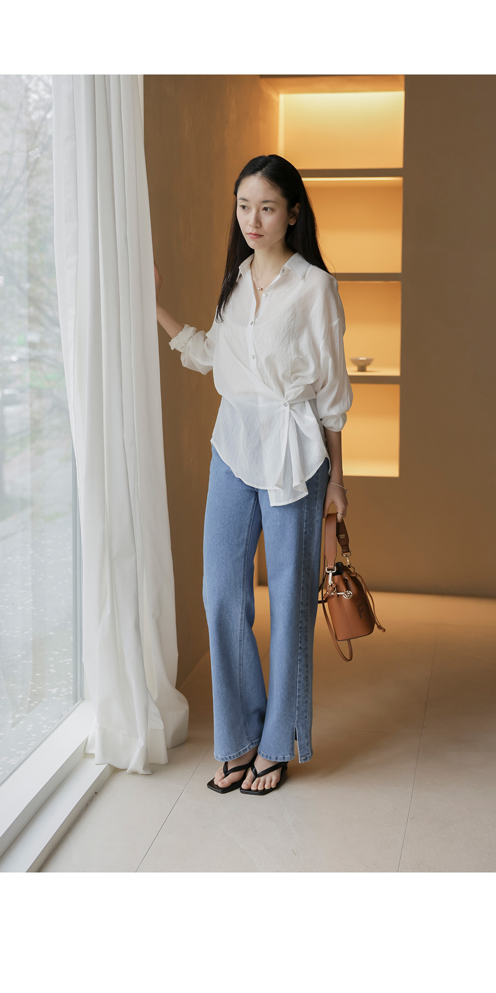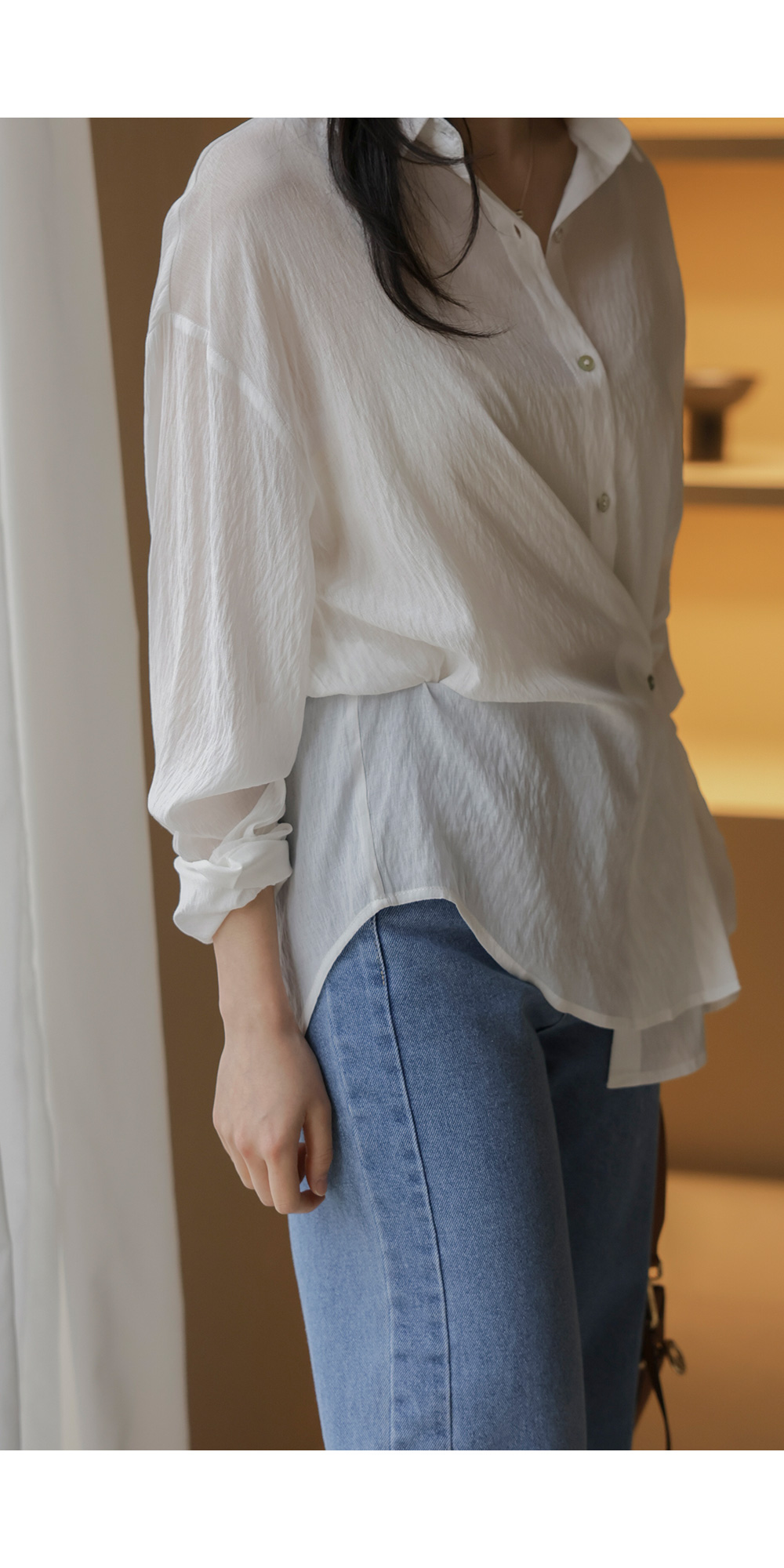 셔츠 아이템은 소재의 텍스처 하나만으로 전체적인 룩의 완성도가 결정되는데요. 몸을 타고 차르르 흐르는 매끈한 터칭감이 일품인 아이템으로, 얇고 가벼운 텍스처가 바디 라인을 여리여리하게 만들어 주구요.