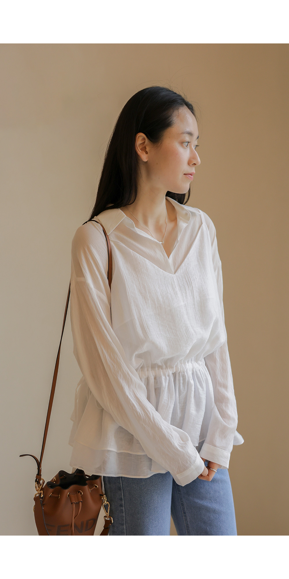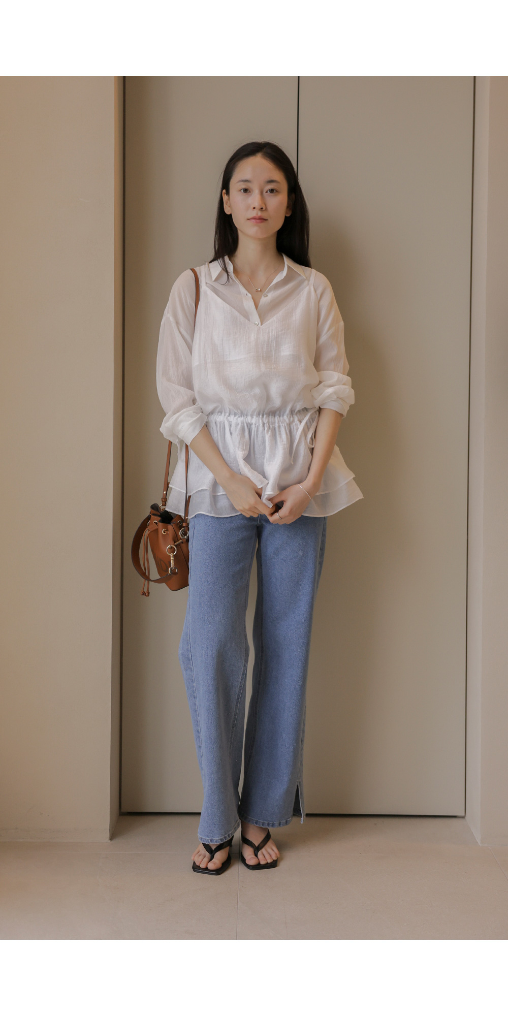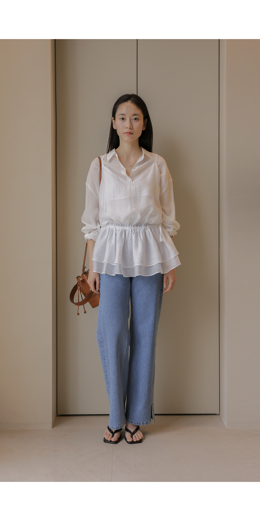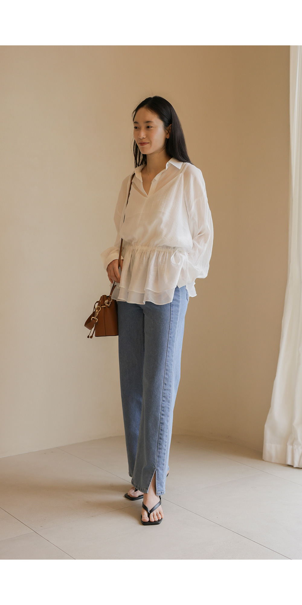 셔츠 아이템은 소재의 텍스처 하나만으로 전체적인 룩의 완성도가 결정되는데요. 몸을 타고 차르르 흐르는 매끈한 터칭감이 일품인 아이템으로, 얇고 가벼운 텍스처가 바디 라인을 여리여리하게 만들어 주구요.