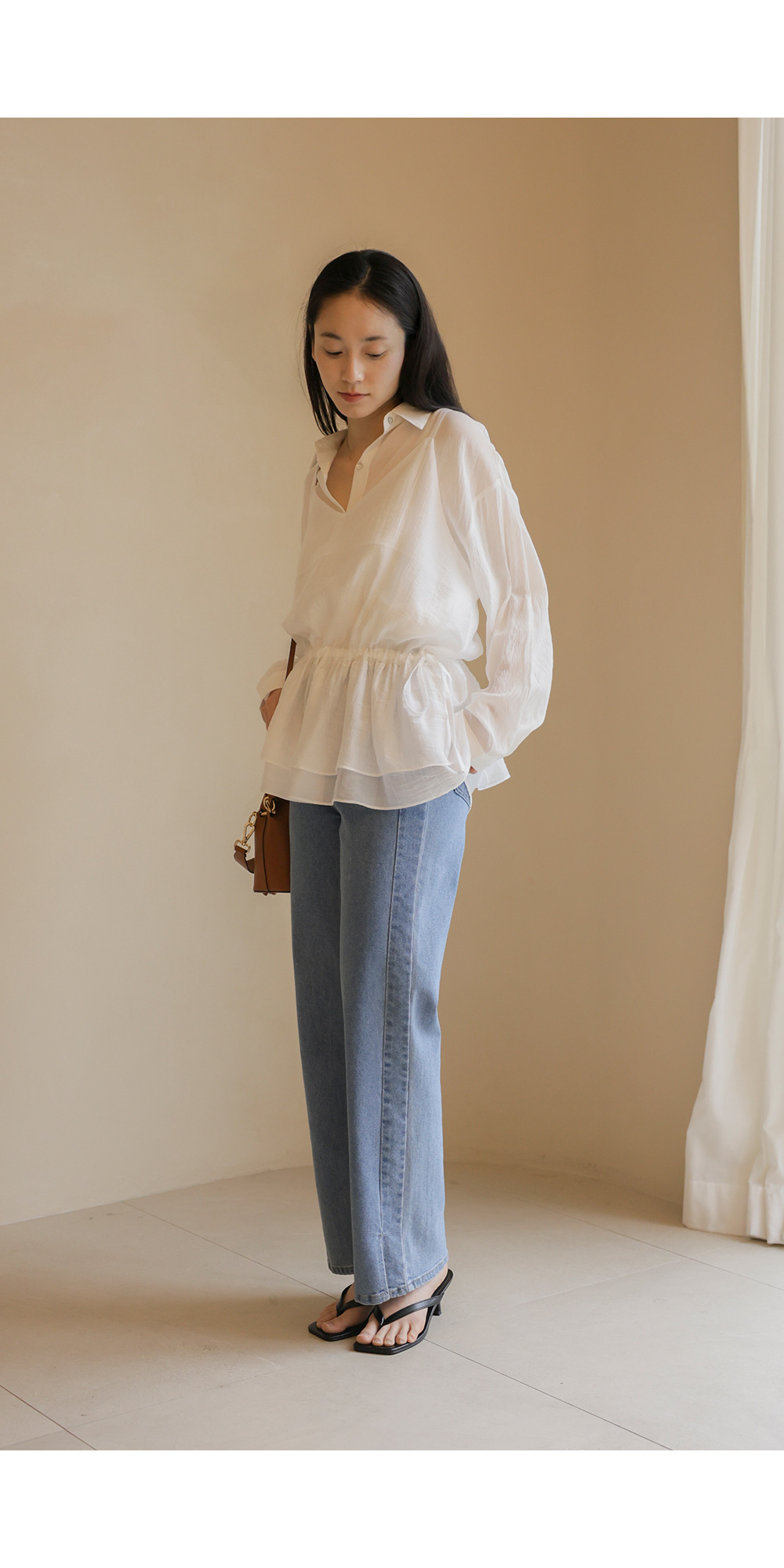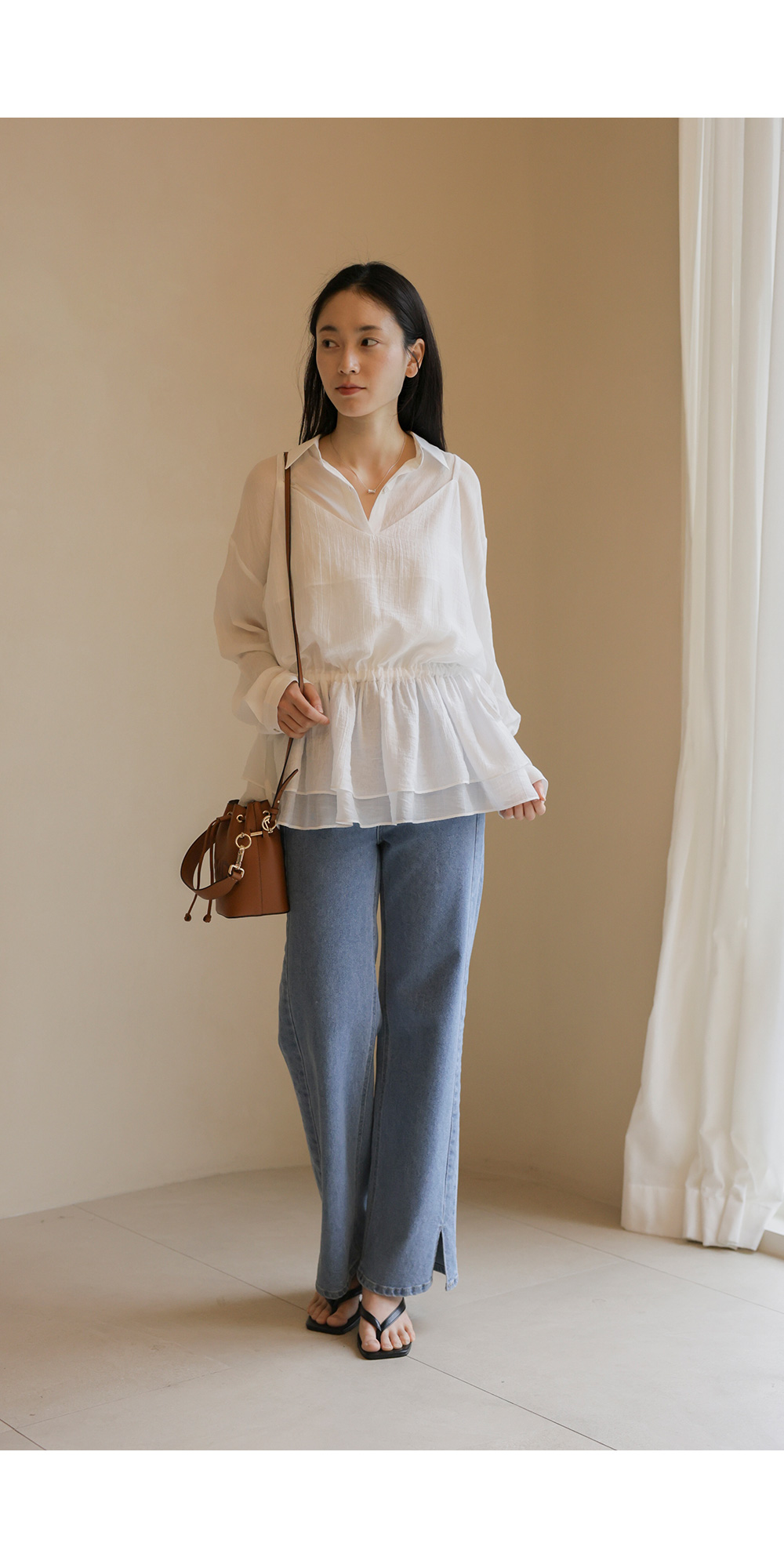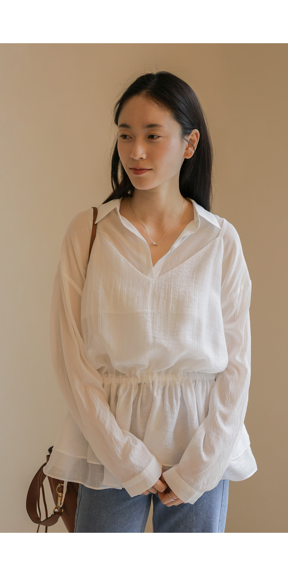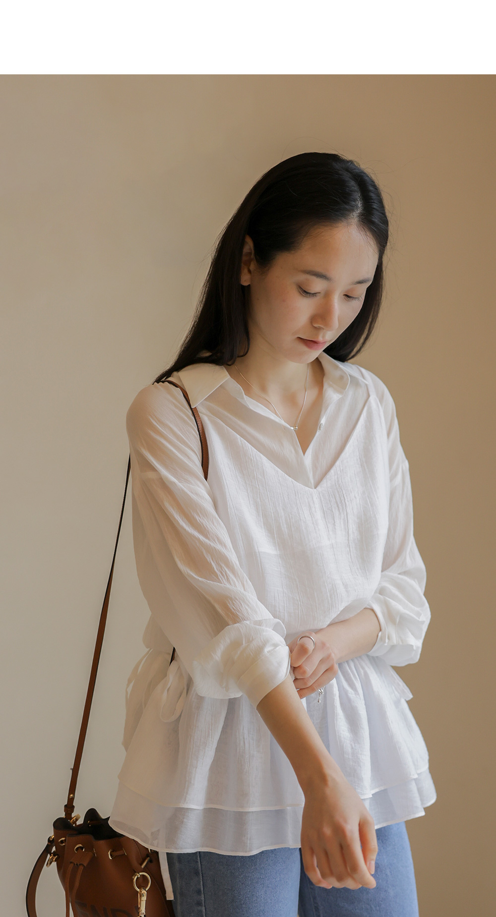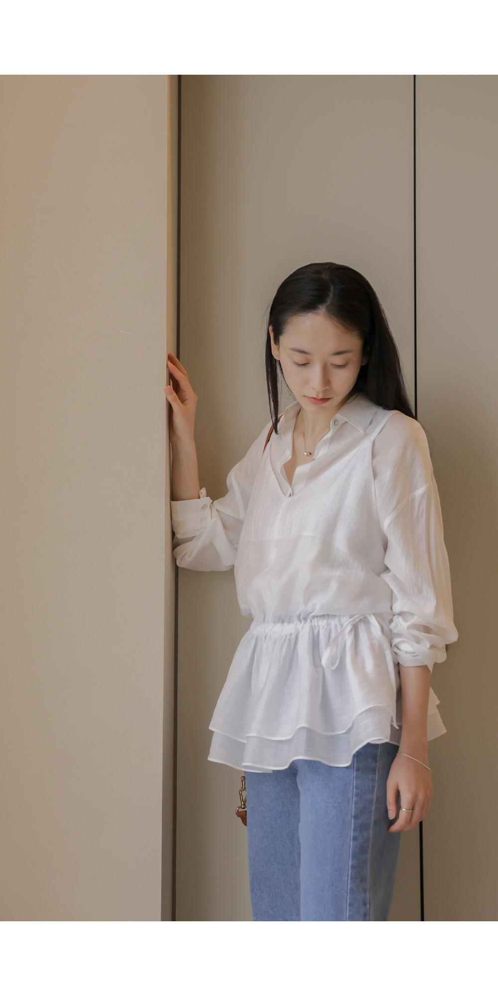 셔츠 아이템은 소재의 텍스처 하나만으로 전체적인 룩의 완성도가 결정되는데요. 몸을 타고 차르르 흐르는 매끈한 터칭감이 일품인 아이템으로, 얇고 가벼운 텍스처가 바디 라인을 여리여리하게 만들어 주구요.