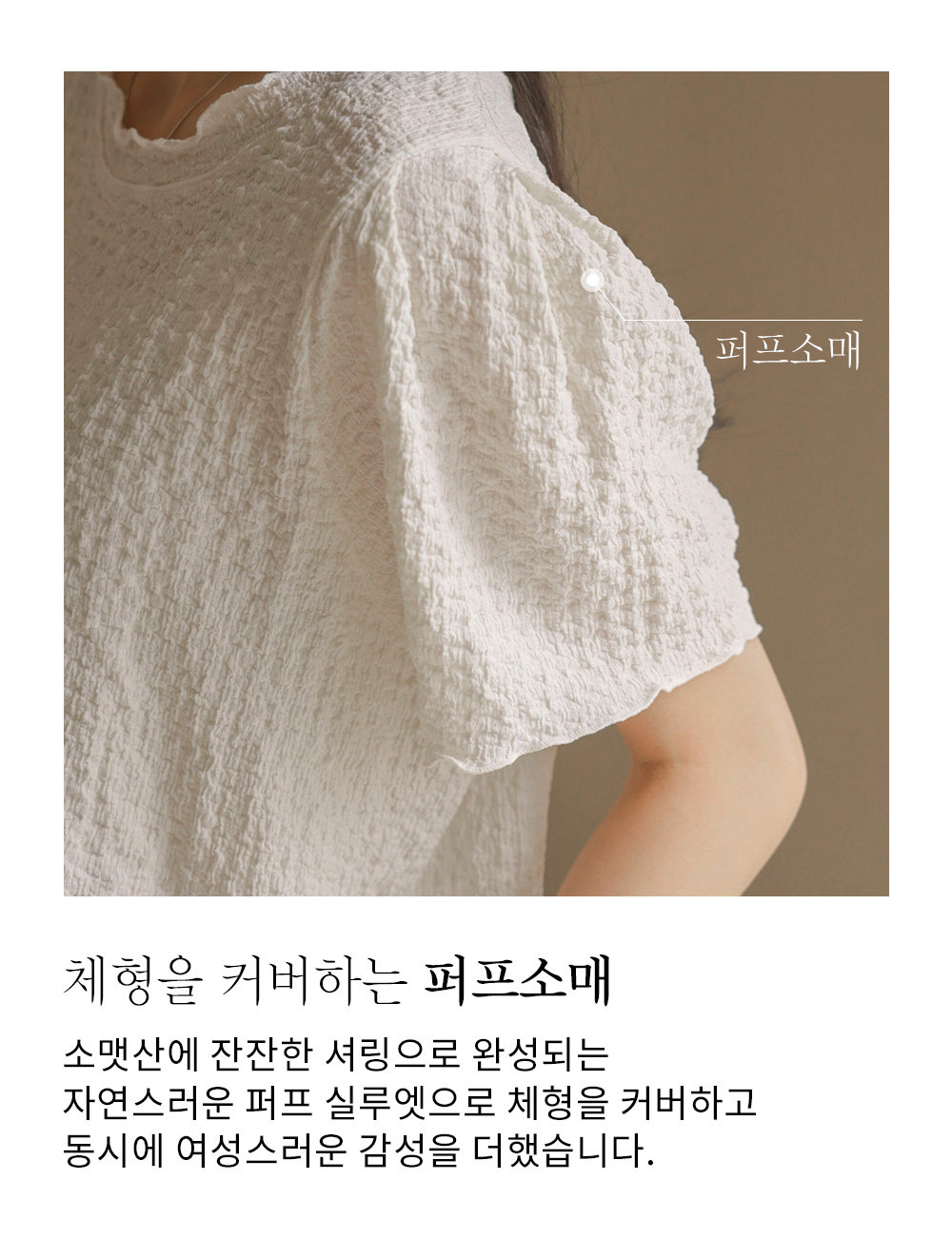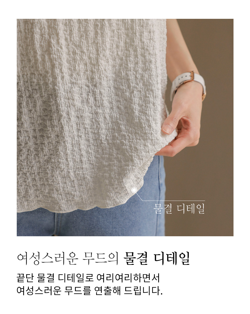 피부에 닿는 느낌이 매우 부드럽고 유연한 폴리와 스판 혼방 소재로 제작되어 착용감이 뛰어나요. 입체적인 텍스처가 살아있어 고급스러운 무드를 연출하며, 신축성이 좋아 장시간 착용해도 편안함을 유지해 준답니다. 소재 특성상 자연스러운 핏을 선사하며, 유연한 소재감으로 활동성까지 갖추고 있어요. 입체적인 텍스처로 인해 쉽게 구겨지지 않아 관리하기에도 용이하답니다. ![]() ![]() MD가 답하는 안심 Q&A