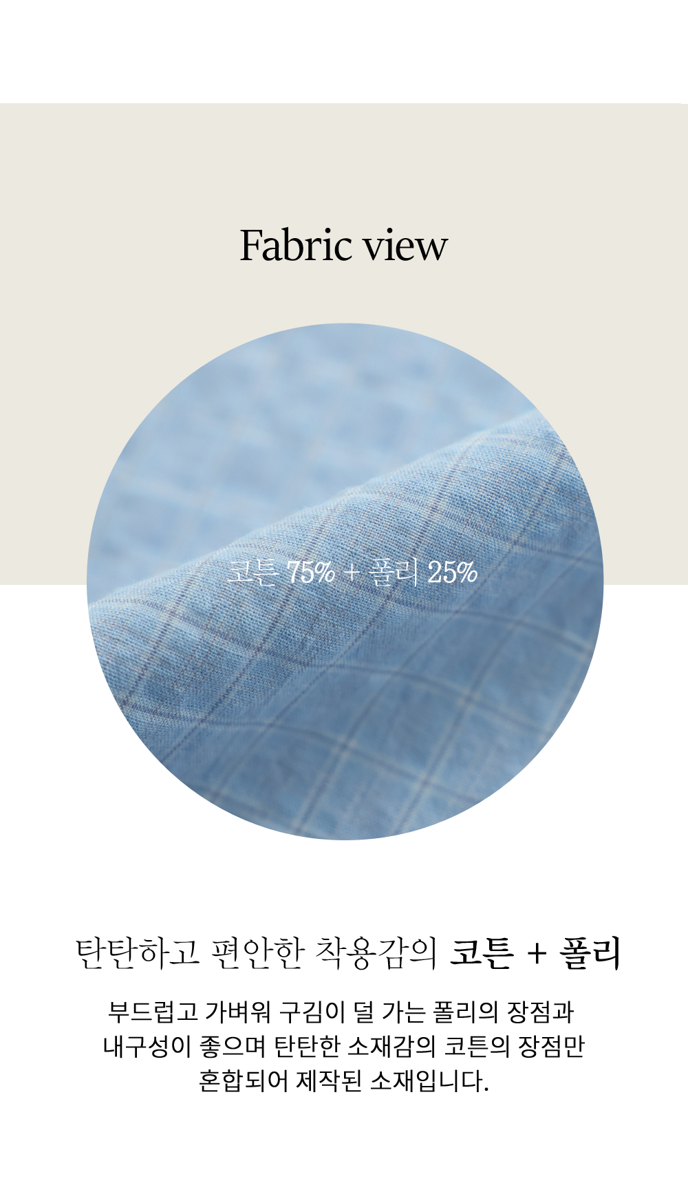 시원한 코튼 75%에 관리가 편한 폴리 25%를 혼용하여 제작했어요. 코튼 특유의 부드럽고 쾌적한 터치감에 폴리의 탄탄한 복원력이 더해져 구김이 잘 가지 않으면서도 하루 종일 산뜻한 착용감을 드린답니다. 원단 두께감이 무척 얇아 통기성이 뛰어나며, 촘촘한 체크 패턴 덕분에 비침 걱정 없이 가볍게 즐기실 수 있는 고퀄리티 서머 원단이에요. ![]() ![]() ![]() ![]() ![]() ![]() ![]() MD가 답하는 안심 Q&A