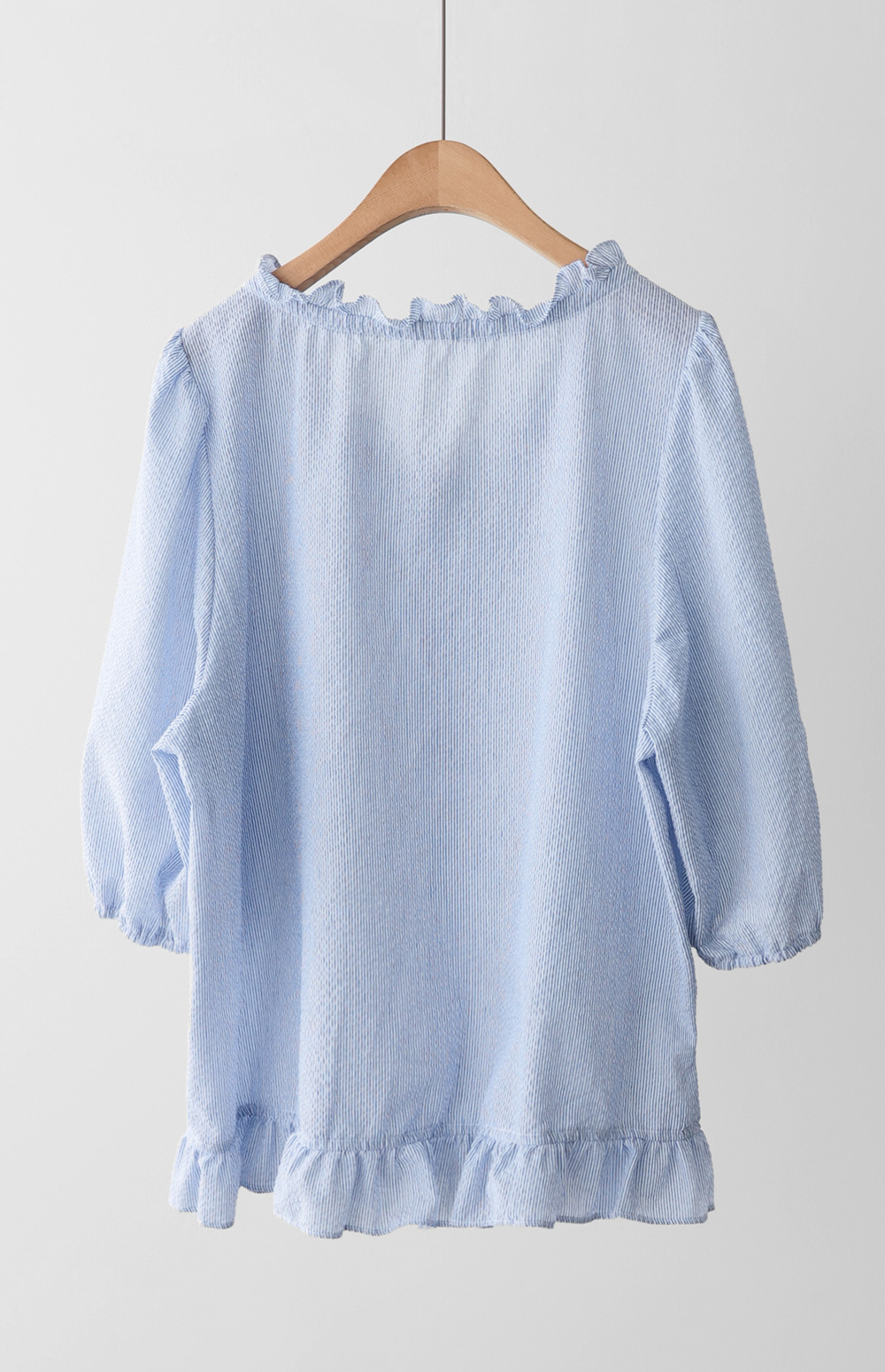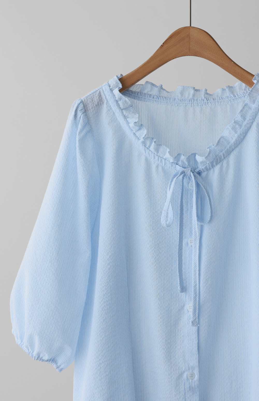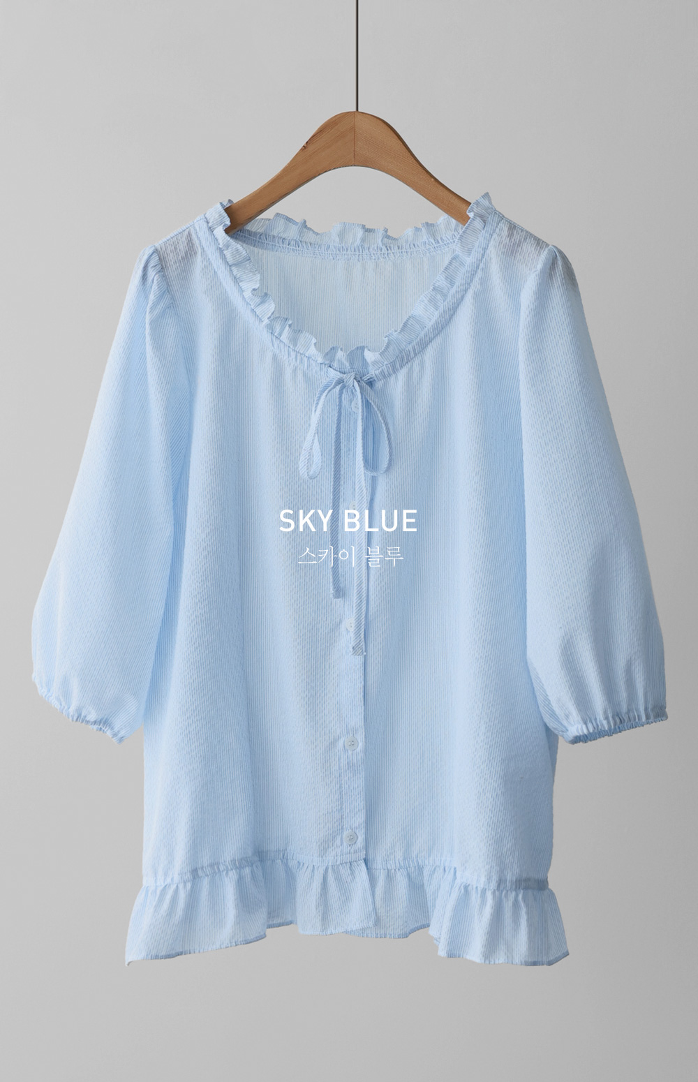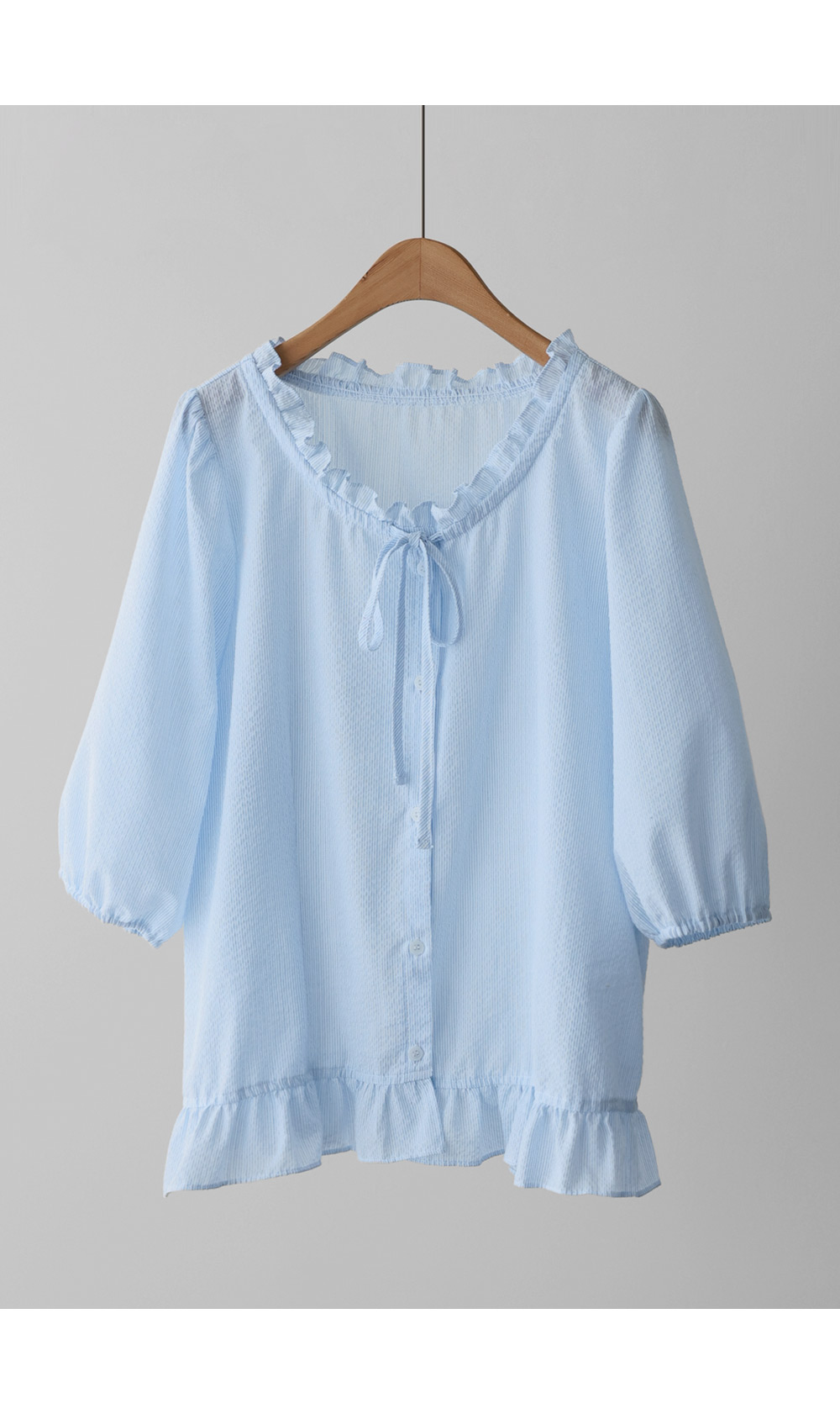 로맨틱한 무드와 실용성을 모두 잡은 프릴 블라우스를 소개해 드려요. 시원하고 얇은 소재감에 넥 라인과 소매, 그리고 밑단까지 더해진 프릴 디테일이 사랑스러운 실루엣을 완성해줘요.