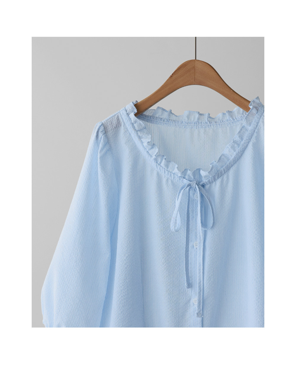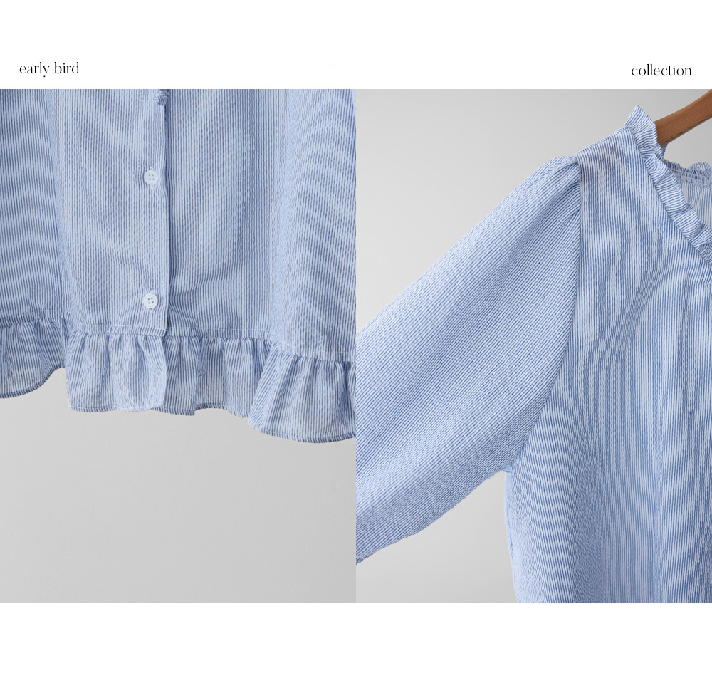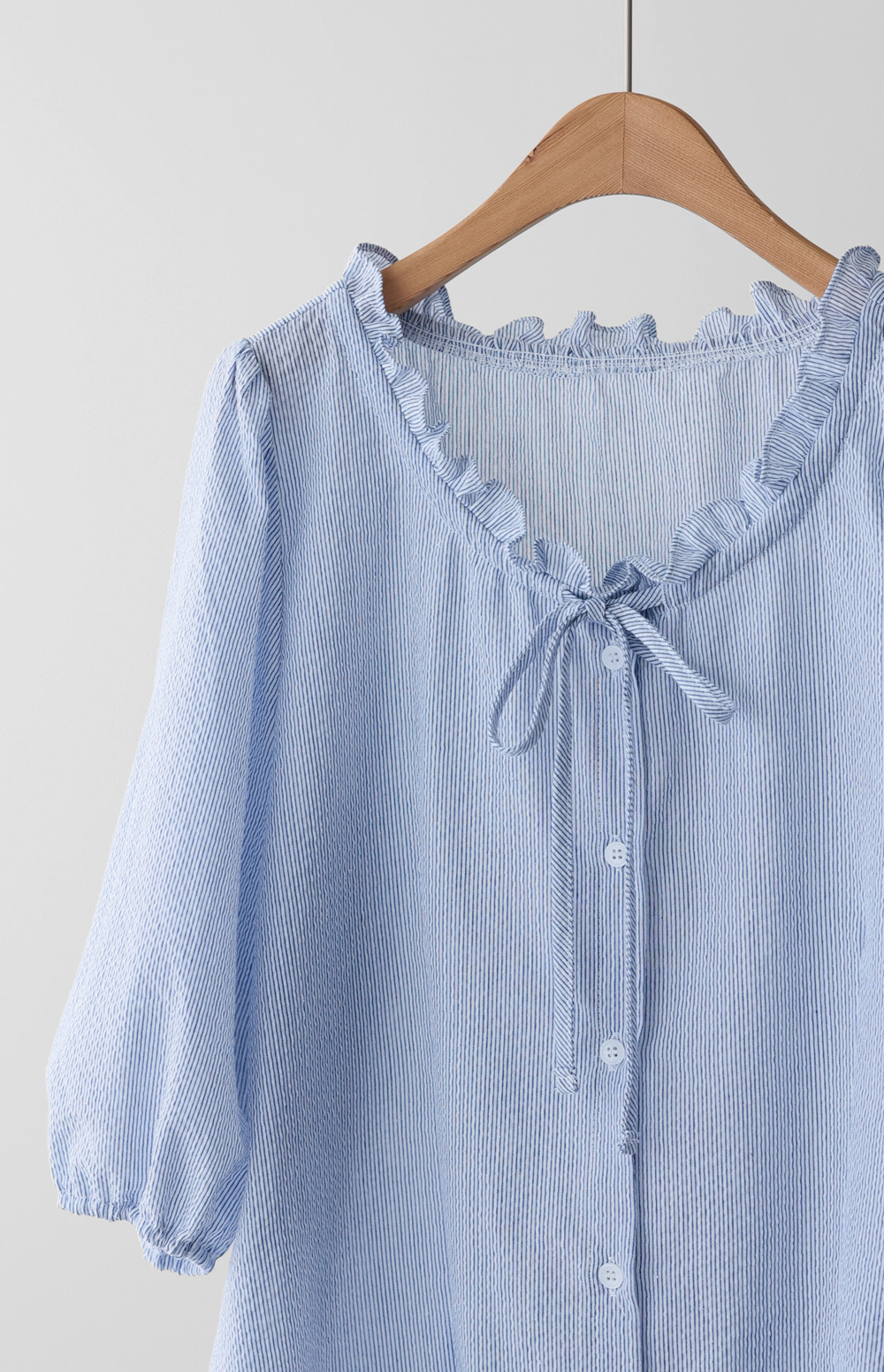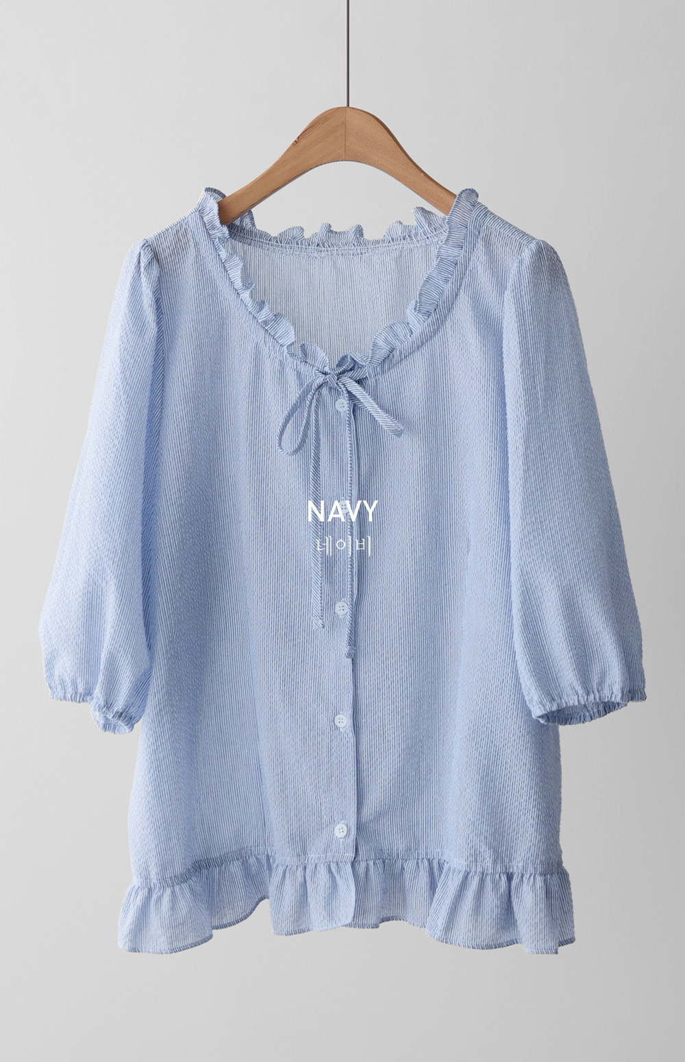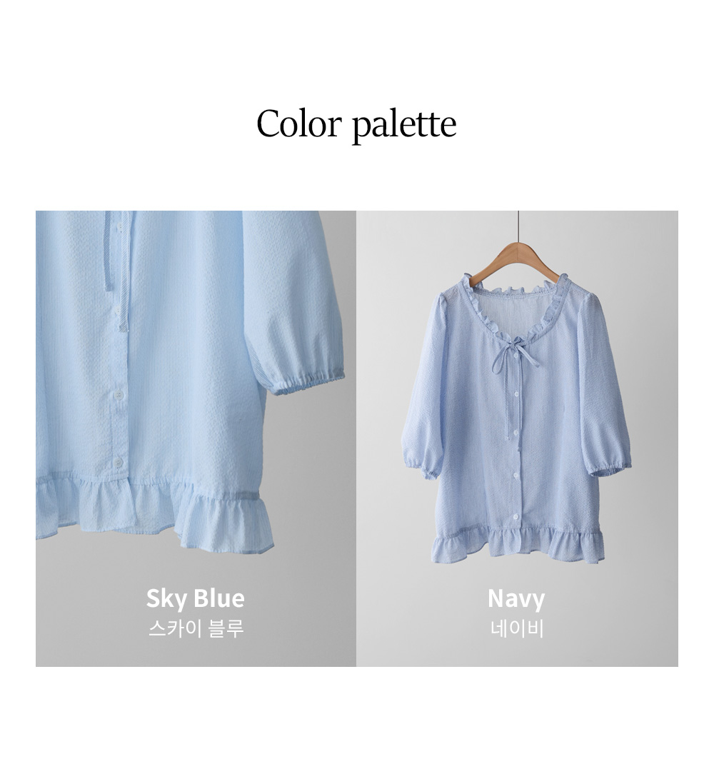 로맨틱한 무드와 실용성을 모두 잡은 프릴 블라우스를 소개해 드려요. 시원하고 얇은 소재감에 넥 라인과 소매, 그리고 밑단까지 더해진 프릴 디테일이 사랑스러운 실루엣을 완성해줘요.