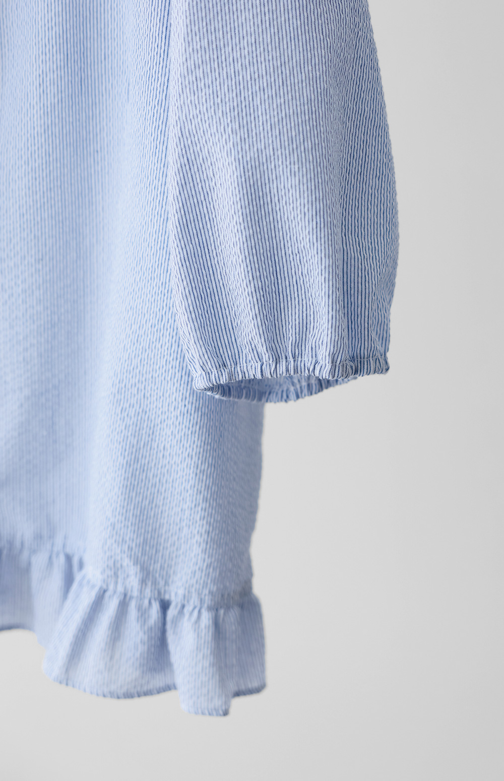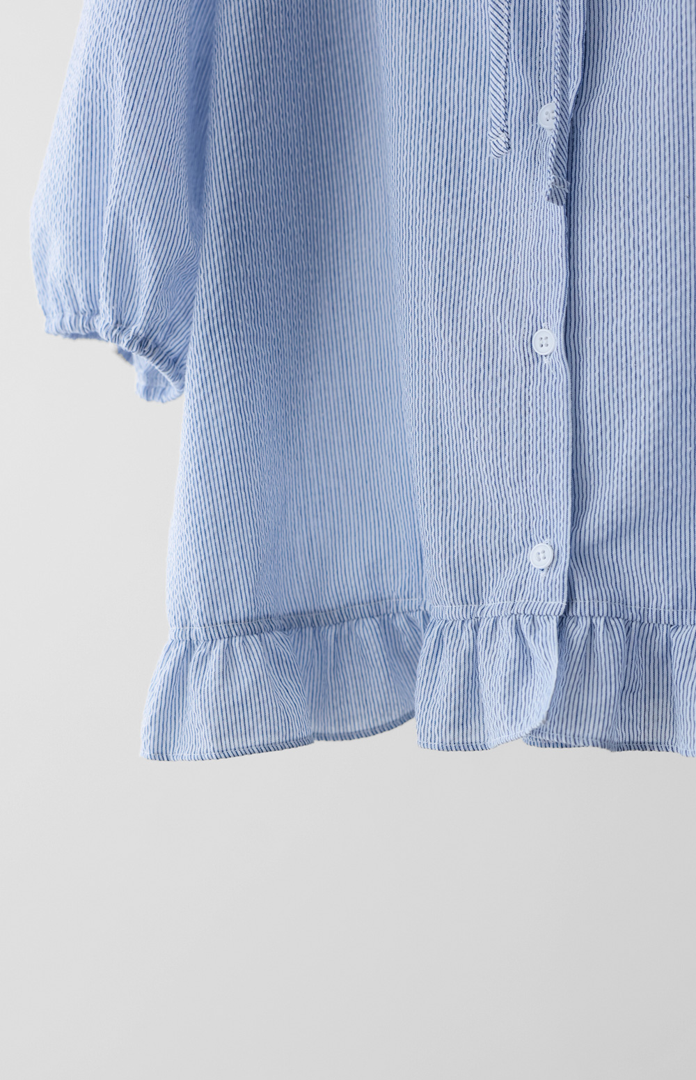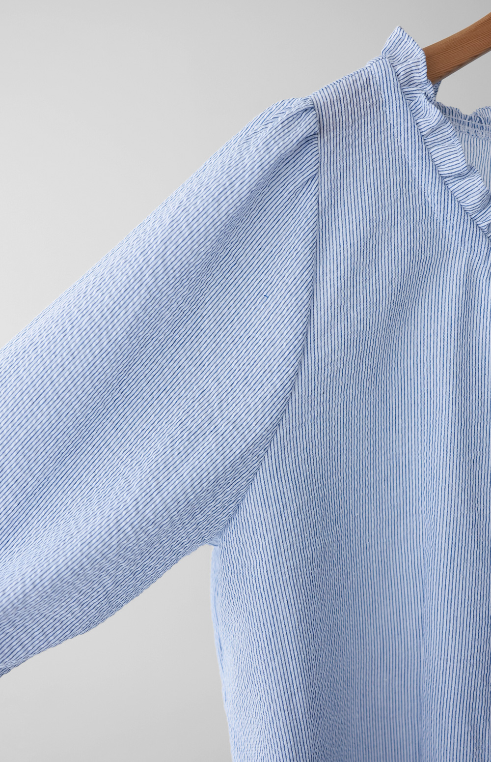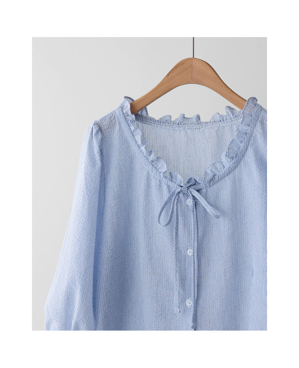 로맨틱한 무드와 실용성을 모두 잡은 프릴 블라우스를 소개해 드려요. 시원하고 얇은 소재감에 넥 라인과 소매, 그리고 밑단까지 더해진 프릴 디테일이 사랑스러운 실루엣을 완성해줘요.