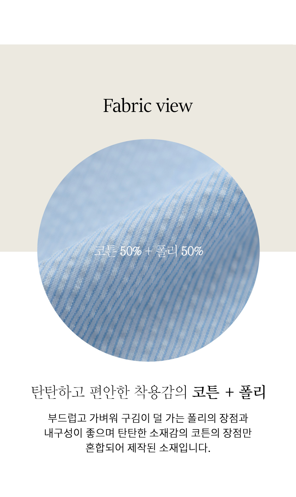 시원한 코튼 50%와 관리가 편한 폴리 50%를 최적의 비율로 혼용하여 제작했어요. 코튼의 부드럽고 쾌적한 흡수성에 폴리의 탄탄한 복원력이 더해져 구김 걱정을 덜어주면서도 아주 가벼운 무게감을 자랑한답니다. 원단 두께가 매우 얇아 통기성이 뛰어나며, 피부에 닿는 감촉이 산뜻해 한여름까지 무더위 걱정 없이 즐기실 수 있는 고급 서머 원단이에요. ![]() ![]() ![]() ![]() MD가 답하는 안심 Q&A