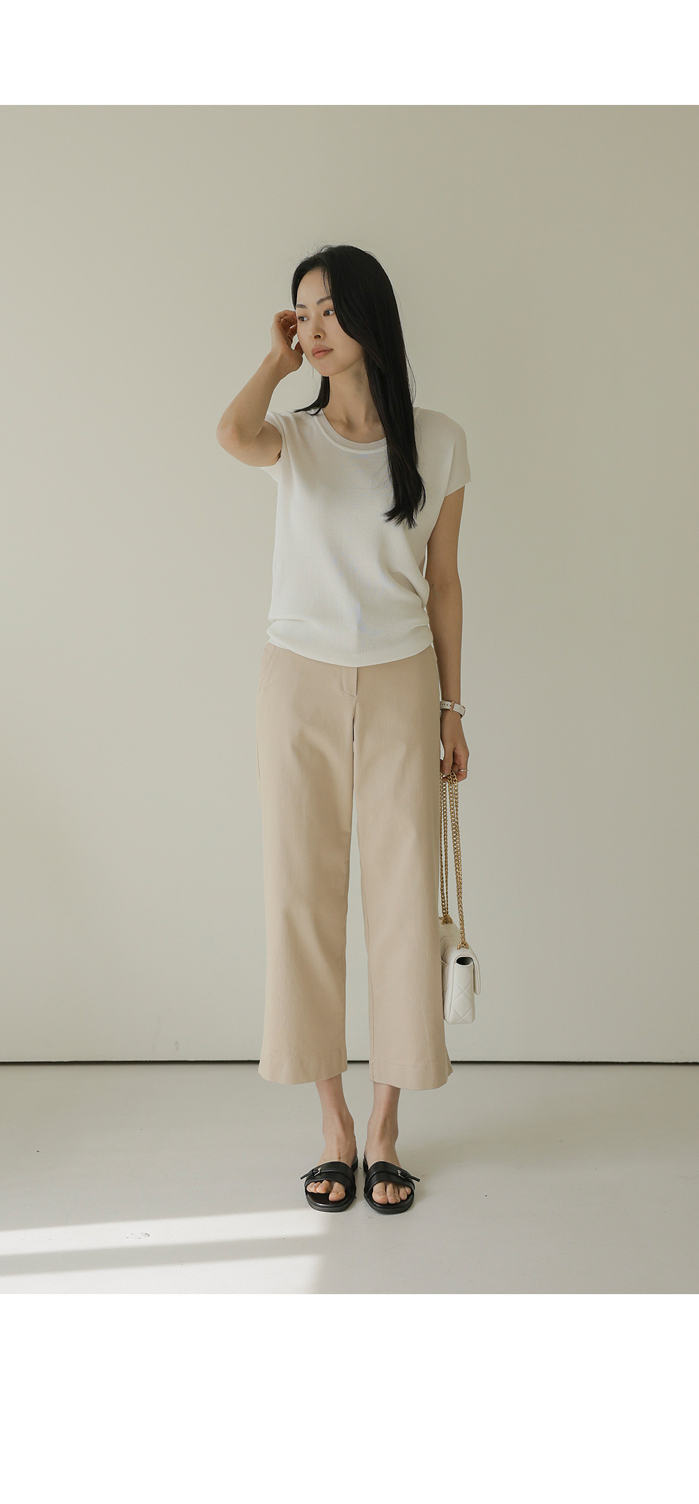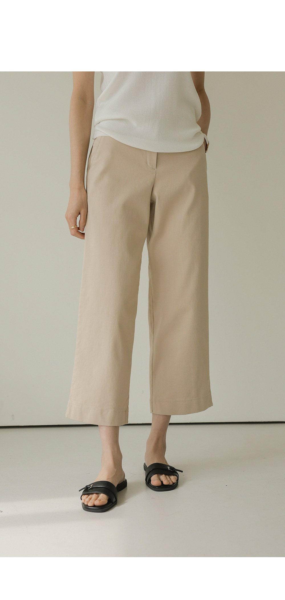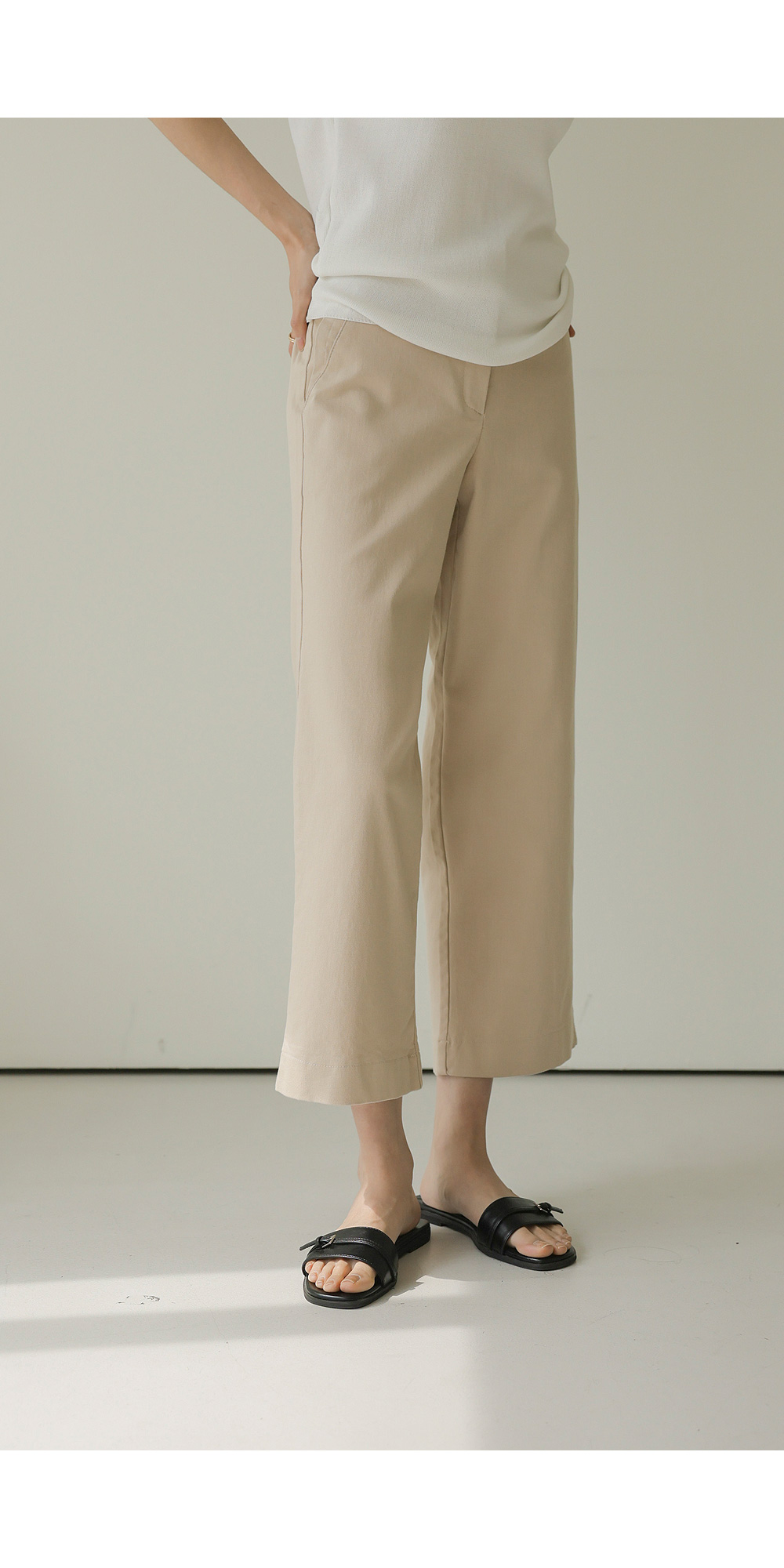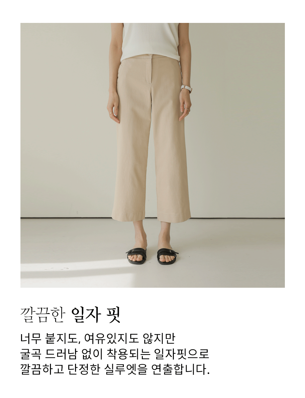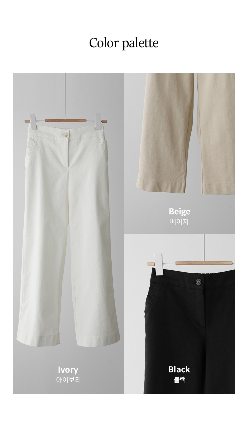 컬러 구성은 가장 기본이 되면서도 세련된 분위기를 주는 블랙, 베이지, 아이보리 세 가지로 준비했어요. 어떤 상의와 매치해도 조화롭게 어우러지는 베이직한 톤이라 컬러별로 소장하셔도 활용도가 정말 높으실 거예요.