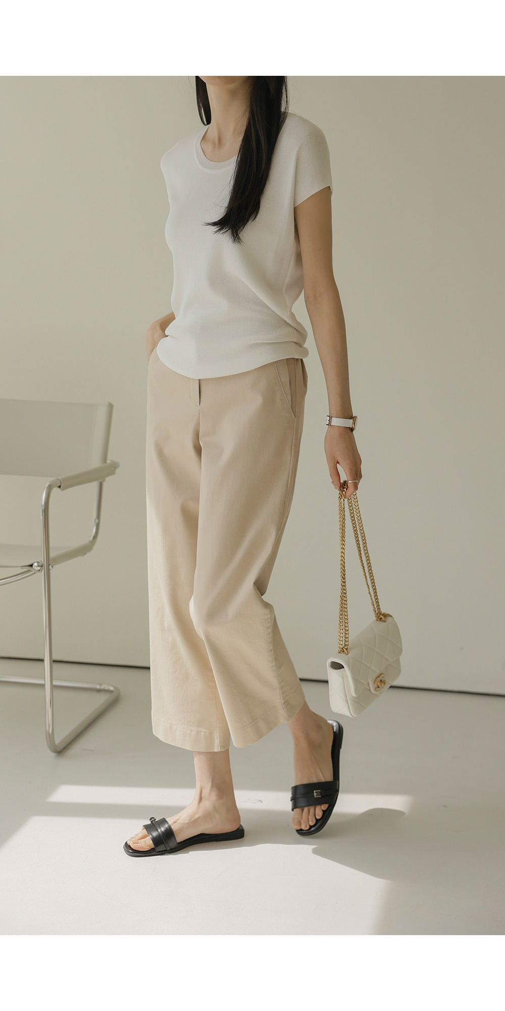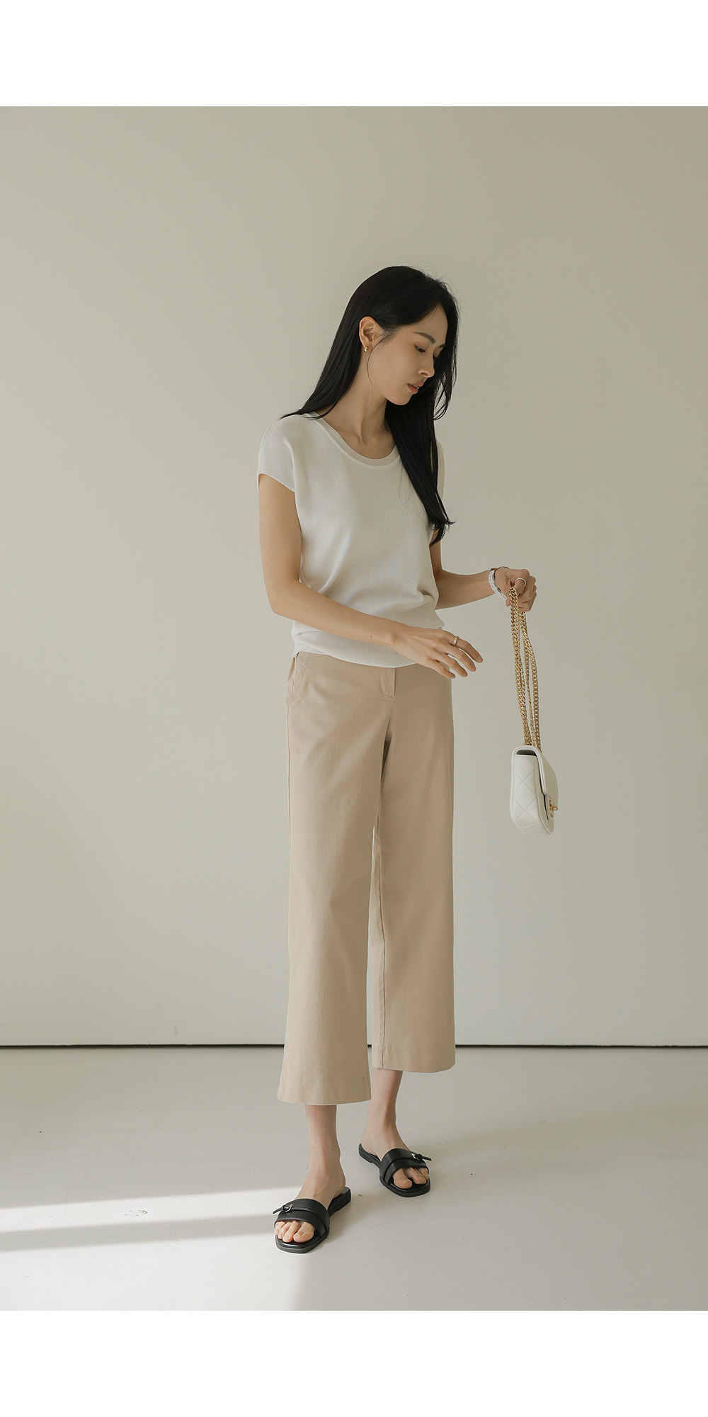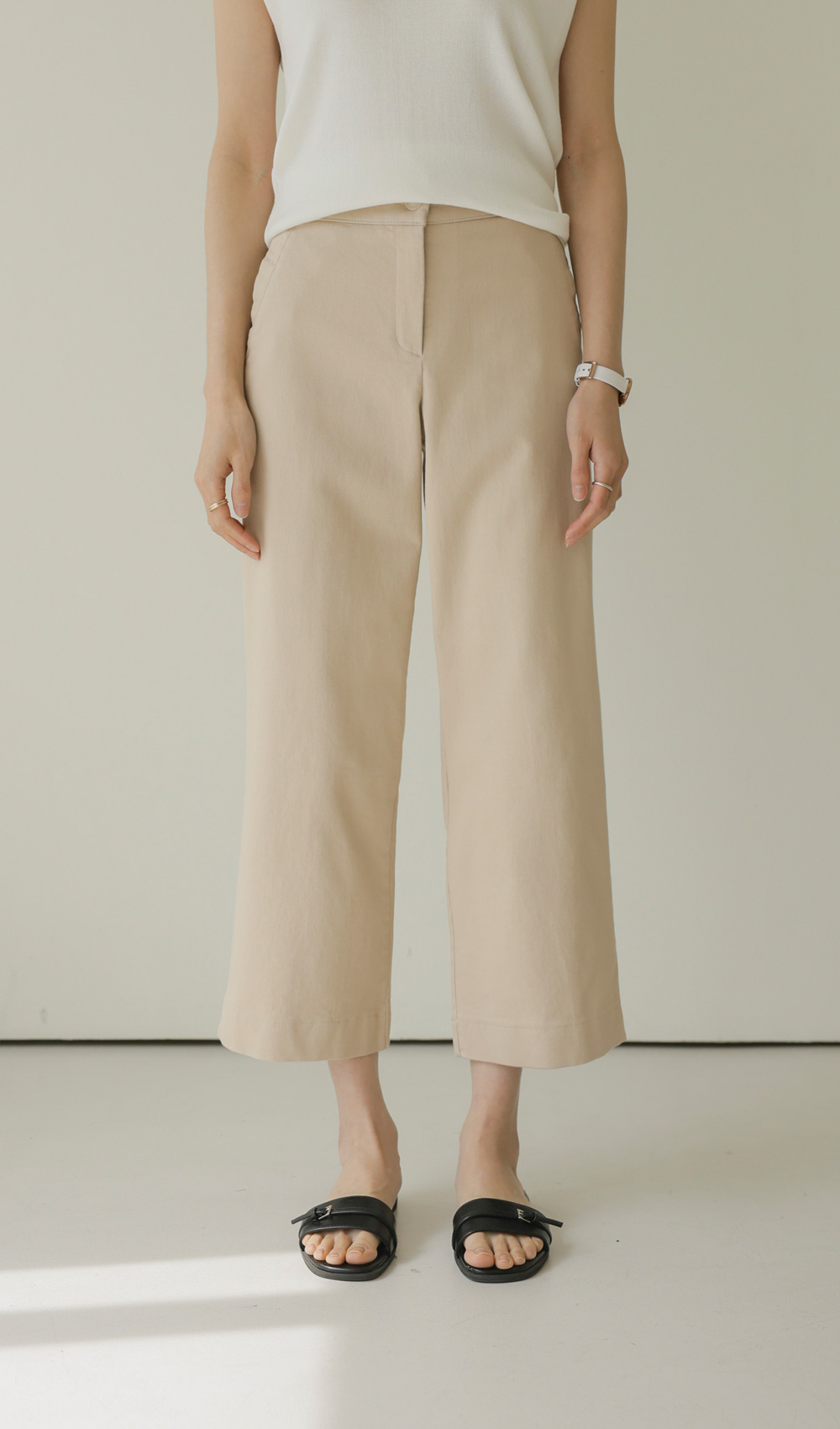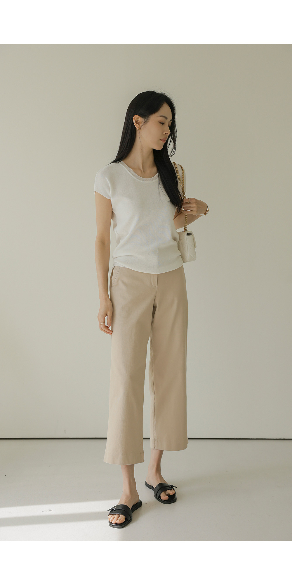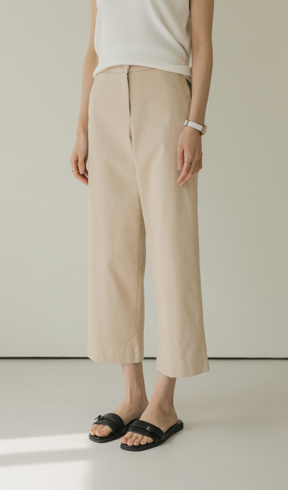 컬러 구성은 가장 기본이 되면서도 세련된 분위기를 주는 블랙, 베이지, 아이보리 세 가지로 준비했어요. 어떤 상의와 매치해도 조화롭게 어우러지는 베이직한 톤이라 컬러별로 소장하셔도 활용도가 정말 높으실 거예요.