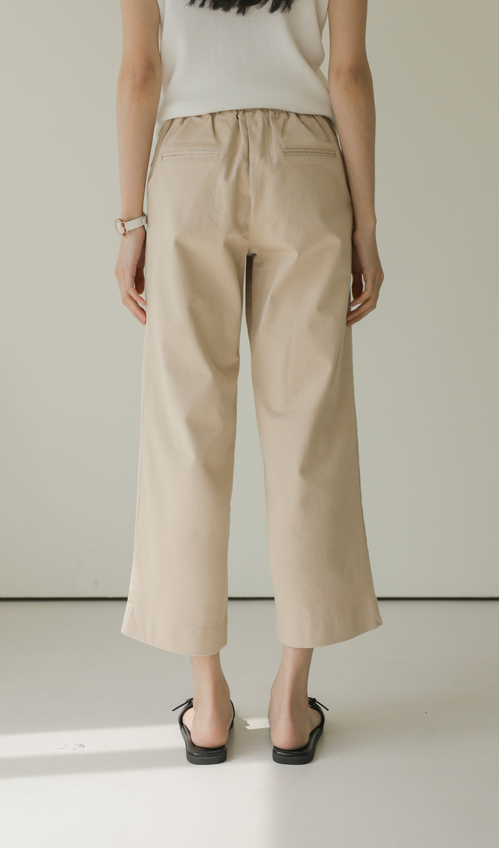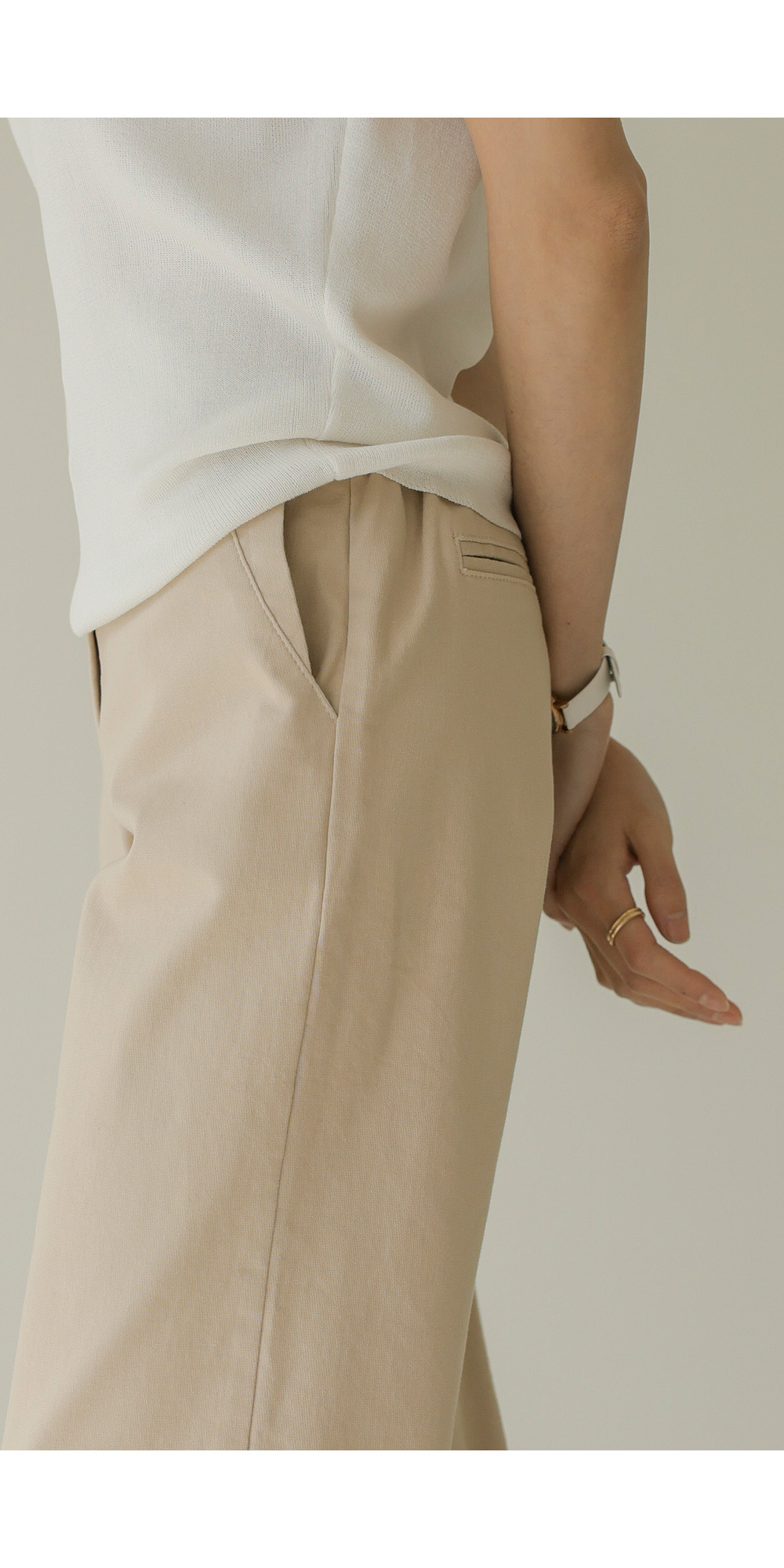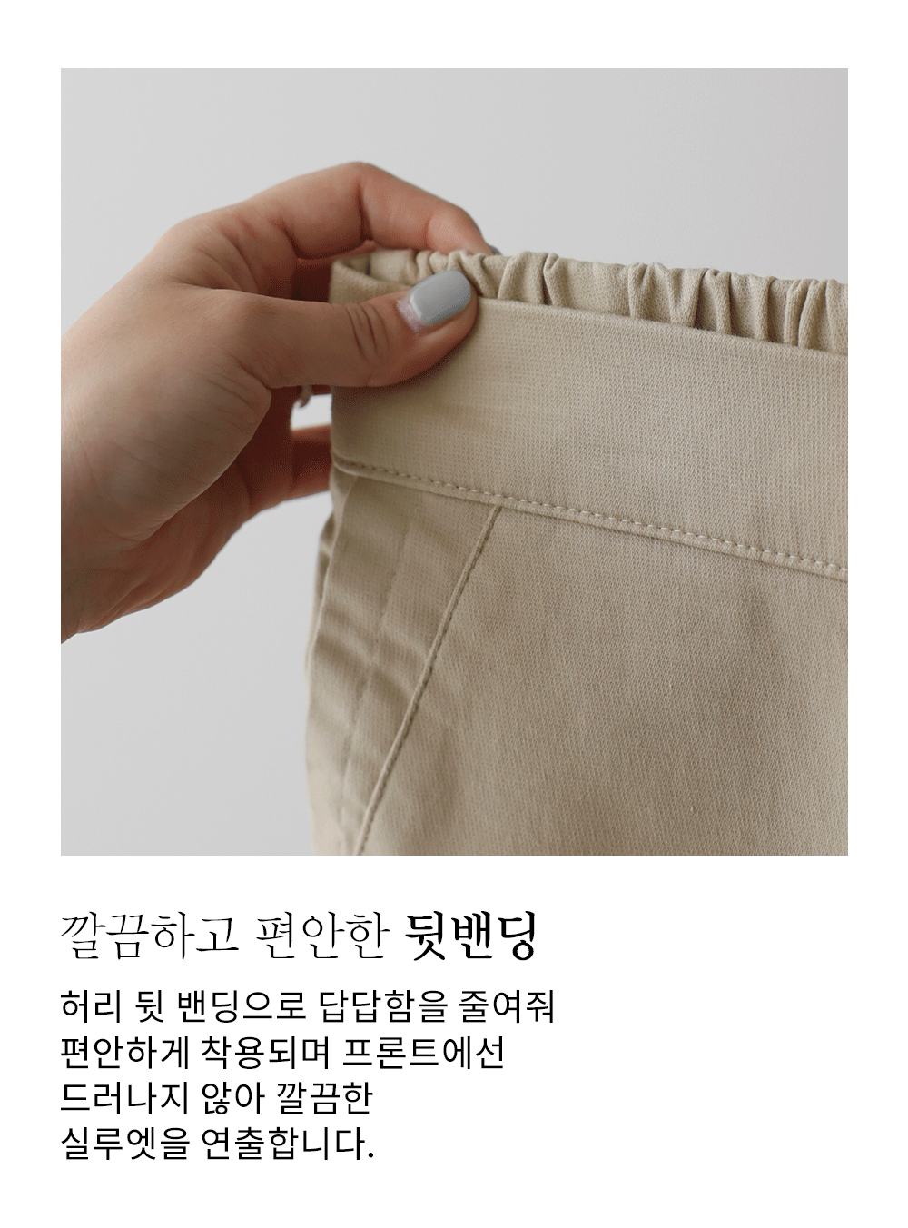 가장 세심하게 신경 쓴 부분은 허리 라인의 반전 디테일이에요. 앞부분은 깔끔한 벨트 라인으로 제작하여 상의를 넣어 입어도 단정한 느낌을 주지만, 뒷부분은 유연한 밴딩 처리를 하여 체형에 구애받지 않는 편안함을 드린답니다.