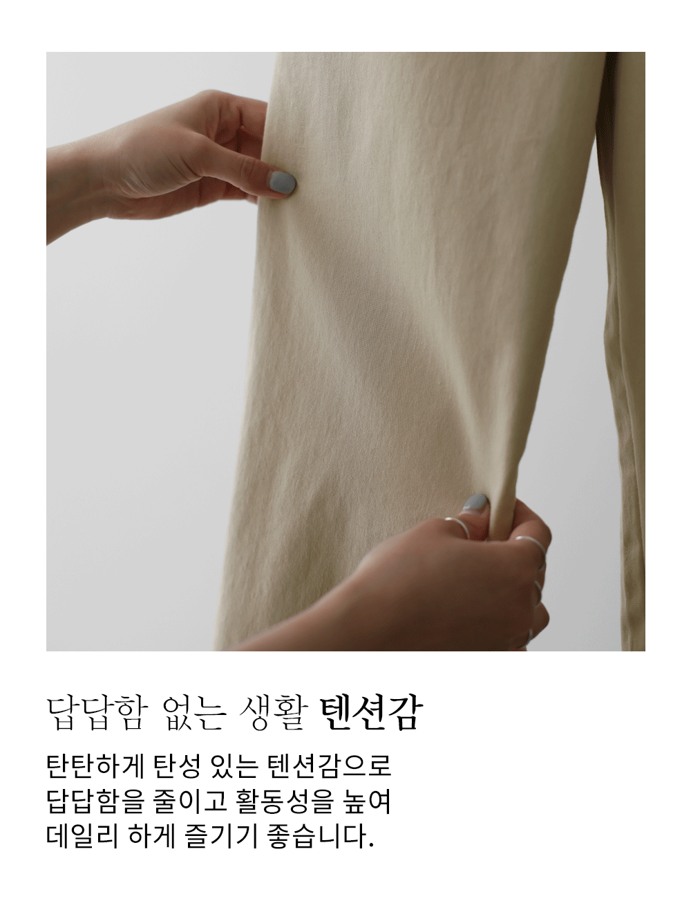 부드러운 촉감의 코튼 소재에 신축성이 우수한 스판사를 혼합하여 제작하였습니다. 원단 자체가 가진 탄탄한 힘이 다리 라인을 안정감 있게 잡아주면서도, 몸의 움직임에 따라 유연하게 늘어나는 복원력이 매우 훌륭합니다. 피부 자극이 적은 내추럴한 텍스처로 사계절 내내 쾌적하게 착용하기 좋으며 은은한 텐션감이 고급스러운 실루엣을 완성해 줍니다.