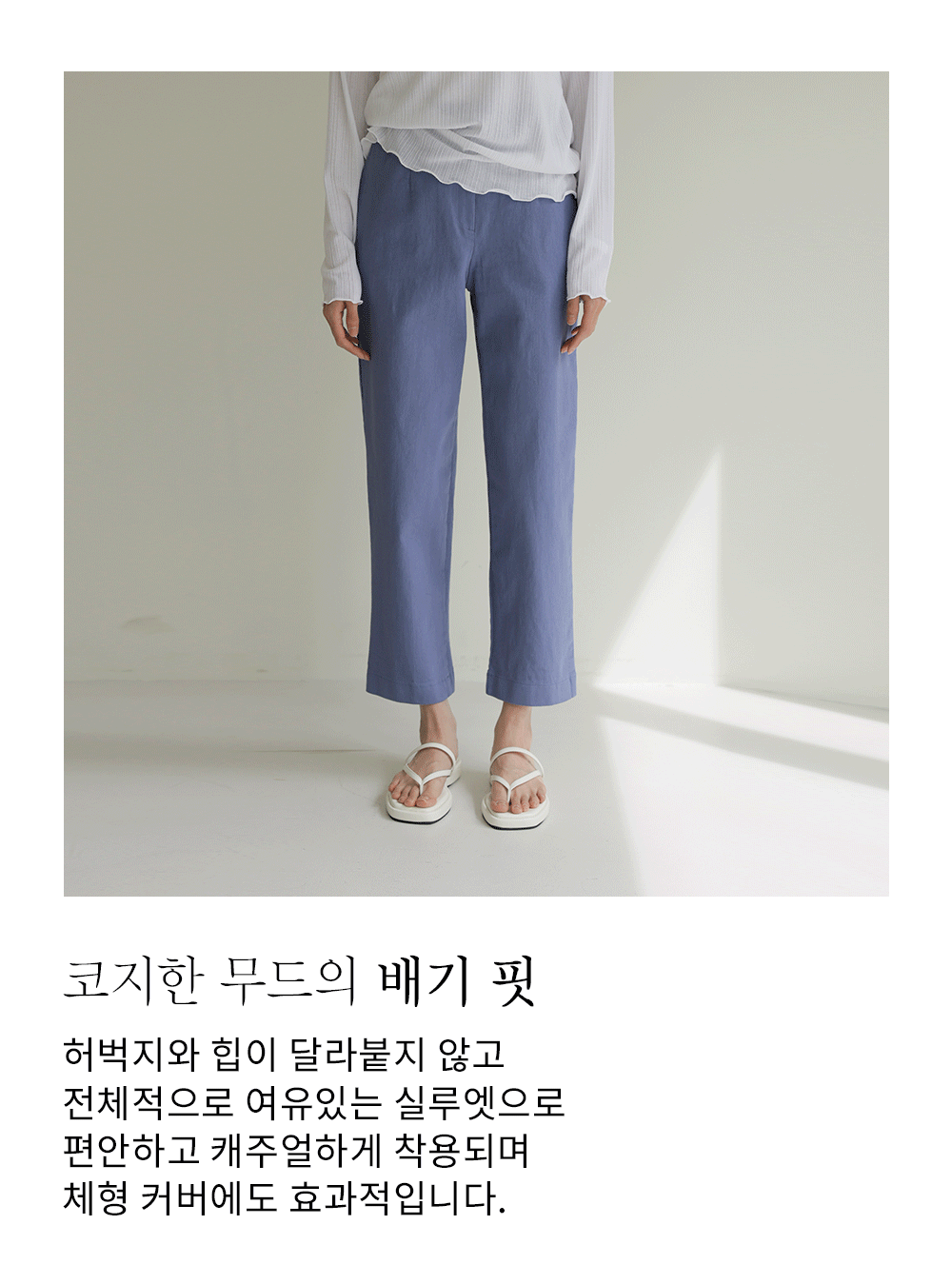 군더더기 없이 깔끔하게 떨어지는 배기 핏으로 하체 고민을 시원하게 해결해 드릴 팬츠 아이템이에요. 이 팬츠는 탄탄한 코튼 베이스에 스판이 함유되어 무릎 나옴 걱정은 덜어주면서도 움직임은 한결 가볍게 만들어준답니다.