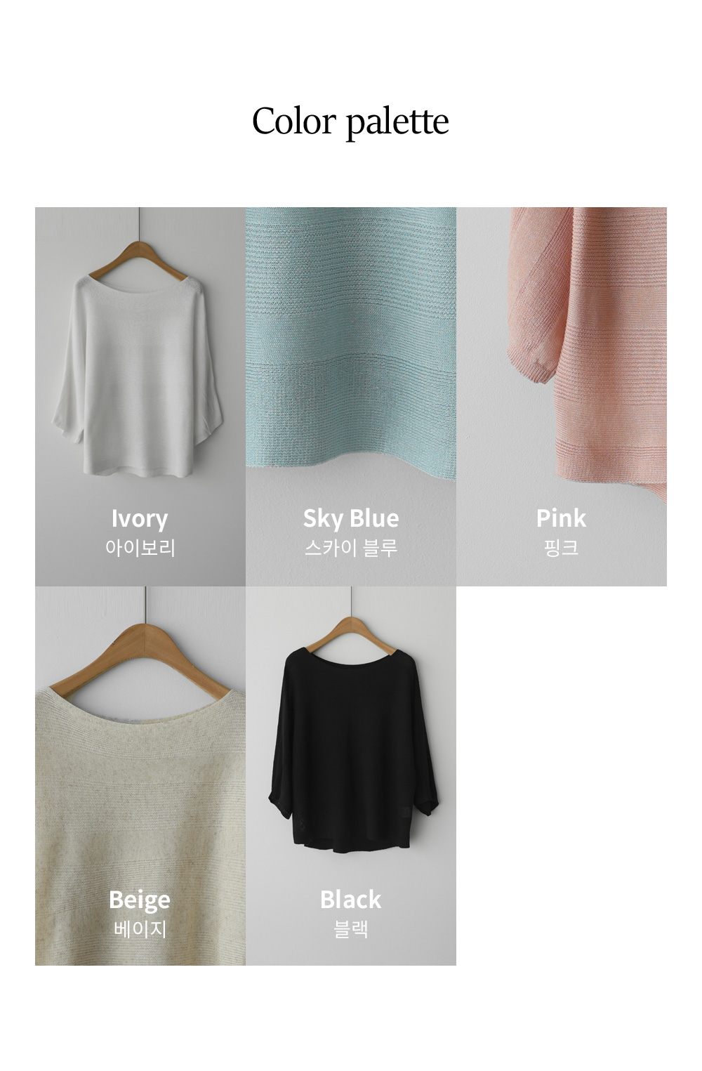 일상에서 세련된 분위기로 하루의 룩을 완성해 주는 니트 아이템 소개해요. 블랙, 베이지, 스카이블루, 아이보리, 핑크까지 총 다섯 가지의 다채로운 컬러 구성으로 준비했구요.