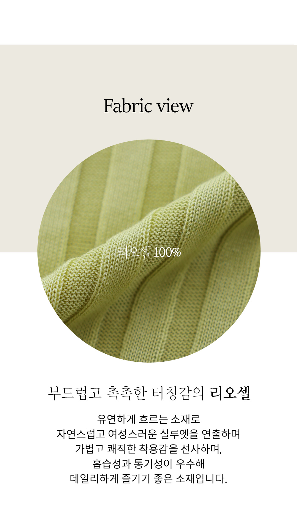 친환경적인 리오셀 소재를 사용하여 실크처럼 부드러운 촉감과 은은한 광택감을 동시에 느끼실 수 있어요. 흡습성이 뛰어나 피부에 끈적임 없이 닿으며, 유연하고 탄탄한 조직감 덕분에 장시간 착용해도 피부가 편안하고 실루엣이 고급스럽게 유지되는 프리미엄 소재예요. ![]() MD가 답하는 안심 Q&A