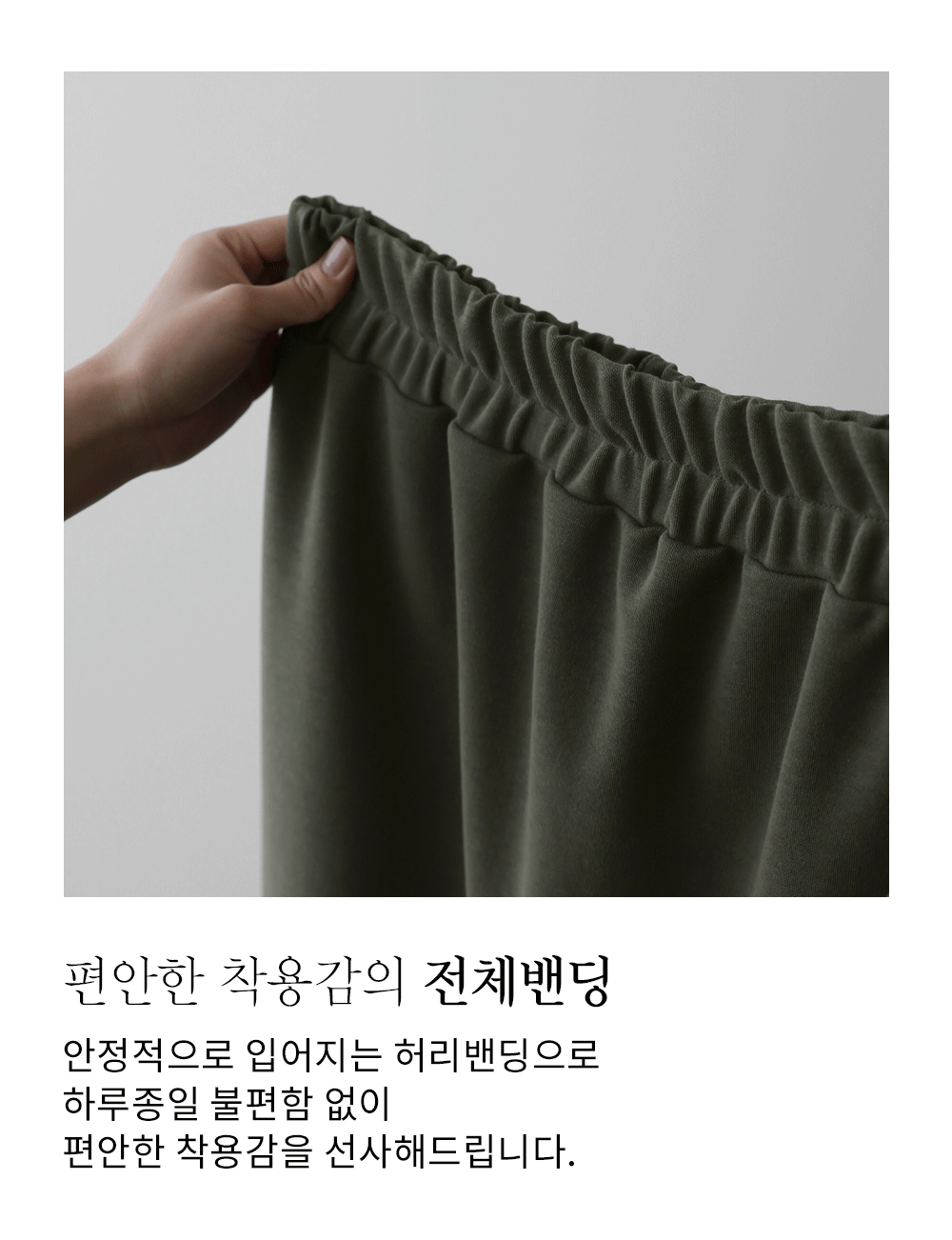 코튼의 쾌적함에 폴리의 매끈함, 그리고 약간의 스판이 더해져 유연하면서도 탄탄한 힘이 느껴지는 소재예요. 피부에 닿는 느낌이 부드럽고 가벼워서 하루 종일 착용해도 자극 없이 편안하답니다. 원단 자체의 복원력이 좋아 핏 변형 걱정을 덜어주며, 비침 없이 하체를 든든하게 감싸주어 데일리로 활용하기 아주 좋은 고퀄리티 소재예요. ![]() 밴딩 가이드 보러가기→ ![]() MD가 답하는 안심 Q&A