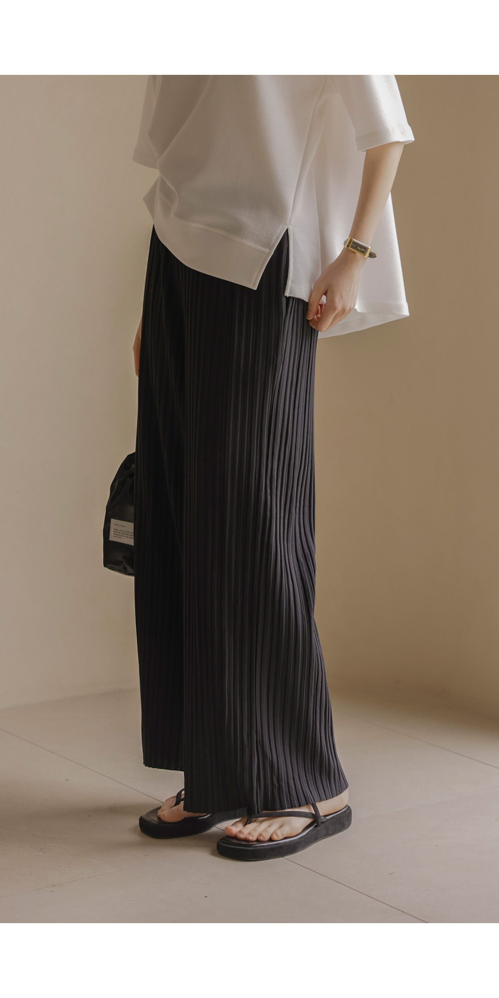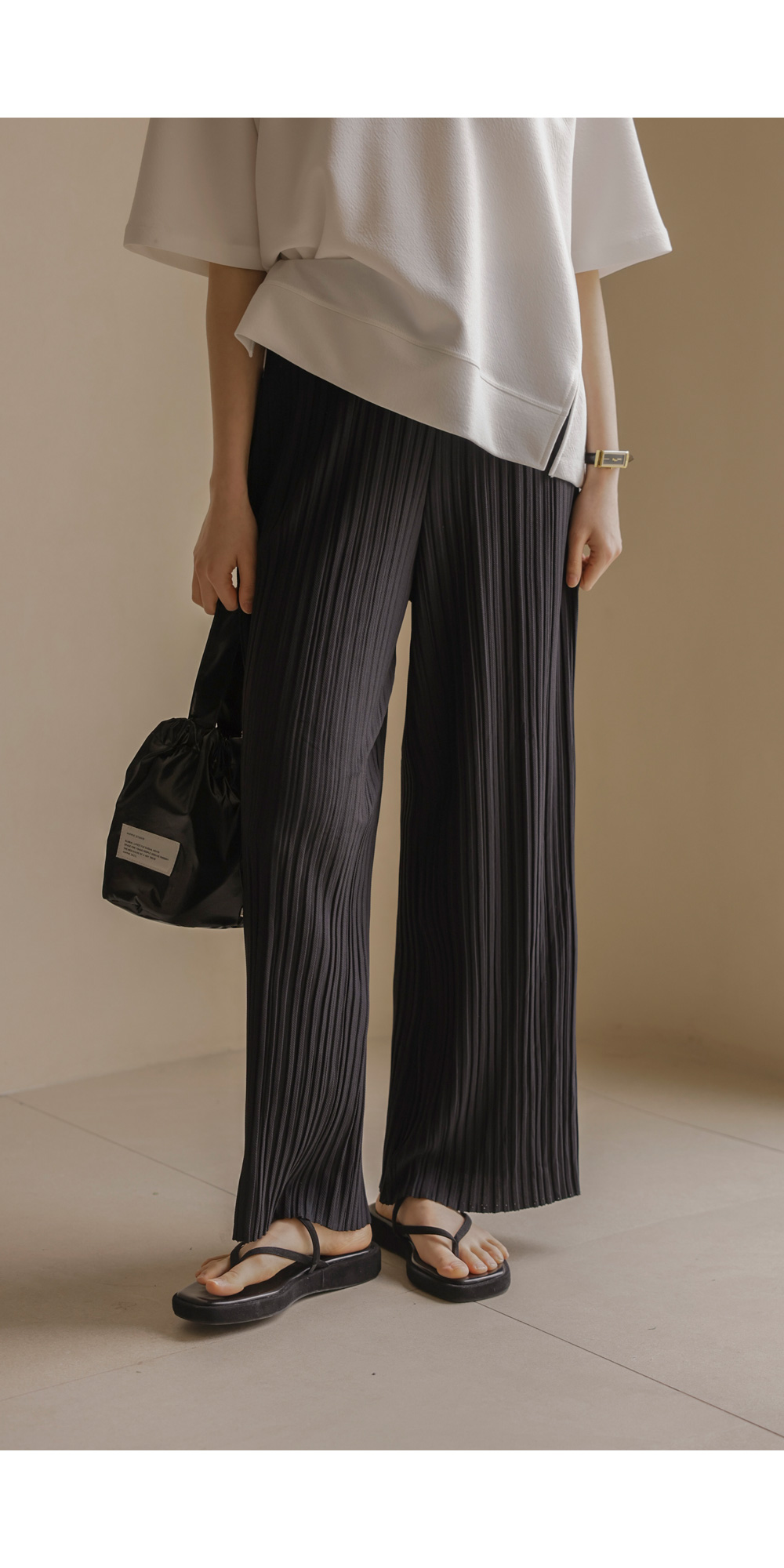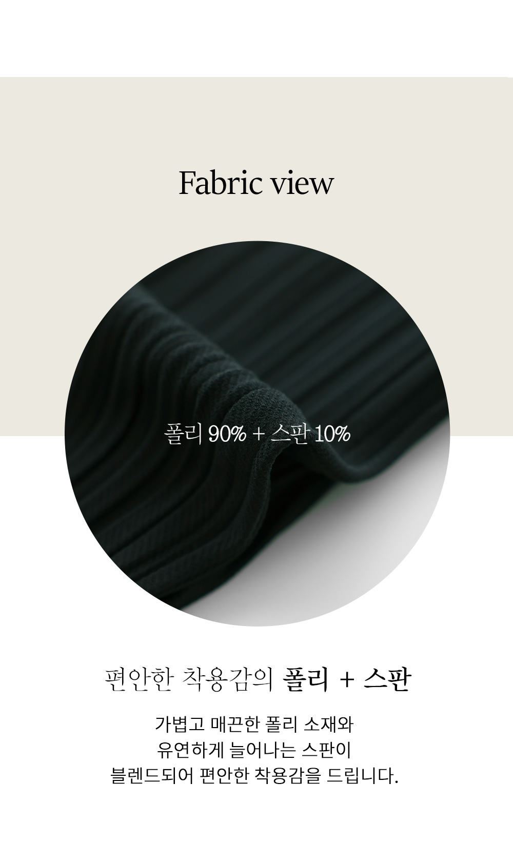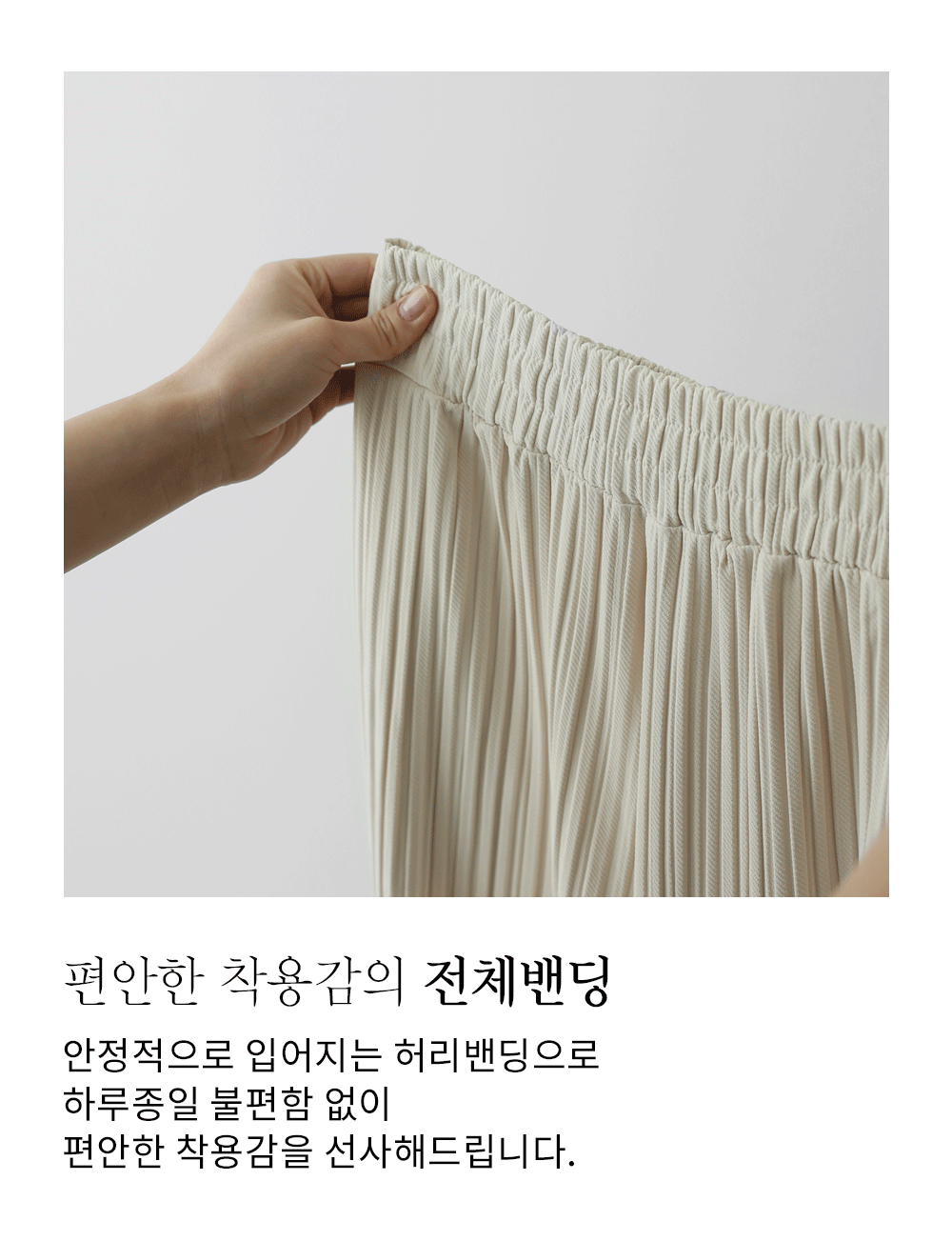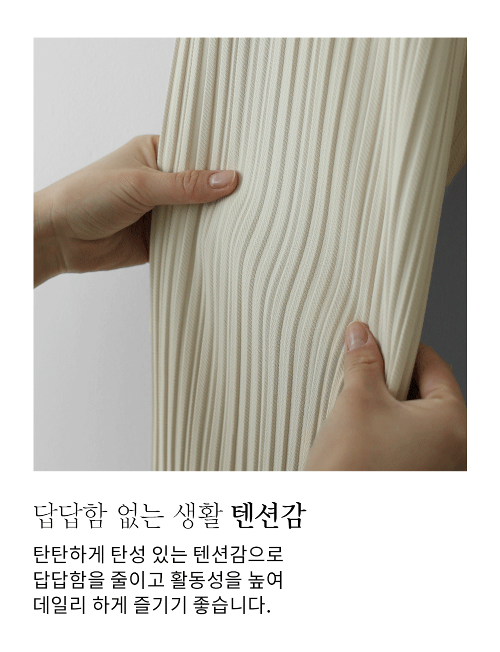 매끈한 촉감에 텐션감이 훌륭한 고퀄리티의 폴리와 스판 혼방 소재를 사용했어요. 두께가 얇고 가벼워 피부에 닿을 때의 청량함이 남다르며, 찰랑찰랑하게 흐르는 소재감이 걸을 때마다 기분 좋은 리듬감을 만들어줍니다. 몸의 굴곡을 도드라지게 하지 않고 매끄럽게 보정해 주는 탄탄한 주름 결이 특징이에요. ![]() 밴딩 가이드 보러가기→ ![]() MD가 답하는 안심 Q&A