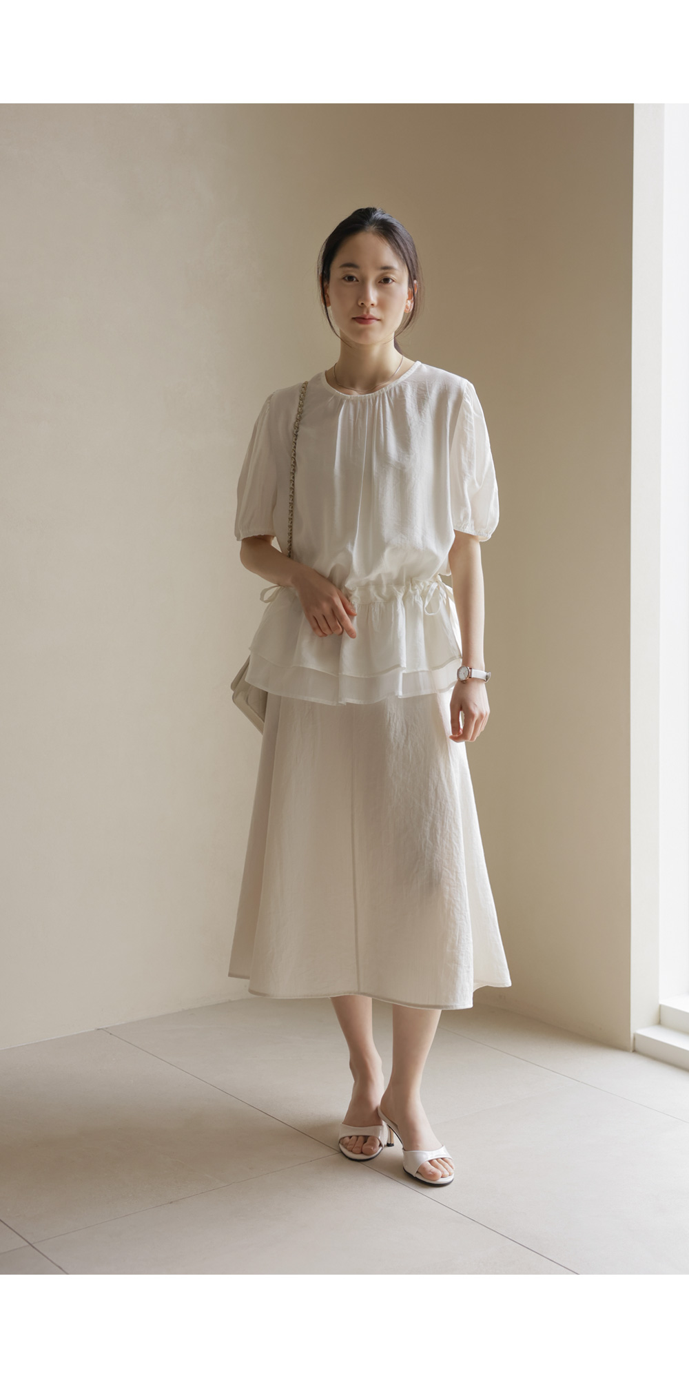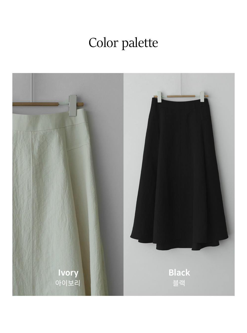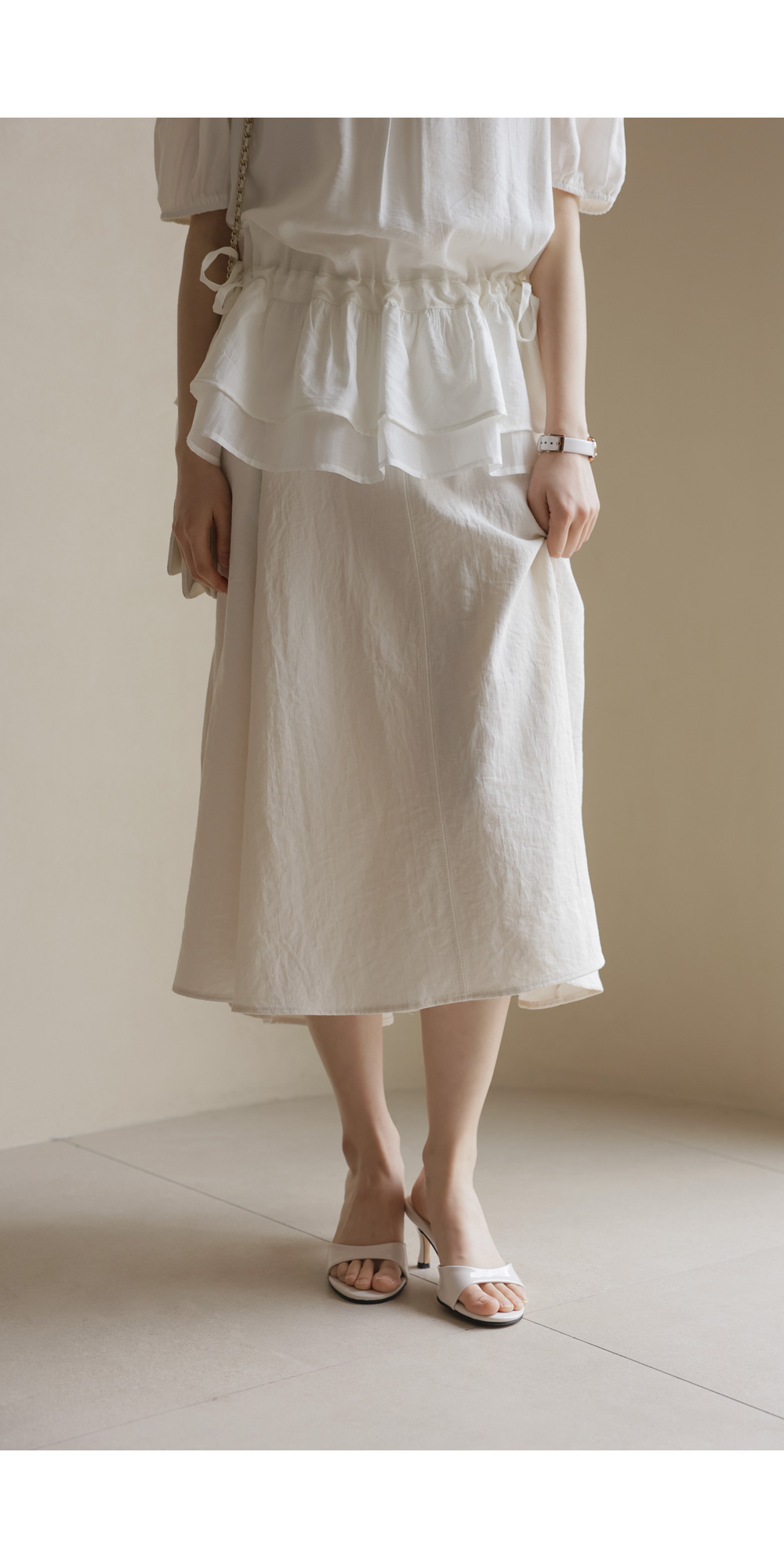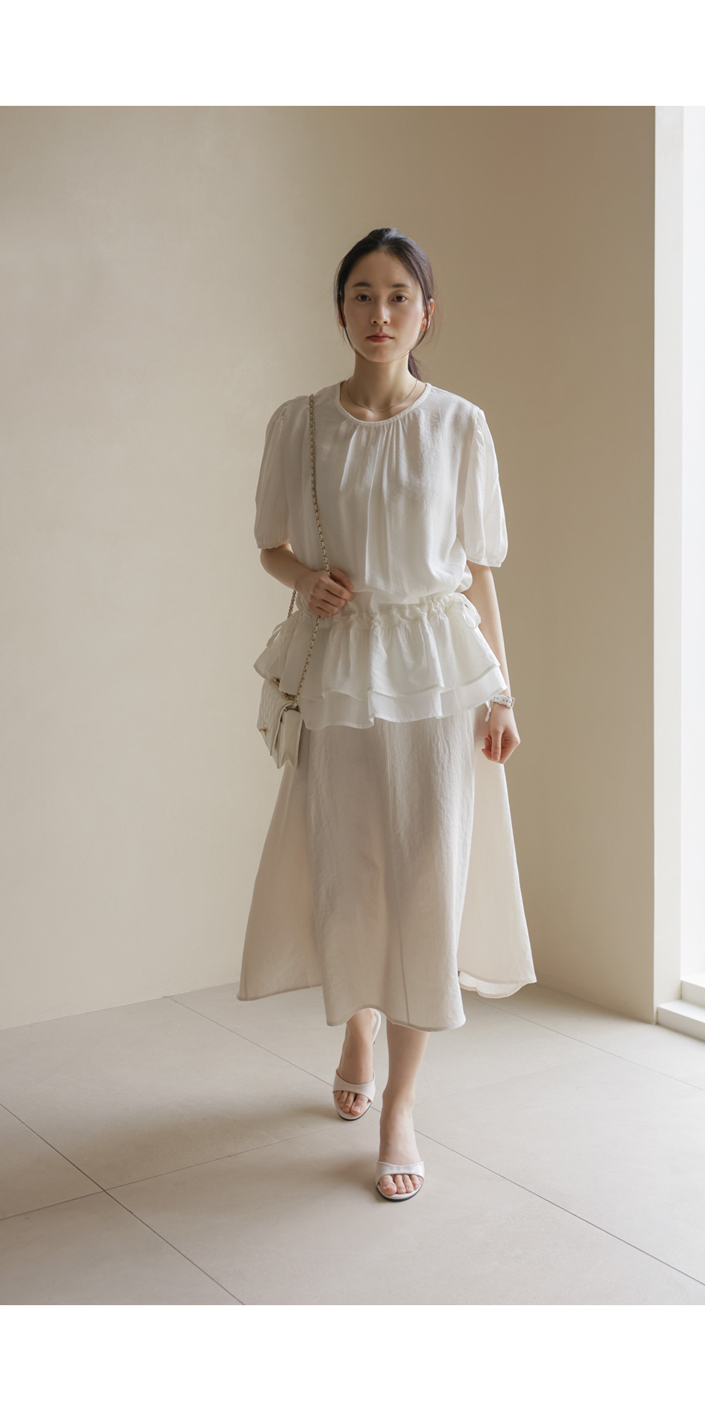 스커트 하나만으로도 드라마틱한 실루엣을 완성할 수 있는 아이템이에요. 전체적으로 차분하게 떨어지다가 밑단에서 풍성하게 퍼지는 플레어 라인이 여성스러운 무드를 극대화해 준답니다.