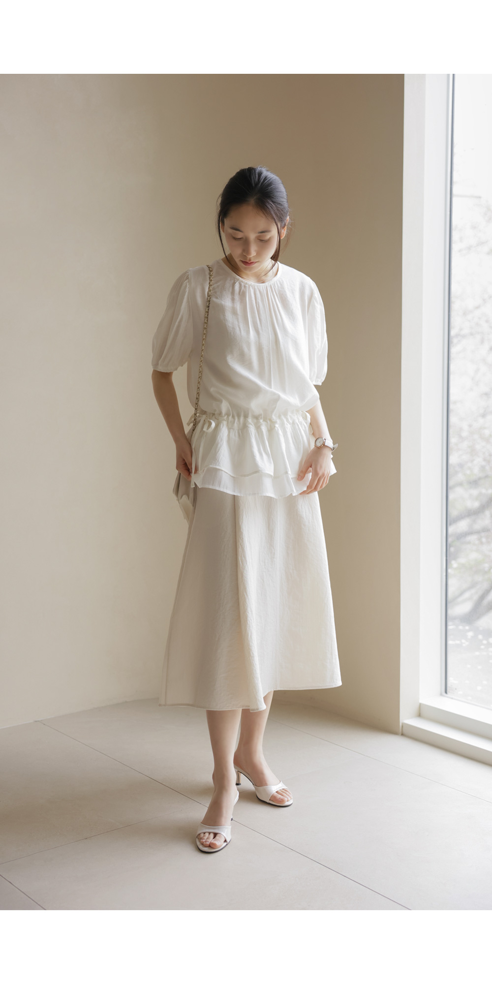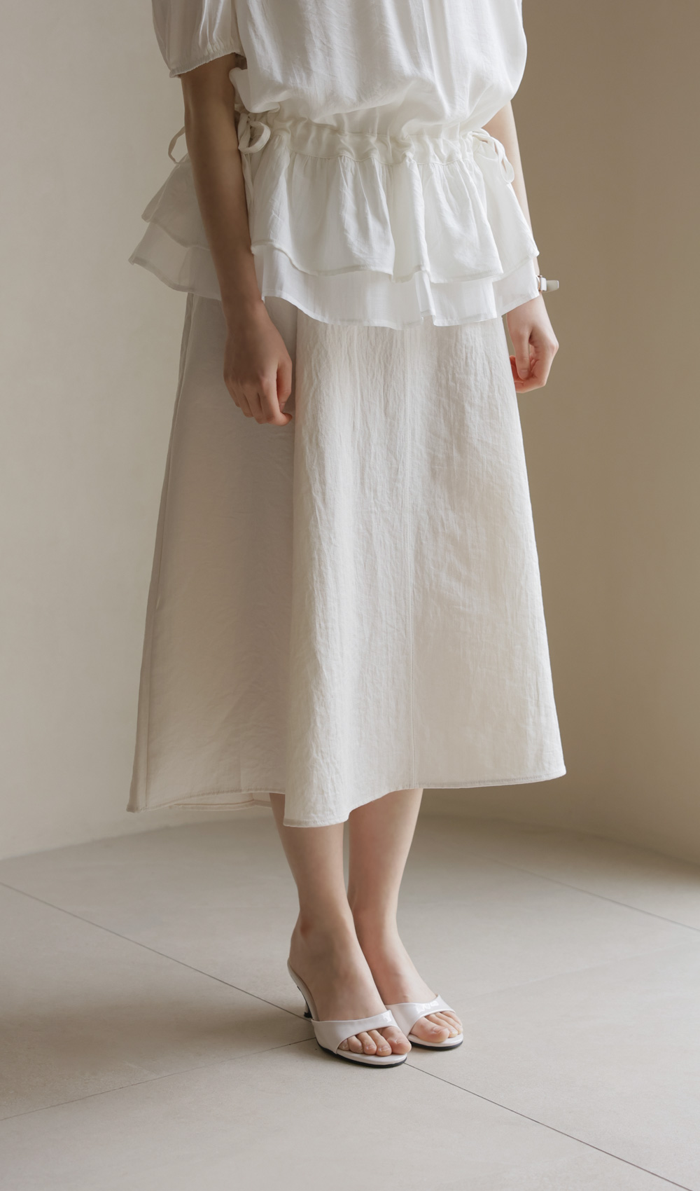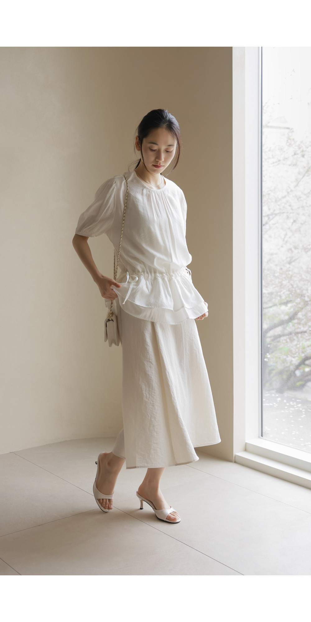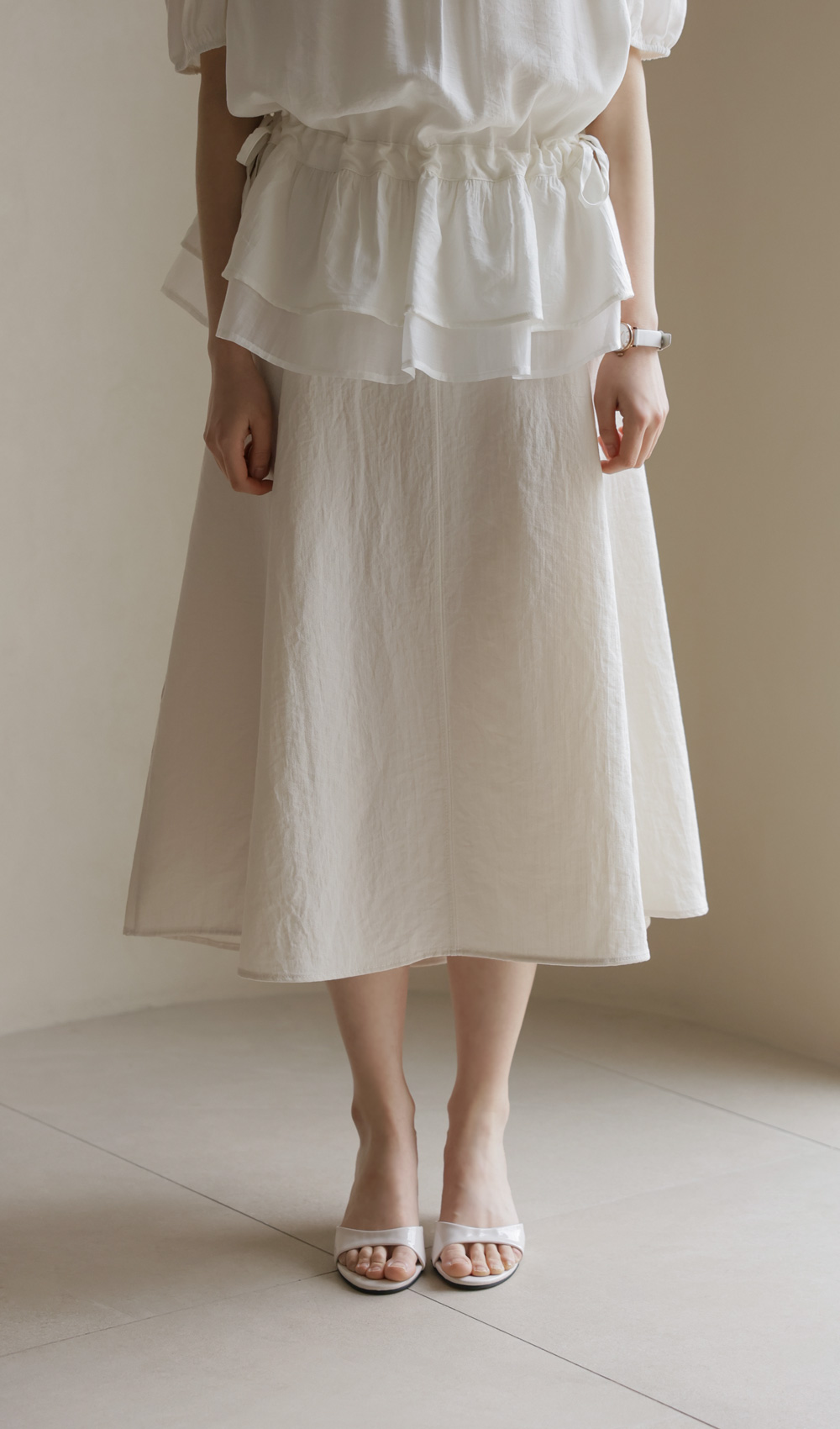 스커트 하나만으로도 드라마틱한 실루엣을 완성할 수 있는 아이템이에요. 전체적으로 차분하게 떨어지다가 밑단에서 풍성하게 퍼지는 플레어 라인이 여성스러운 무드를 극대화해 준답니다.