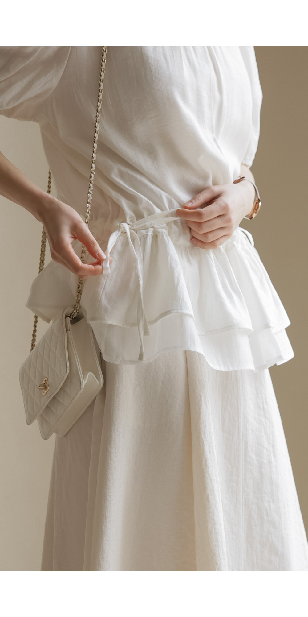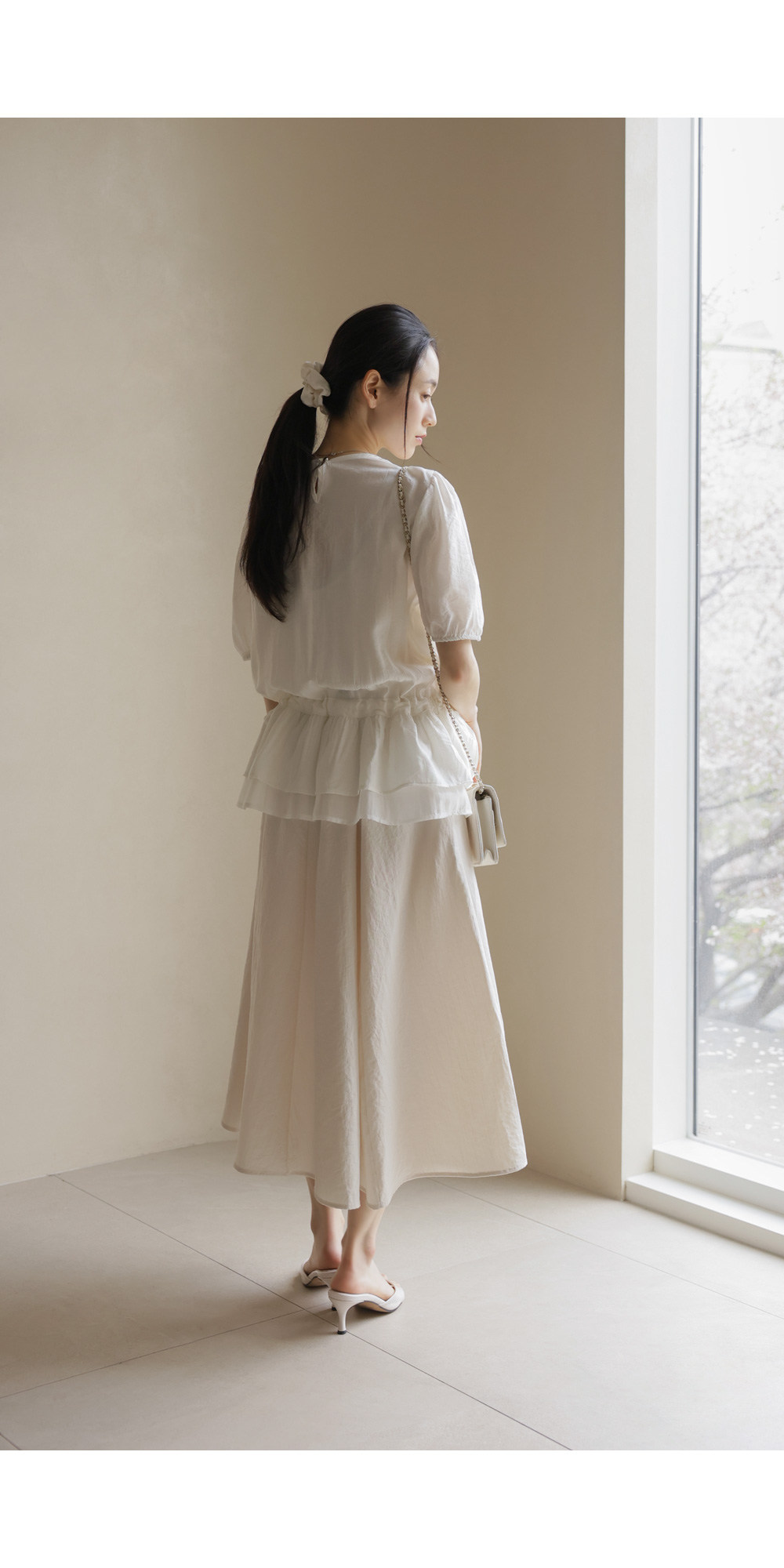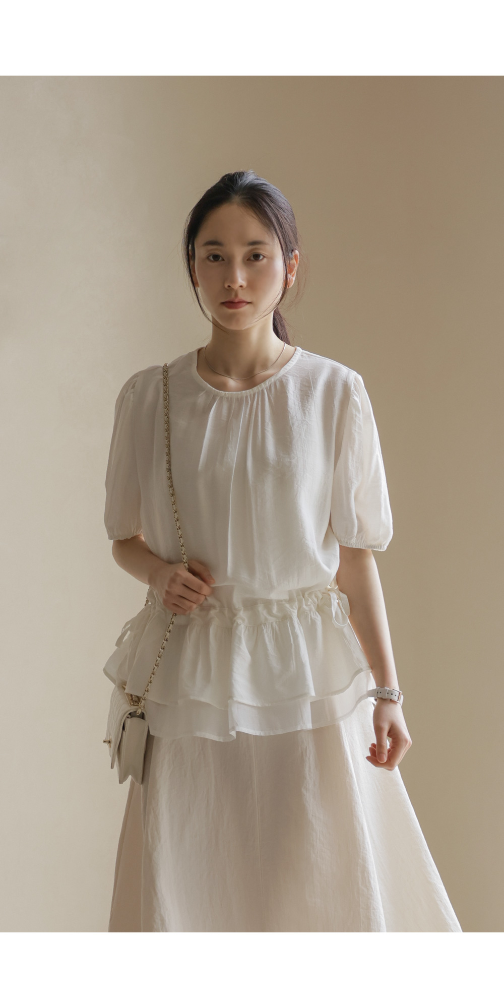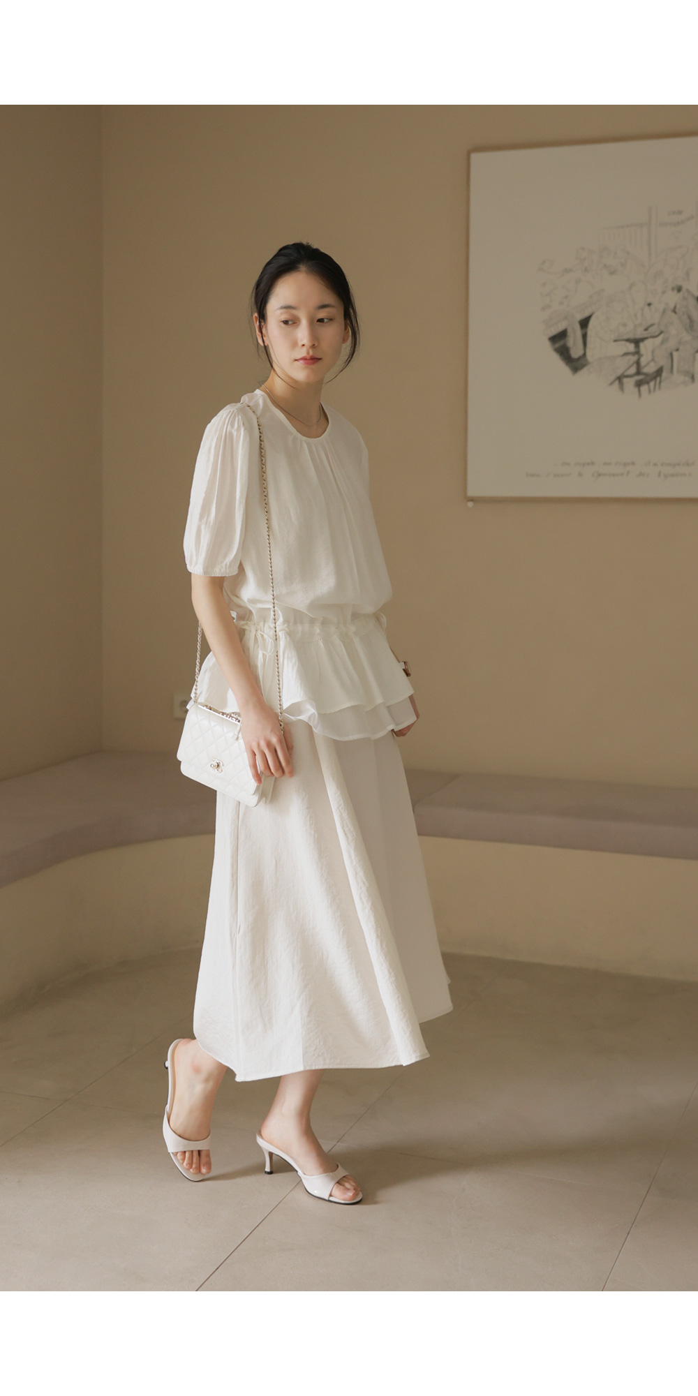 스커트 하나만으로도 드라마틱한 실루엣을 완성할 수 있는 아이템이에요. 전체적으로 차분하게 떨어지다가 밑단에서 풍성하게 퍼지는 플레어 라인이 여성스러운 무드를 극대화해 준답니다.
