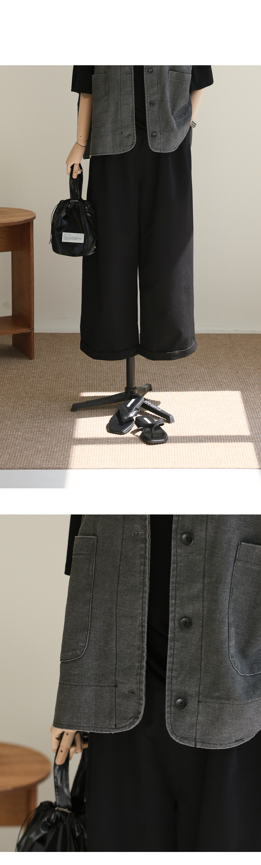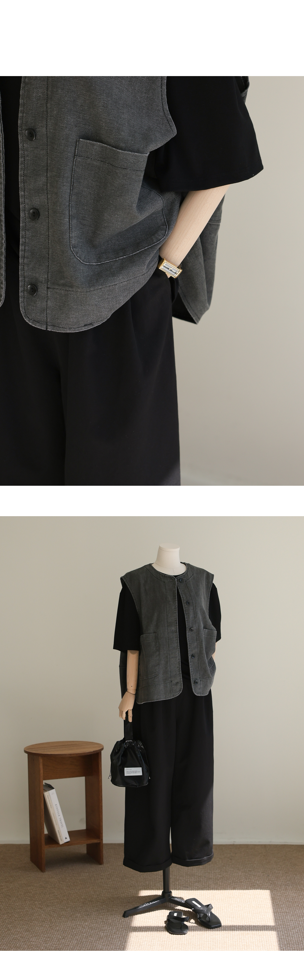 간절기부터 여름까지 코디의 허전함을 채워줄 가장 실용적인 아이템은 바로 조끼 아우터 아닐까 싶어요. 부드러운 곡선의 라운드넥으로 제작되어 셔츠나 기본 티셔츠 어디에나 단정하게 어우러져요.