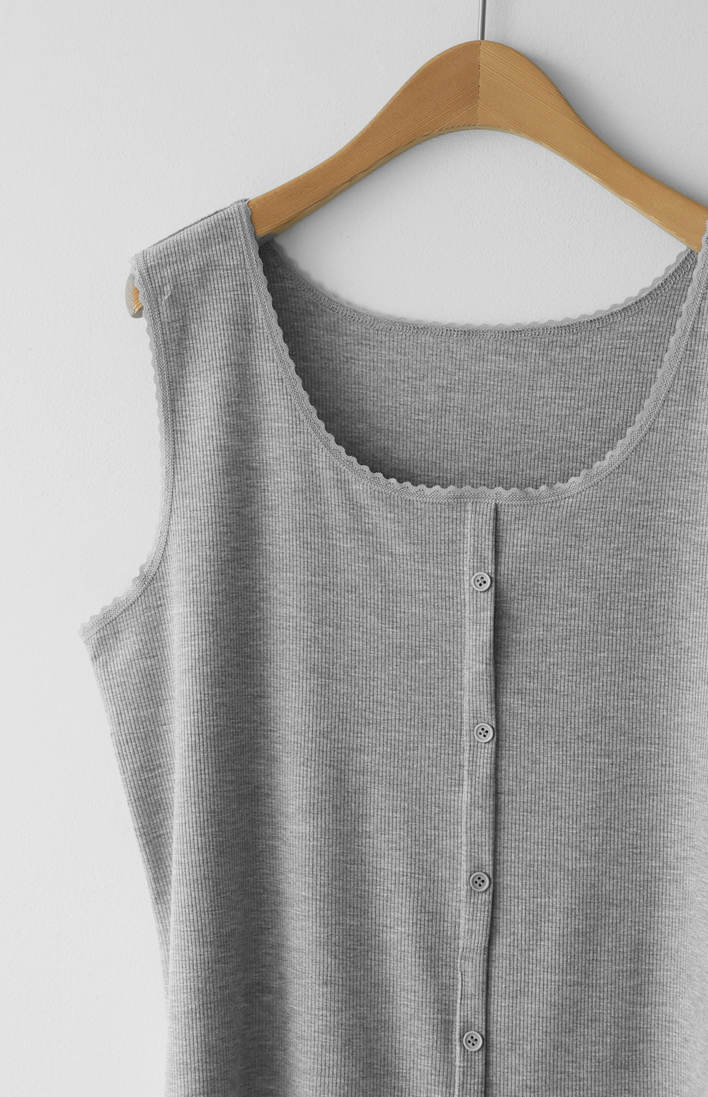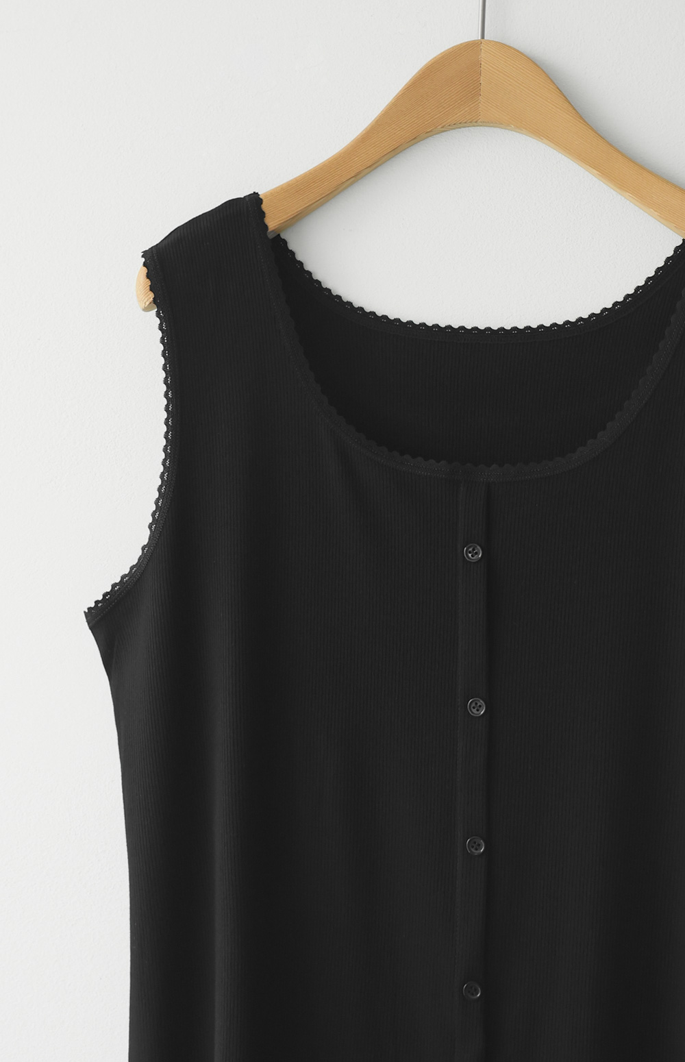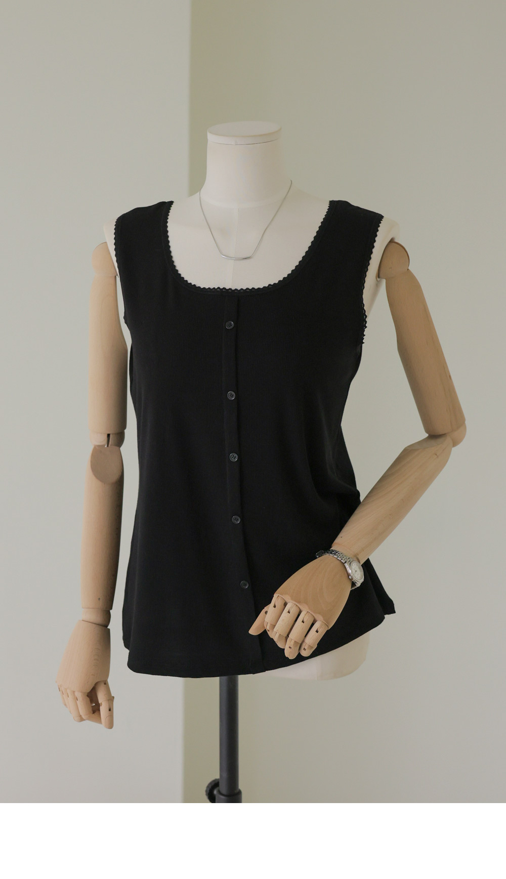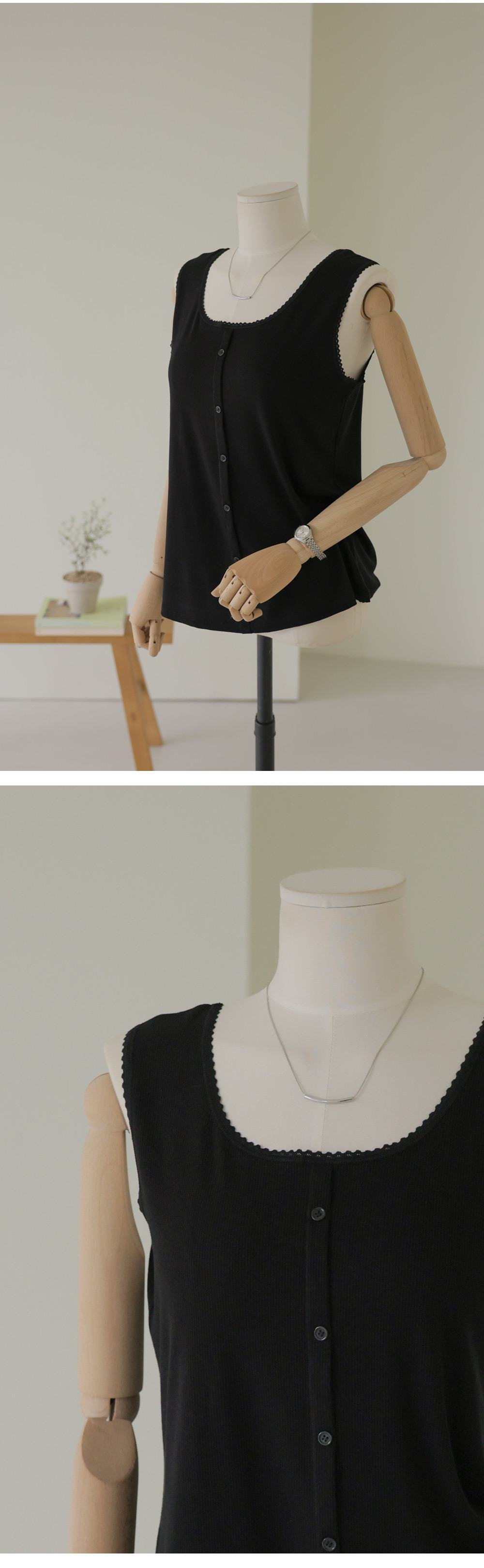 무더운 여름부터 간절기 이너까지 활용도가 무궁무진한 슬리브리스 아이템을 소개해 드려요. 이번 나시는 단순히 받쳐 입는 용도를 넘어, 넥라인과 소매 끝에 섬세한 레이스 마감을 더해 우아한 무드를 연출해 주는데요. 프론트 중앙의 페이크 단추가 시선을 모아주어 상체가 더욱 슬림해 보이는 효과를 드린답니다.