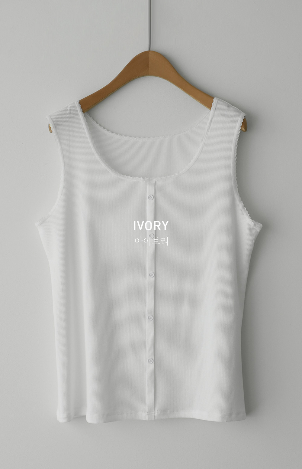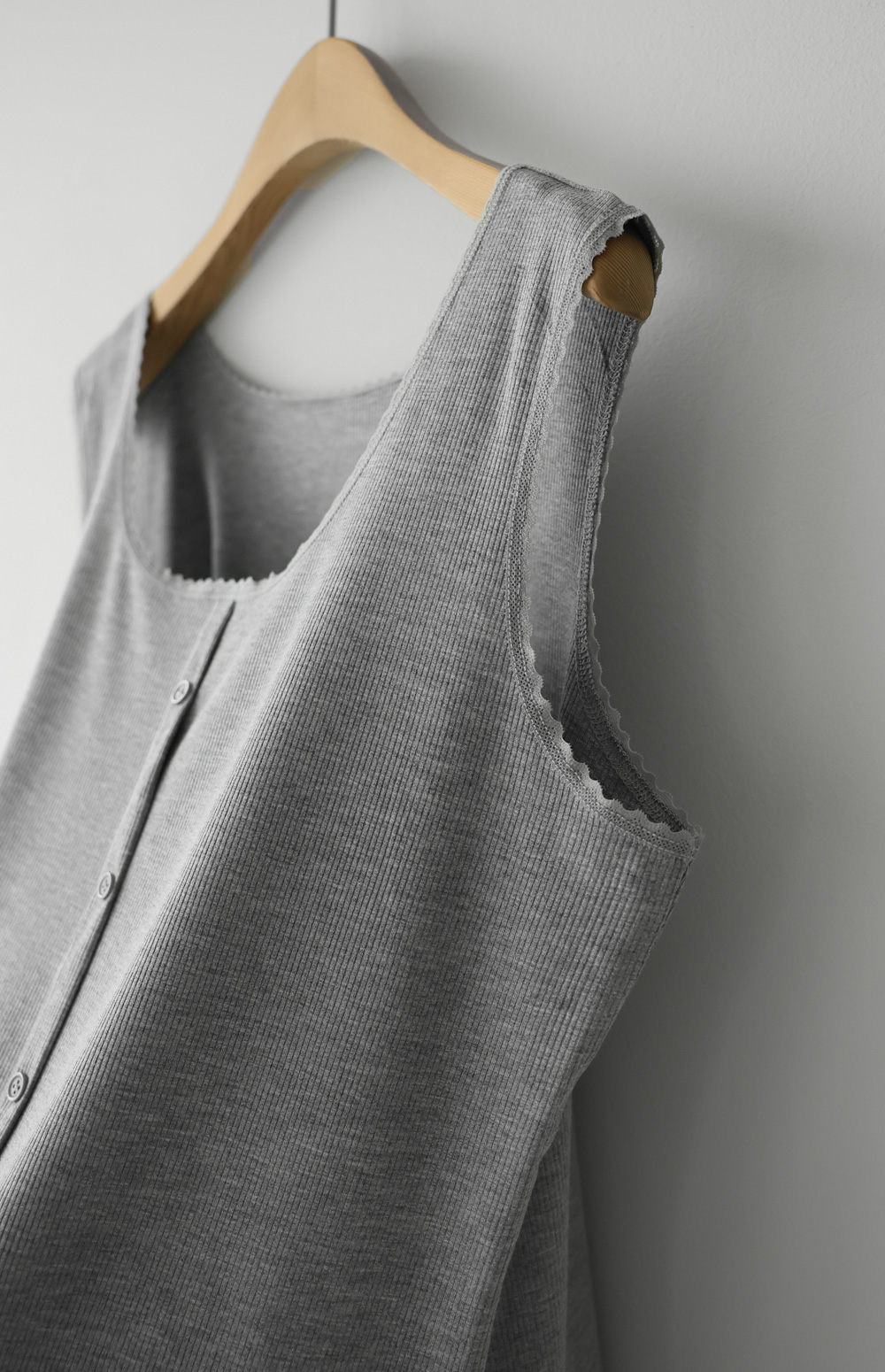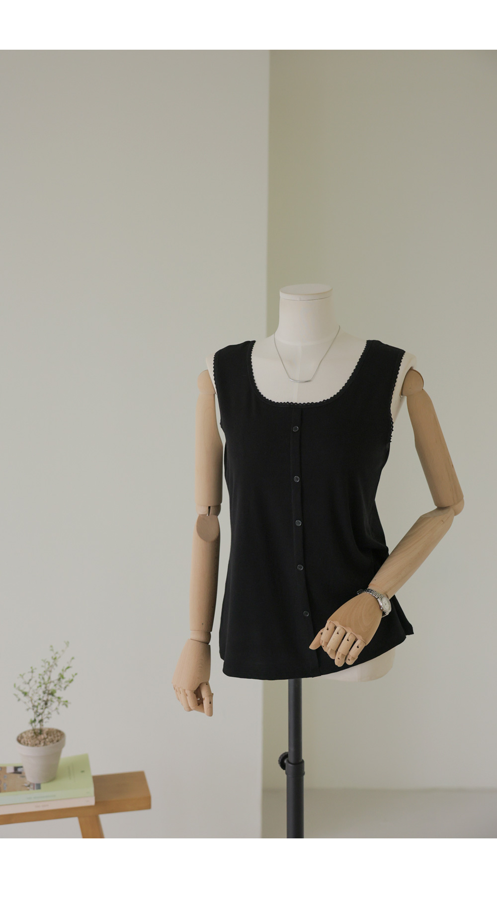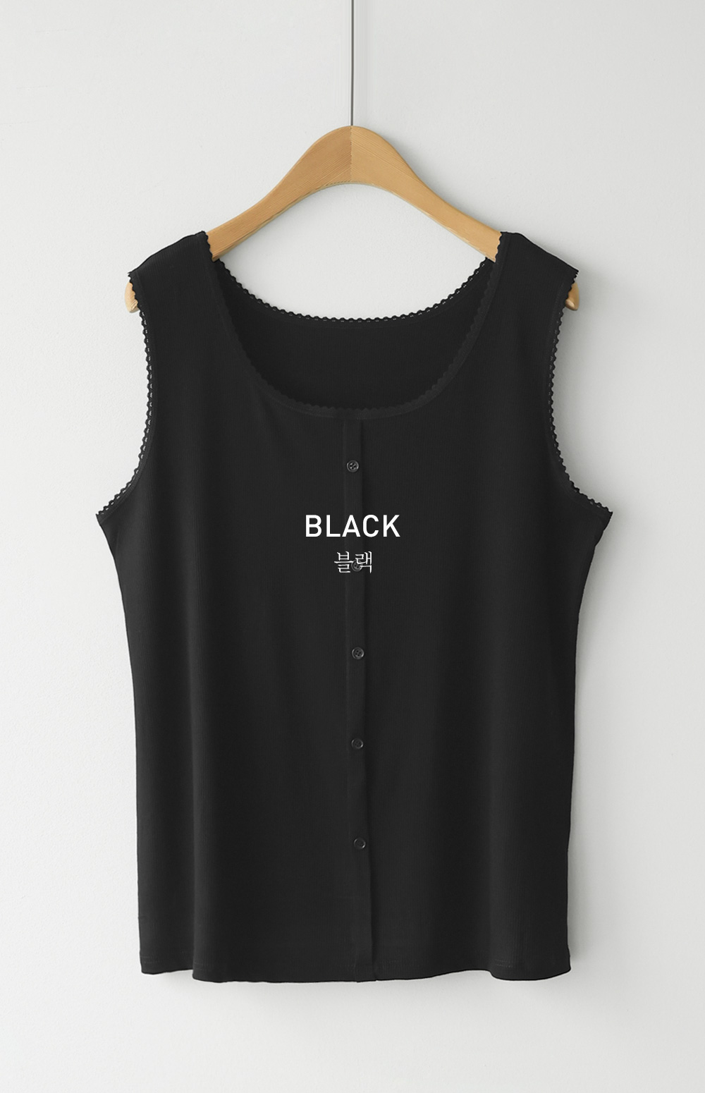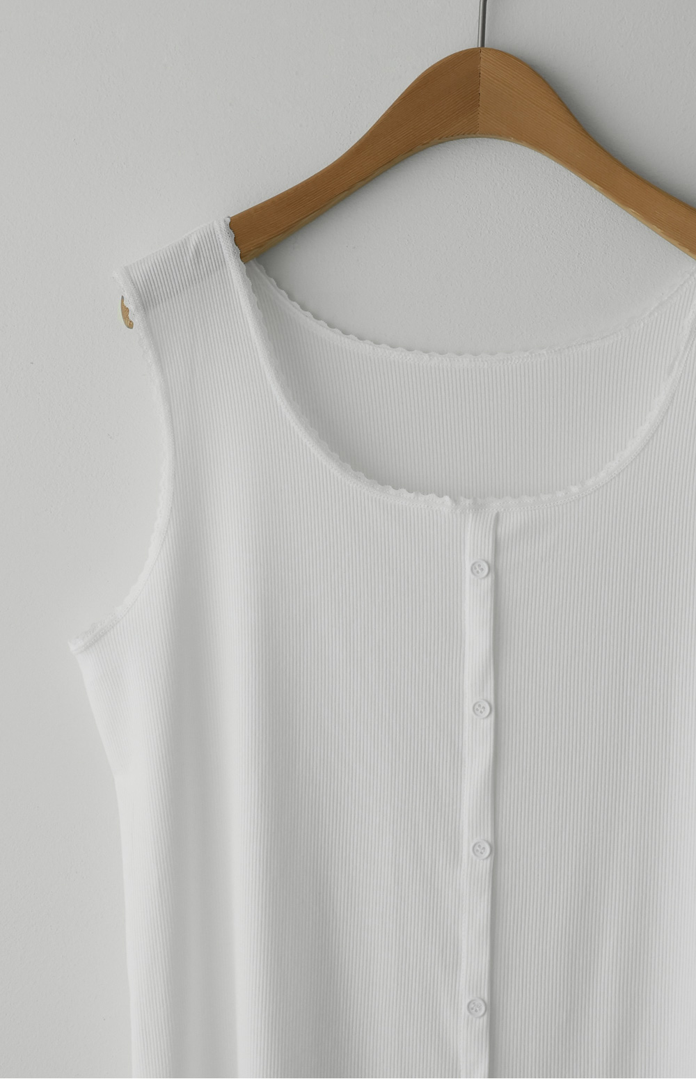 무더운 여름부터 간절기 이너까지 활용도가 무궁무진한 슬리브리스 아이템을 소개해 드려요. 이번 나시는 단순히 받쳐 입는 용도를 넘어, 넥라인과 소매 끝에 섬세한 레이스 마감을 더해 우아한 무드를 연출해 주는데요. 프론트 중앙의 페이크 단추가 시선을 모아주어 상체가 더욱 슬림해 보이는 효과를 드린답니다.