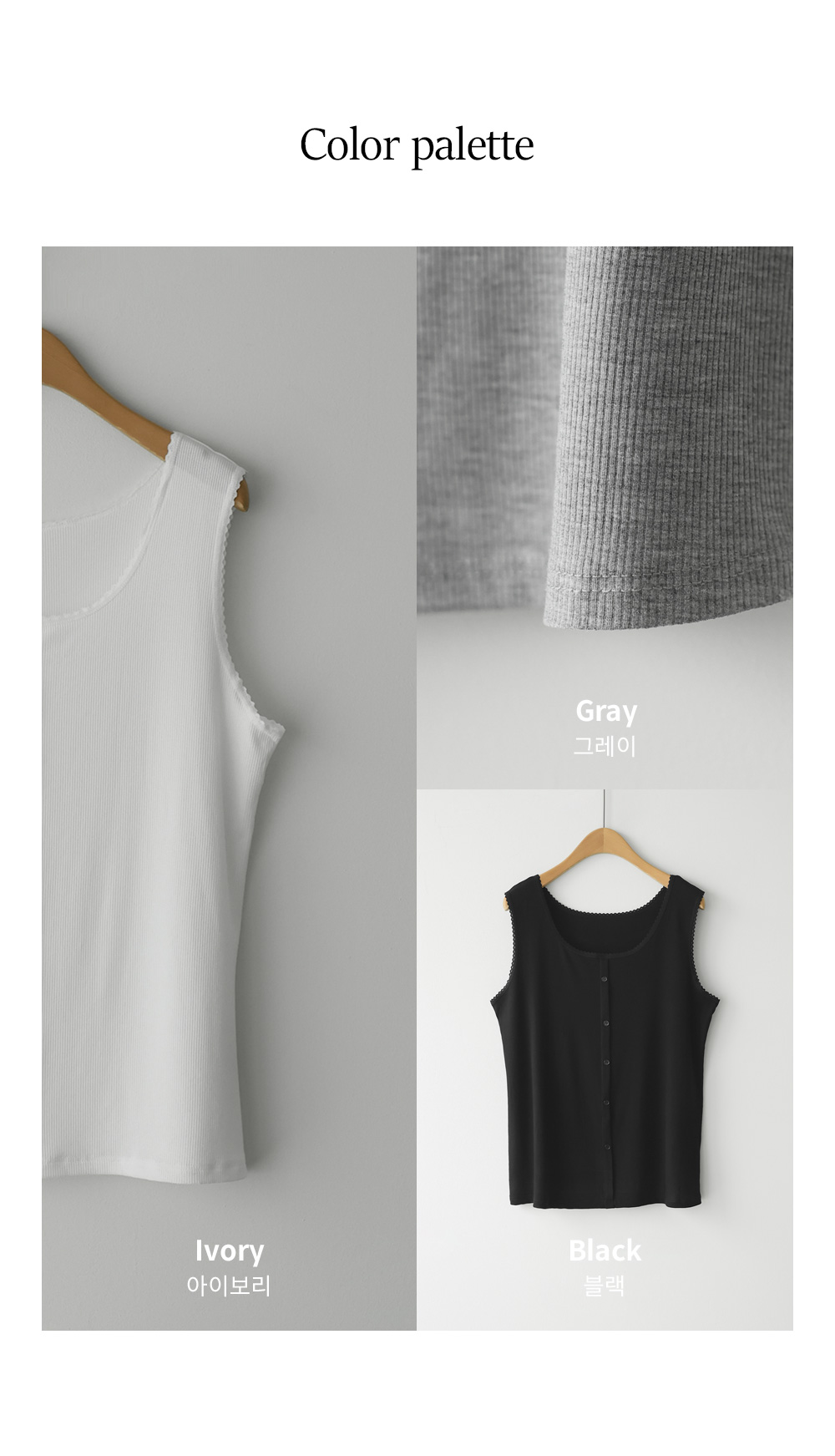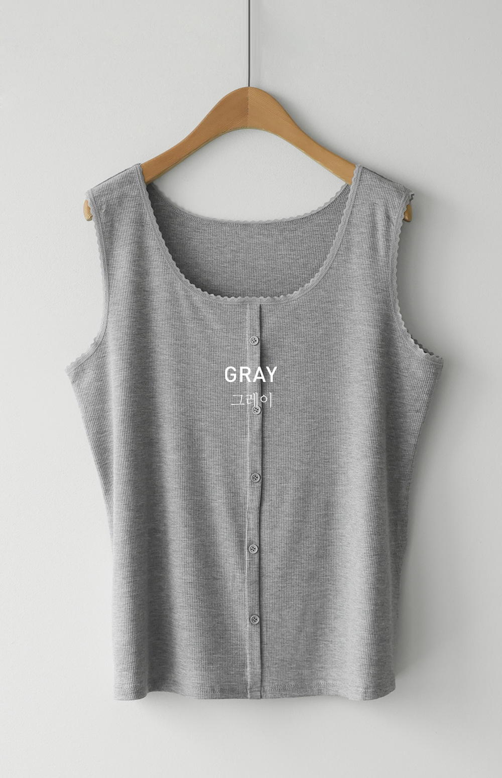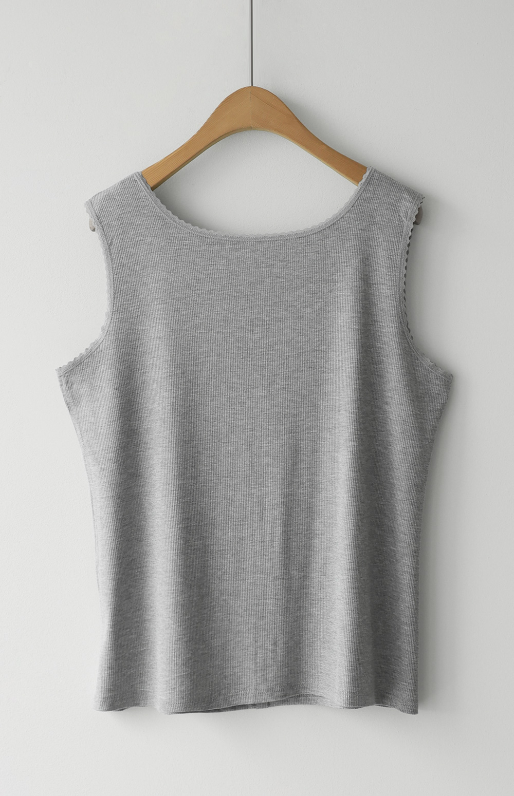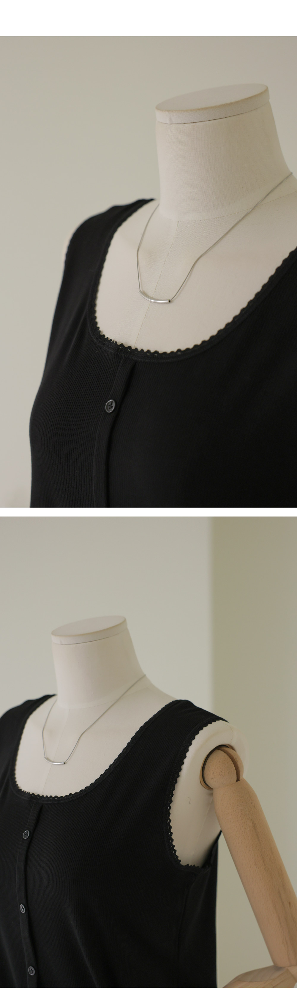 무더운 여름부터 간절기 이너까지 활용도가 무궁무진한 슬리브리스 아이템을 소개해 드려요. 이번 나시는 단순히 받쳐 입는 용도를 넘어, 넥라인과 소매 끝에 섬세한 레이스 마감을 더해 우아한 무드를 연출해 주는데요. 프론트 중앙의 페이크 단추가 시선을 모아주어 상체가 더욱 슬림해 보이는 효과를 드린답니다.