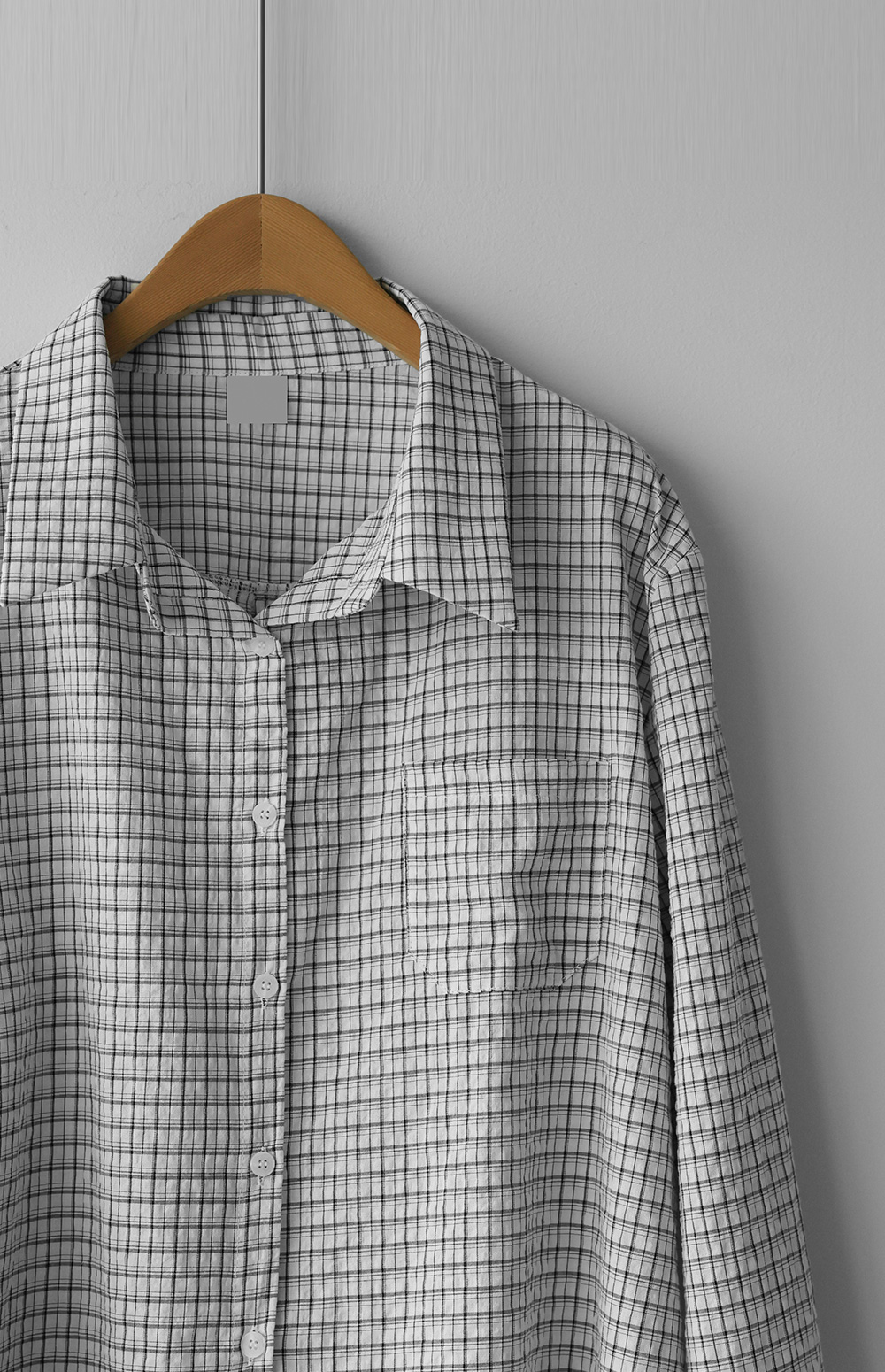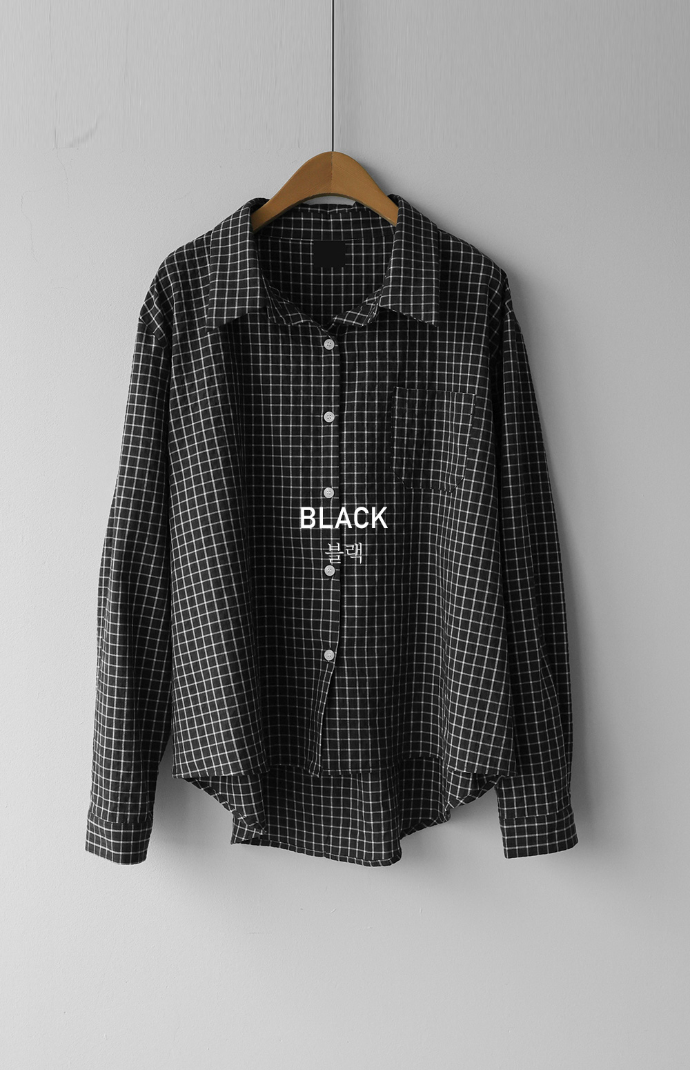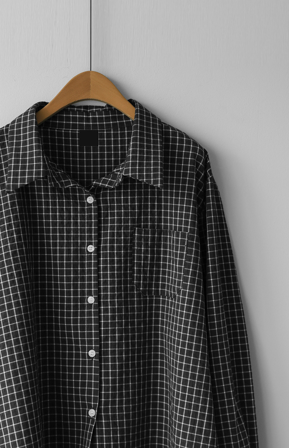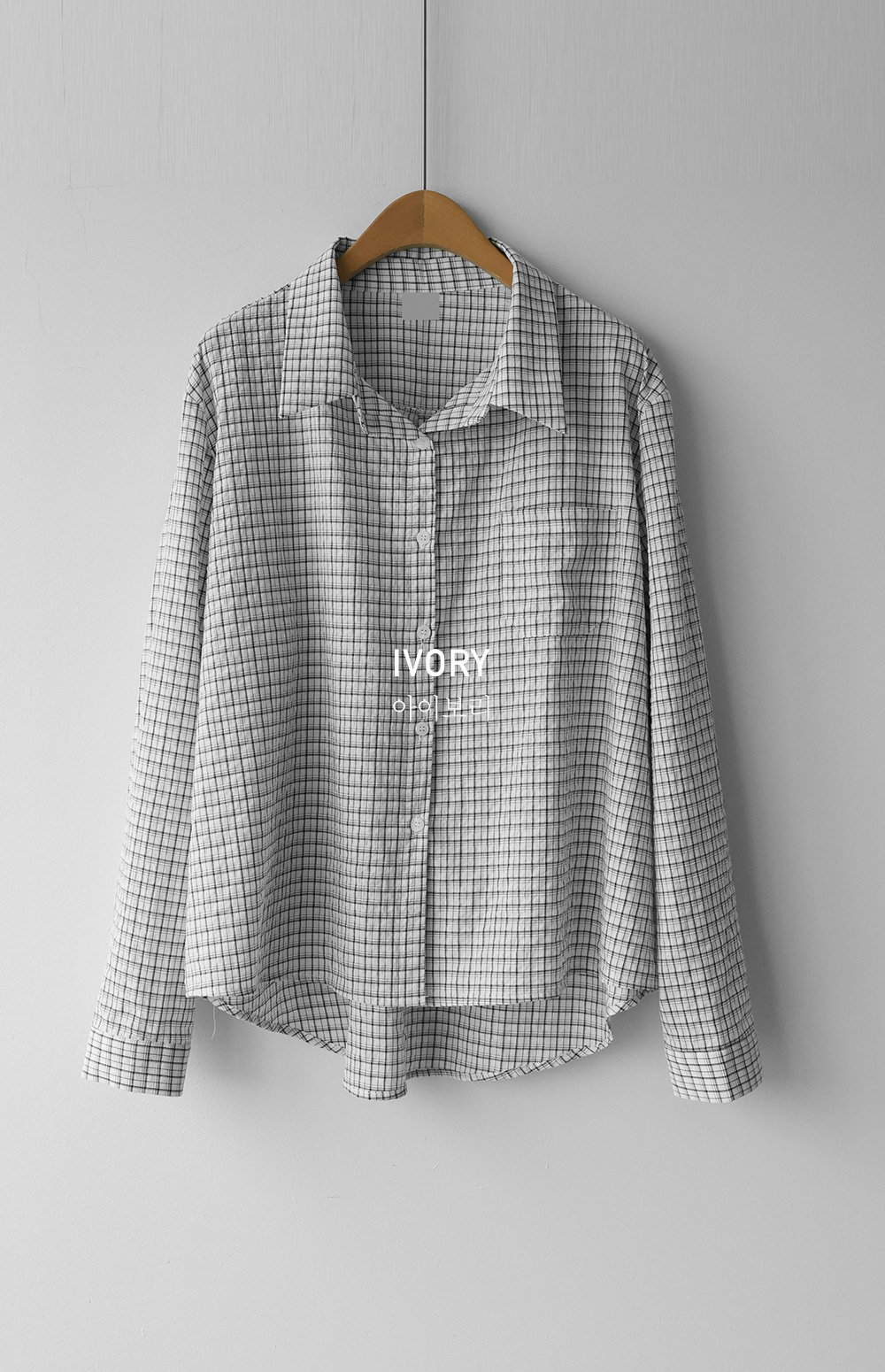 은은하게 포인트가 되는 '체크 패턴'과 하체 라인을 부드럽게 커버해 주는 '라운드 밑단'이 이 셔츠의 결정적인 포인트예요.