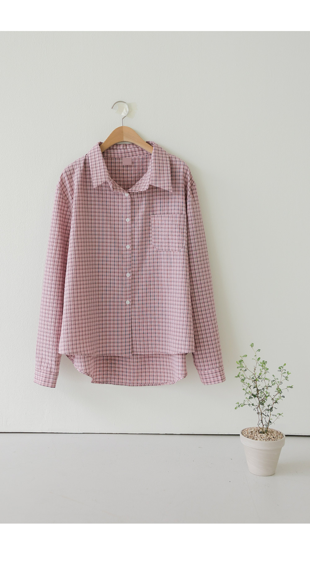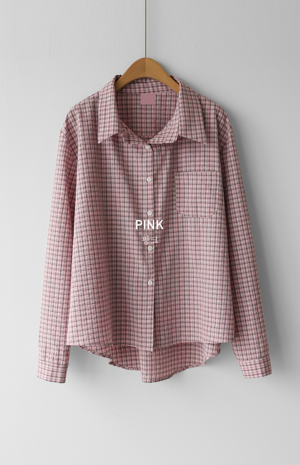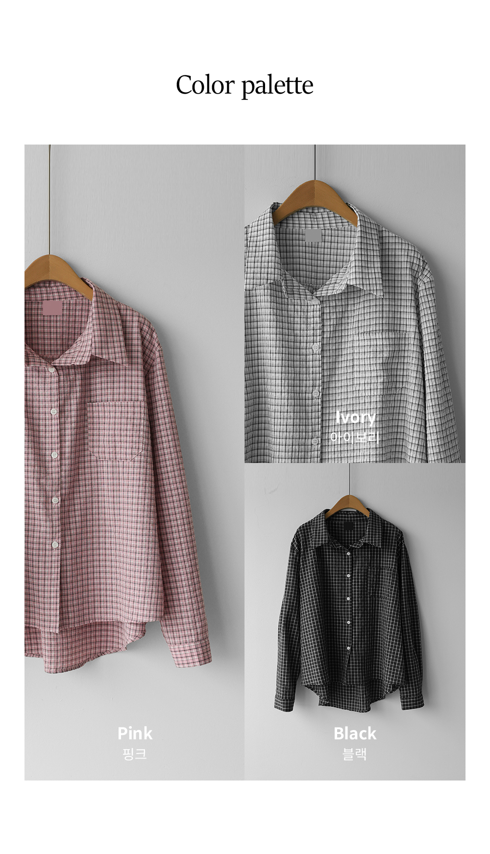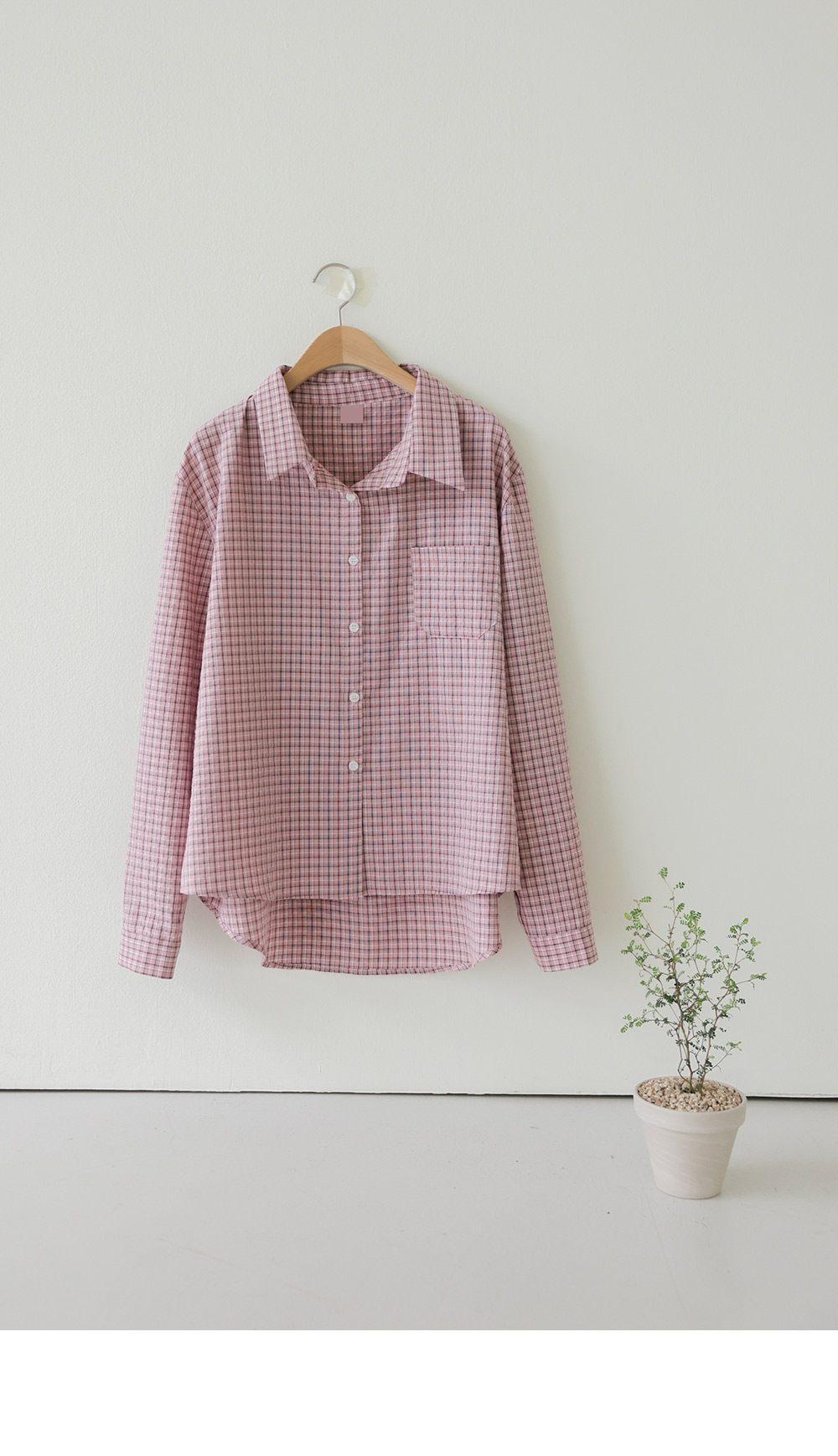 은은하게 포인트가 되는 '체크 패턴'과 하체 라인을 부드럽게 커버해 주는 '라운드 밑단'이 이 셔츠의 결정적인 포인트예요.