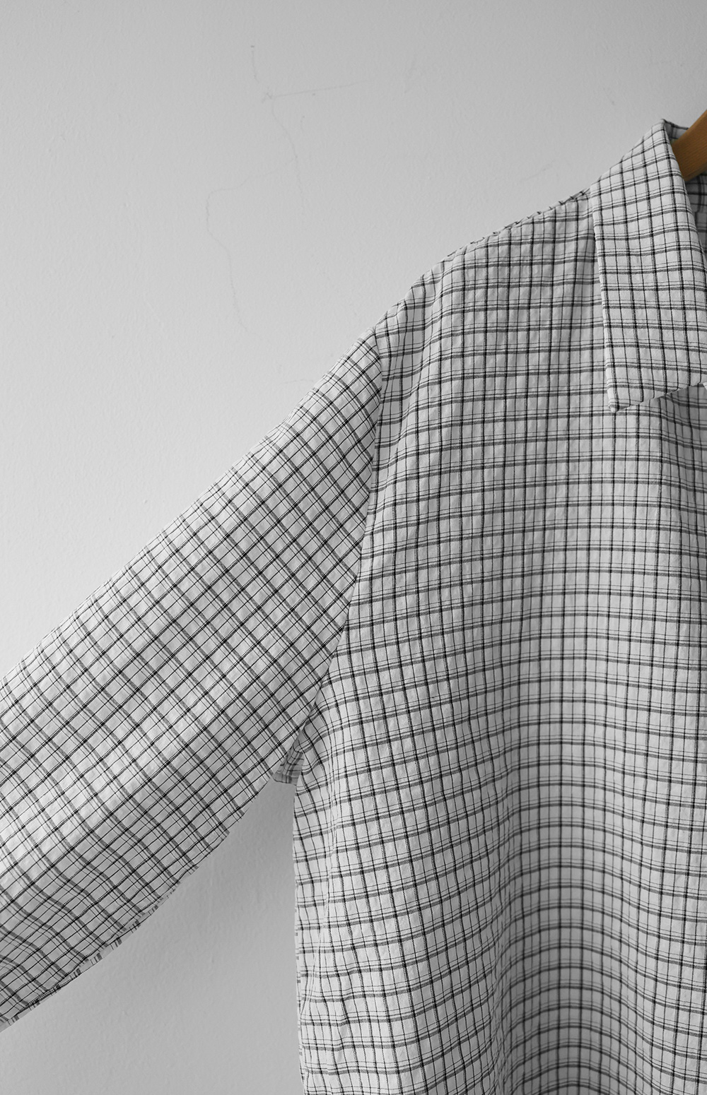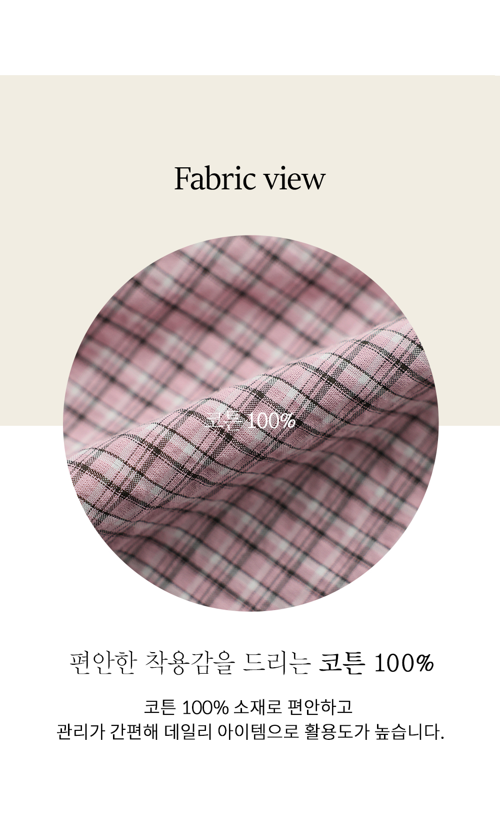 A:얇은 코튼 소재 특유의 내추럴한 구김은 있지만, 체크 패턴 덕분에 구김이 크게 도드라져 보이지 않아요. 가볍게 털어 말려주시면 자연스러운 멋으로 즐기실 수 있어요.