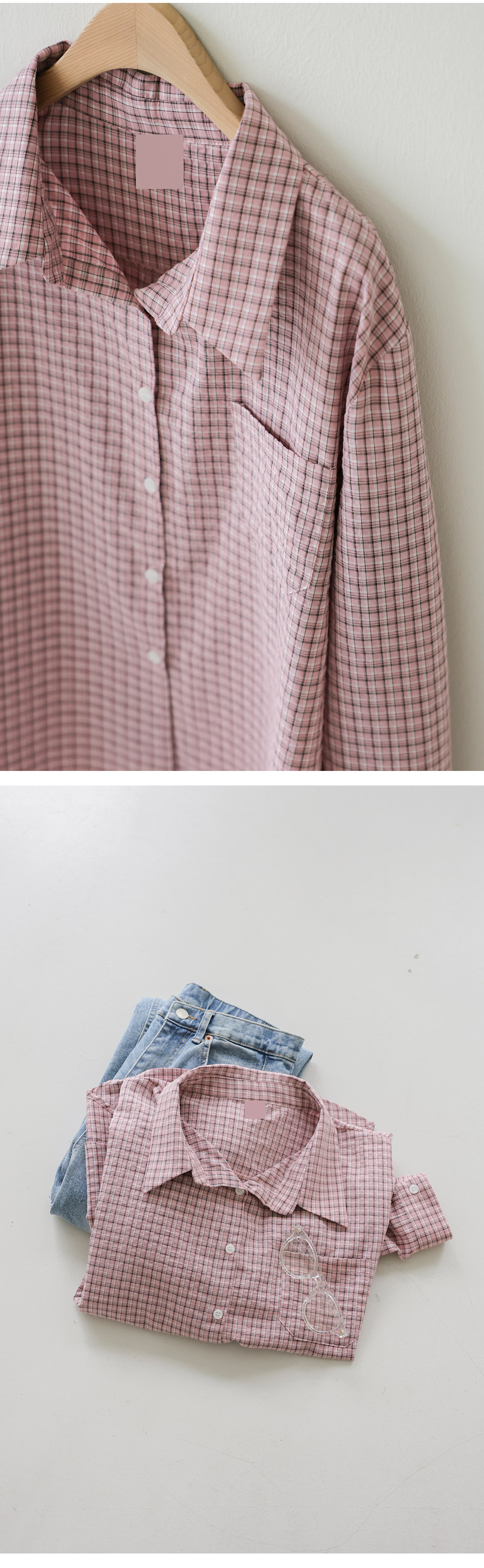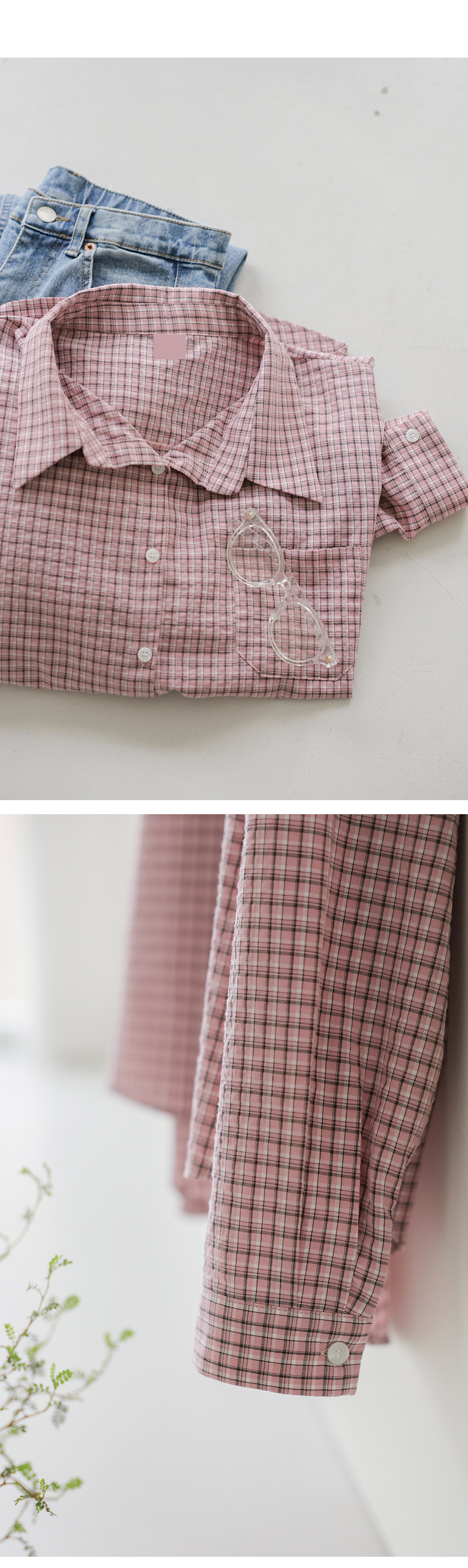 A:잔잔하고 섬세한 체크 패턴을 사용하여 오히려 시선을 분산시켜 줘요. 무지 셔츠보다 훨씬 슬림해 보이는 효과를 느끼실 수 있답니다.