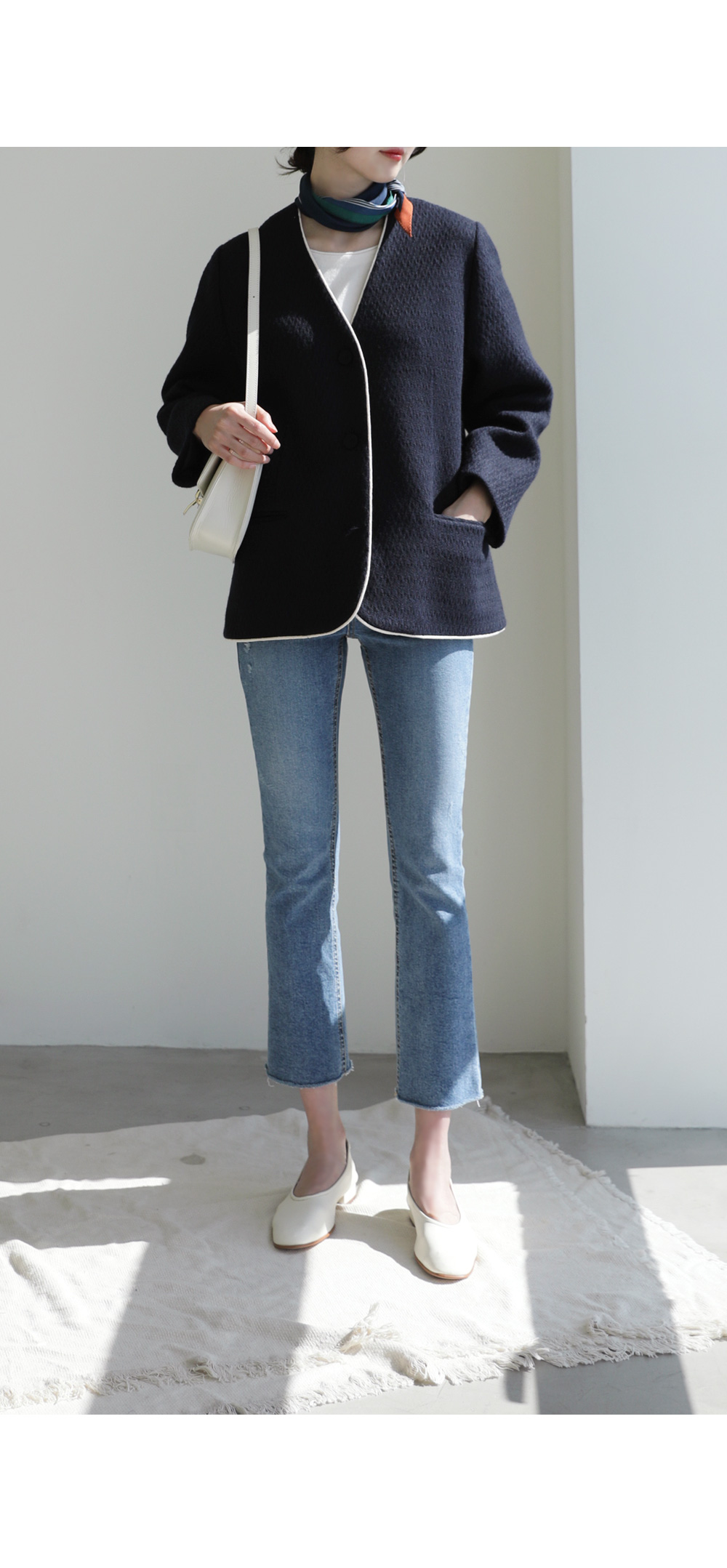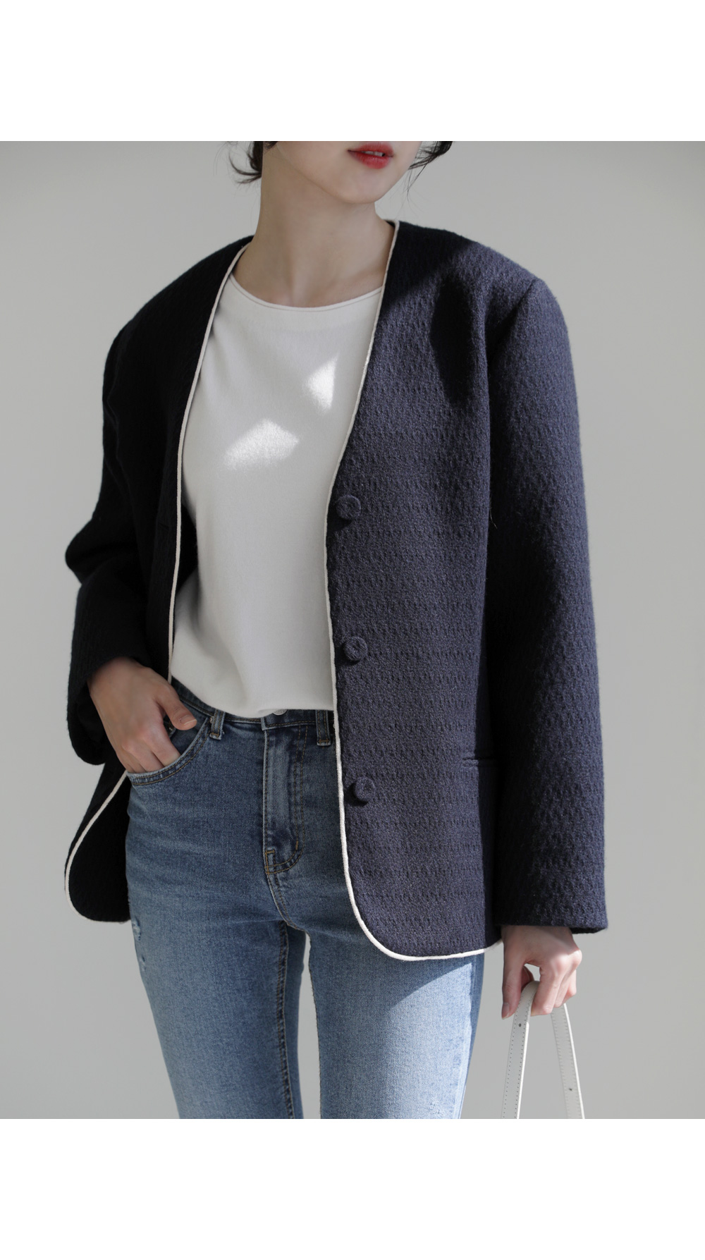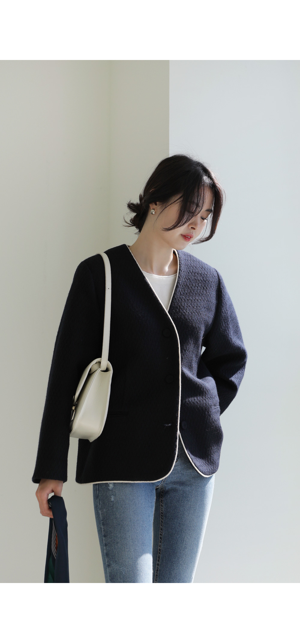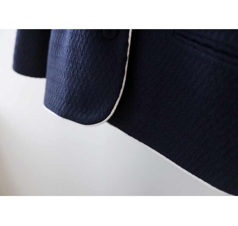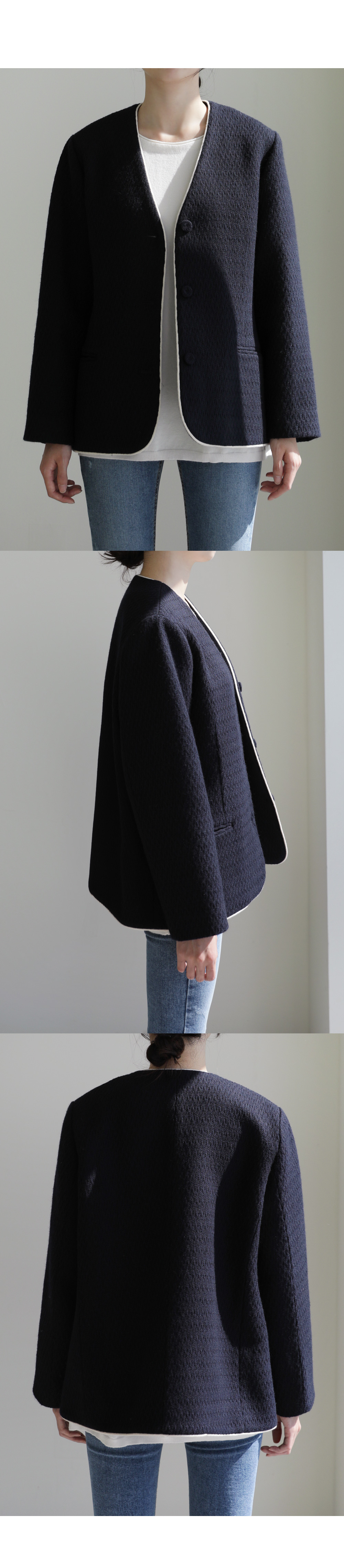 카젤로 자켓 고급스러운 무드의 자켓 소개할게요.견고하고 톡톡한 울 혼방 소재로 제작 되어 따뜻하게 착용해보실 수 있는 자켓이에요. 자연스럽게 어디에든 툭 걸쳐입기 좋은 노카라 디자인으로 깔끔하게 즐겨보실 수 있으며, 마감부분 라인 디테일로 멋스러우면서도 포인트 있게 착용되었어요. 힙을 반정도 가려주는 길이감과 여유있는 실루엣으로 안정감 있고 귀여운 무드를 더해주었으며, 군더더기 없이 깔끔한 라인으로 다양한 하의와 자유롭게 착용가능해요. 멋스러운 데일리 룩으로 즐겨보세요 :) 정 사이즈로 제작 되었어요.