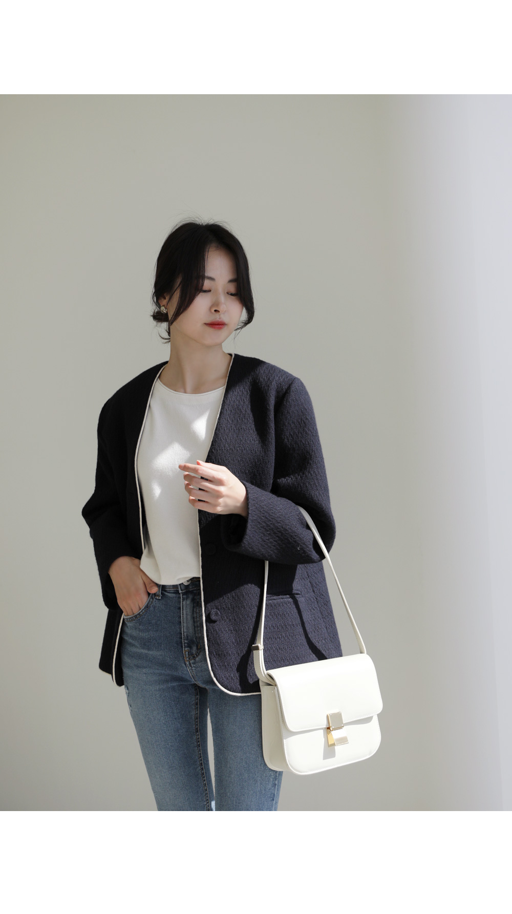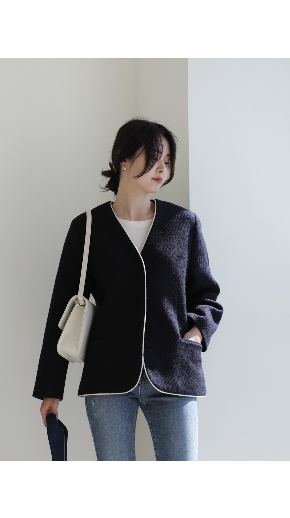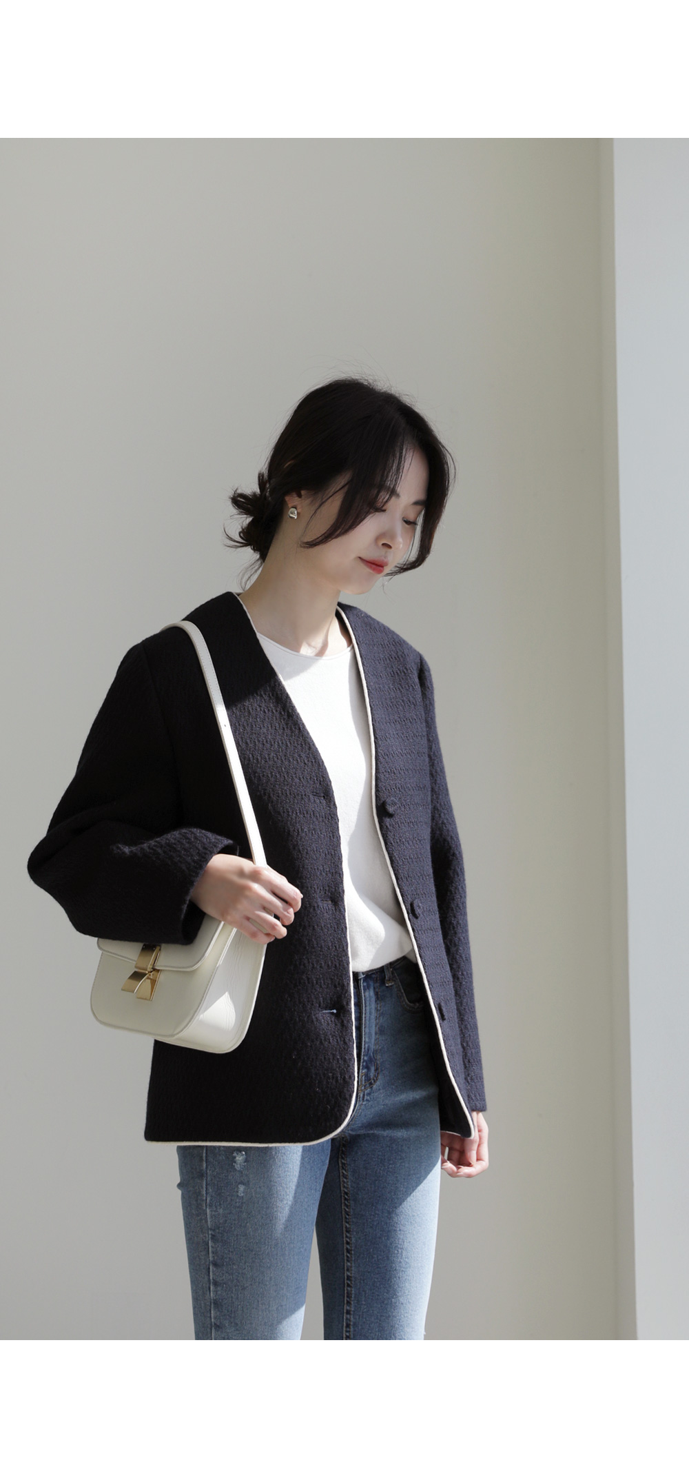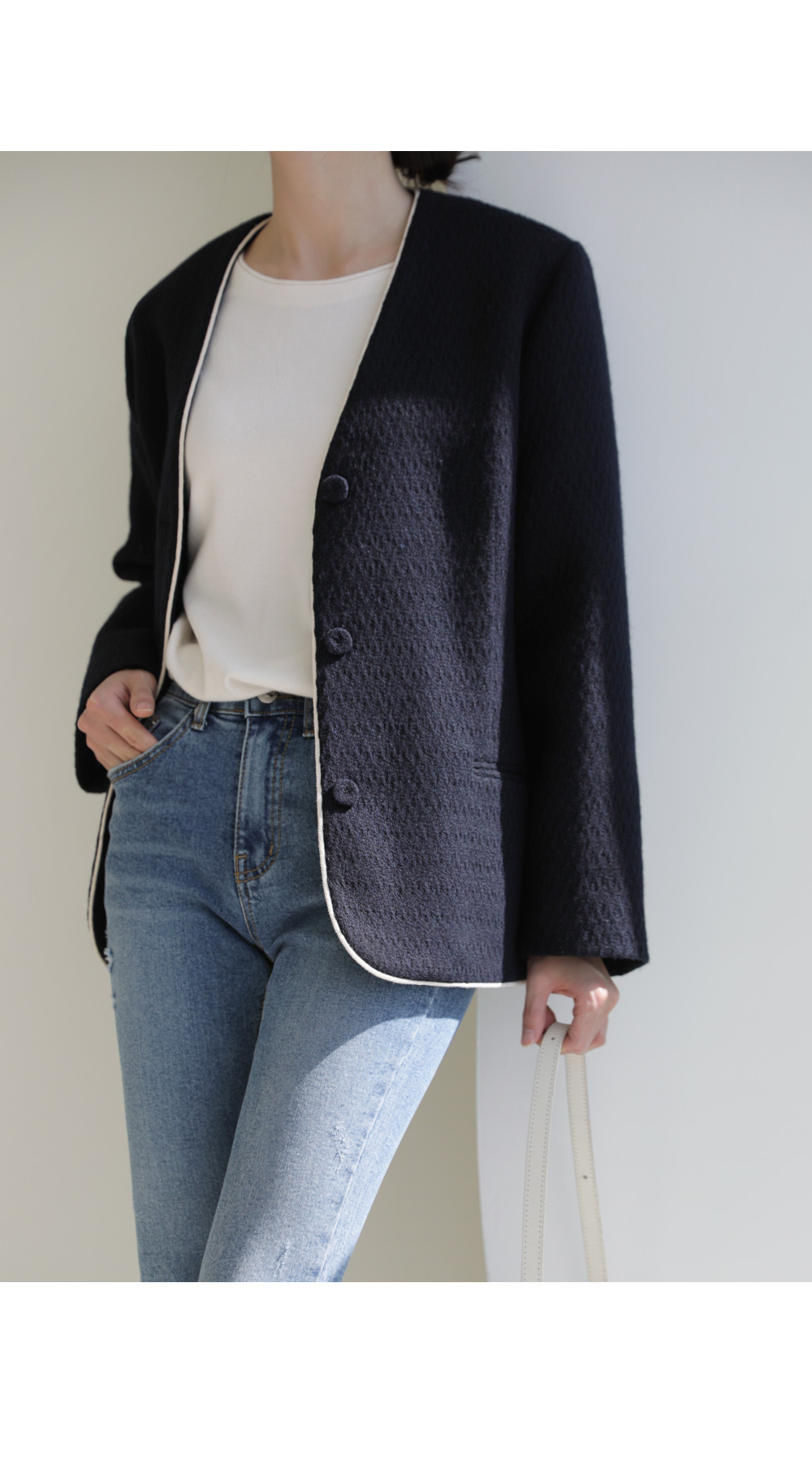 카젤로 자켓 고급스러운 무드의 자켓 소개할게요.견고하고 톡톡한 울 혼방 소재로 제작 되어 따뜻하게 착용해보실 수 있는 자켓이에요. 자연스럽게 어디에든 툭 걸쳐입기 좋은 노카라 디자인으로 깔끔하게 즐겨보실 수 있으며, 마감부분 라인 디테일로 멋스러우면서도 포인트 있게 착용되었어요. 힙을 반정도 가려주는 길이감과 여유있는 실루엣으로 안정감 있고 귀여운 무드를 더해주었으며, 군더더기 없이 깔끔한 라인으로 다양한 하의와 자유롭게 착용가능해요. 멋스러운 데일리 룩으로 즐겨보세요 :) 정 사이즈로 제작 되었어요.