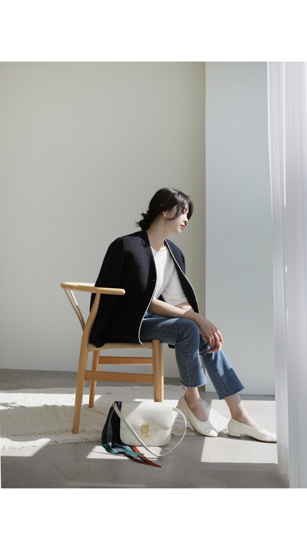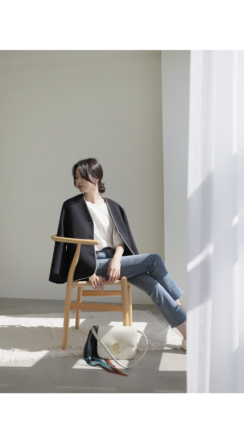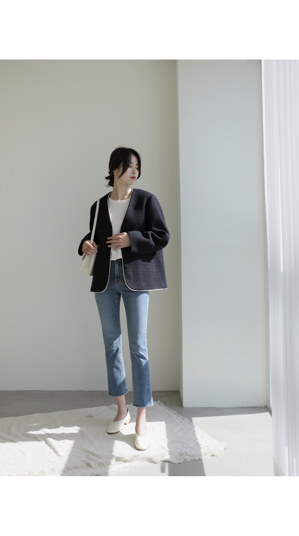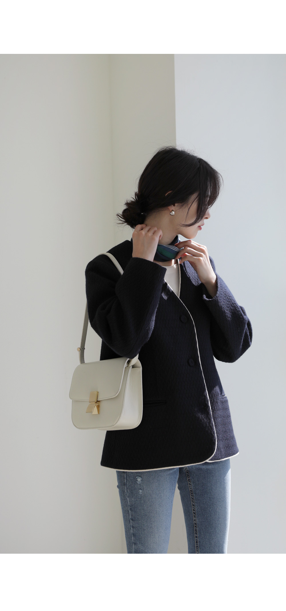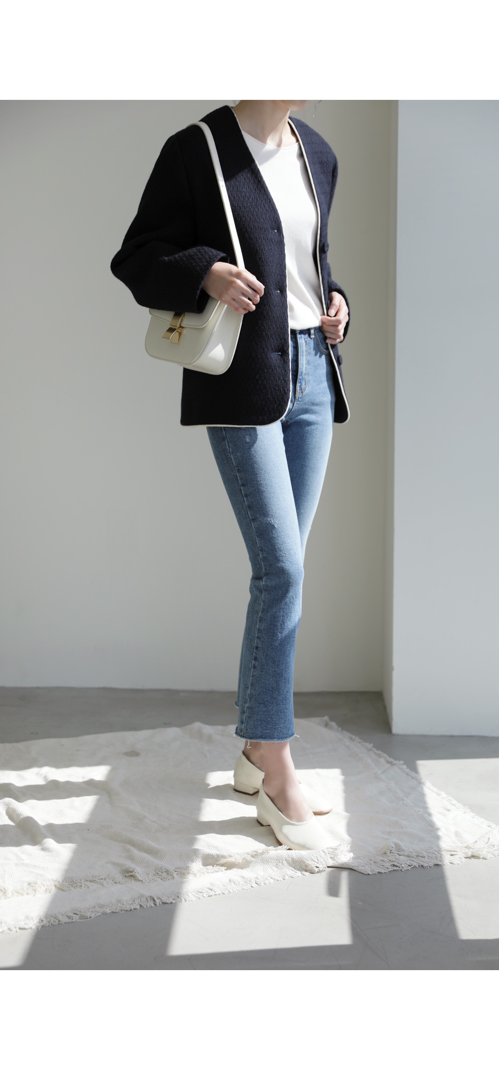 카젤로 자켓 고급스러운 무드의 자켓 소개할게요.견고하고 톡톡한 울 혼방 소재로 제작 되어 따뜻하게 착용해보실 수 있는 자켓이에요. 자연스럽게 어디에든 툭 걸쳐입기 좋은 노카라 디자인으로 깔끔하게 즐겨보실 수 있으며, 마감부분 라인 디테일로 멋스러우면서도 포인트 있게 착용되었어요. 힙을 반정도 가려주는 길이감과 여유있는 실루엣으로 안정감 있고 귀여운 무드를 더해주었으며, 군더더기 없이 깔끔한 라인으로 다양한 하의와 자유롭게 착용가능해요. 멋스러운 데일리 룩으로 즐겨보세요 :) 정 사이즈로 제작 되었어요.