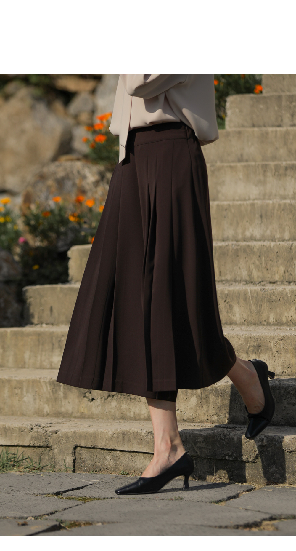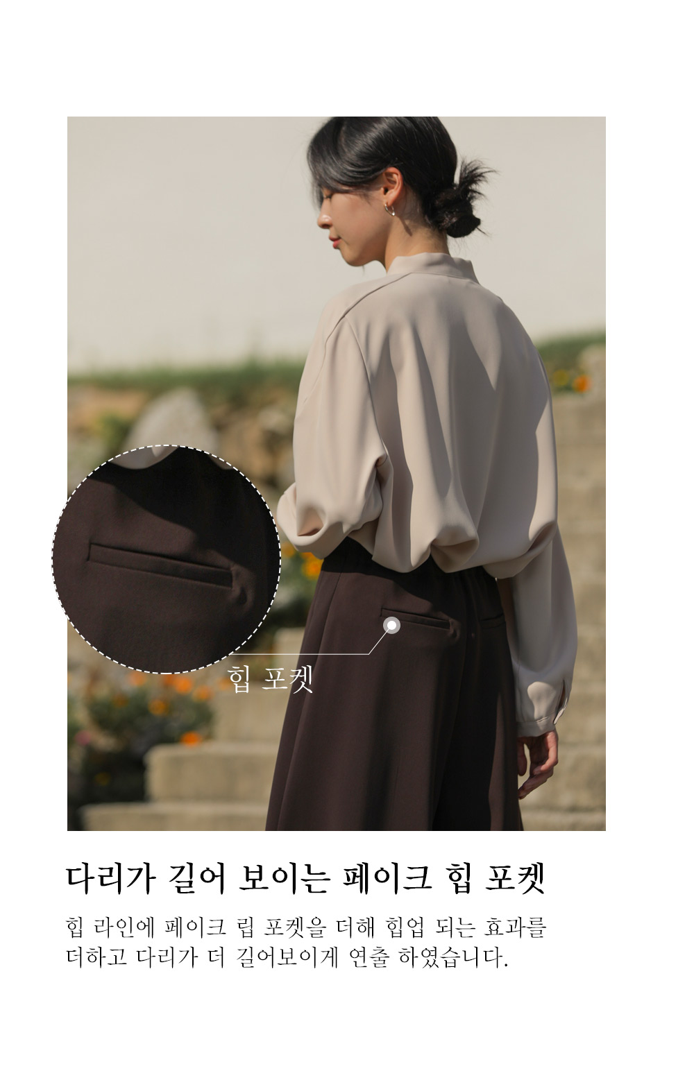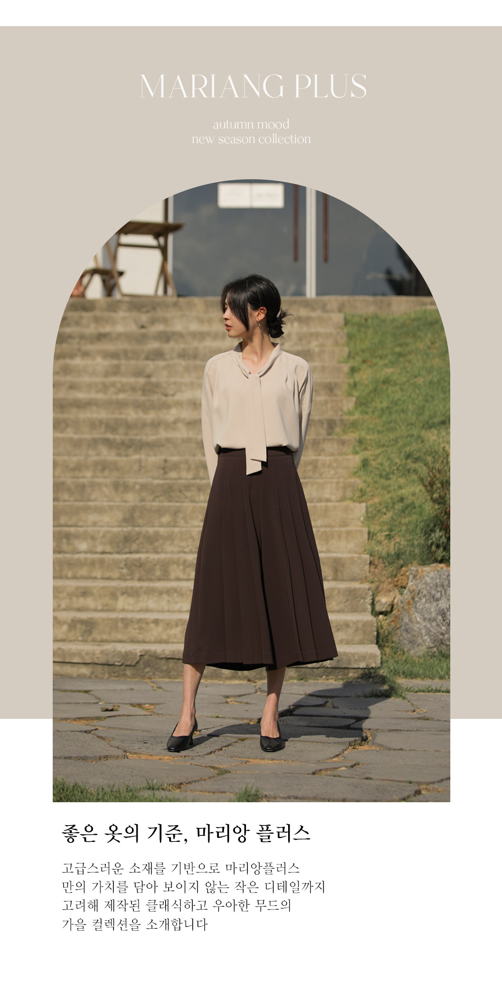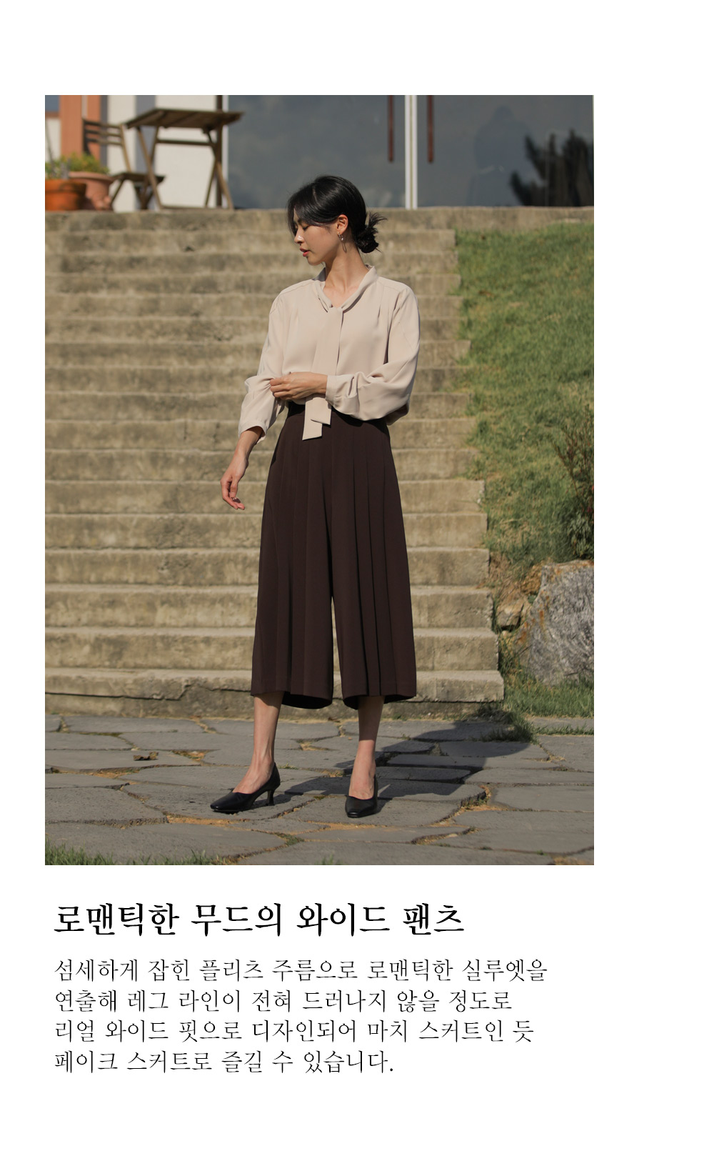 유로크 주름 치마바지 마리앙 플러스에서만 만나볼 수 있는 포멀함과 페미닌한 무드를모두 느낄 수 있는 하이 퀄리티의 치마바지입니다. 스판이 함유된 폴리 소재로 제작되어 답답함이 없이 착용되며 와이드한 핏으로 더욱 편안한 팬츠입니다. 유연한 소재감이 주는 포멀한 무드로 슬랙스인 듯 스커트인 듯 웨어러블한 연출이 가능한 아이템이에요. 플리츠 주름으로 단정하게 정돈된 실루엣으로 체형을 커버하며 로맨틱한 감성까지 더했으며, 부츠와 함께 트랜디한 스타일링이 가능한 길이감으로 섬세하게 디자인되었습니다. 뒷밴딩으로 편안하고 실루엣에 방해가 없도록 제작되었고, 힙 라인의 페이크 립 포켓을 더해 힙업 효과까지 더해드렸습니다. 한 쪽 사이드 지퍼 디테일로 인해 포켓은 한 쪽에 히든으로 더해 균형감을 해치지 않고 실용성을 놓치지 않았습니다. 완성도 높은 스티치 작업으로 마무리하여 옷 태부터 다른 하이 퀄리티 아이템으로 완성했습니다. 정 사이즈로 추천드립니다. 모델정보 키 167cm / 상의 55 / 하의 26(S) / 신발 240mm코디정보 미샬리 타이 블라우스 _ 베이지 유로크 주름 치마바지 _ 브라운